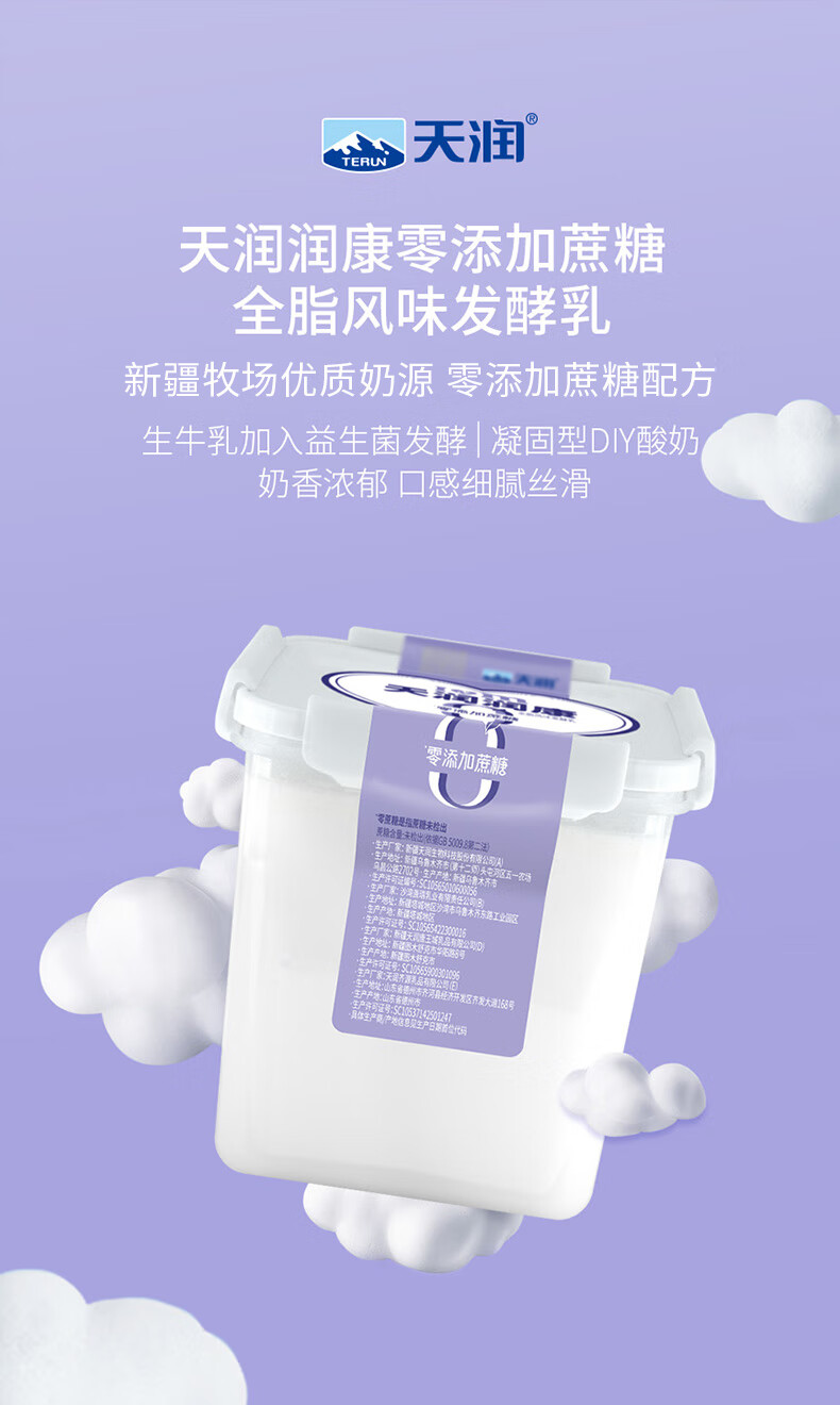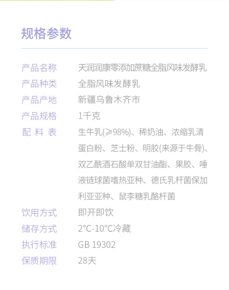 天润 新疆0添加糖0代糖无糖风味发酵乳低温酸奶 家庭装桶酸 1kg*1桶