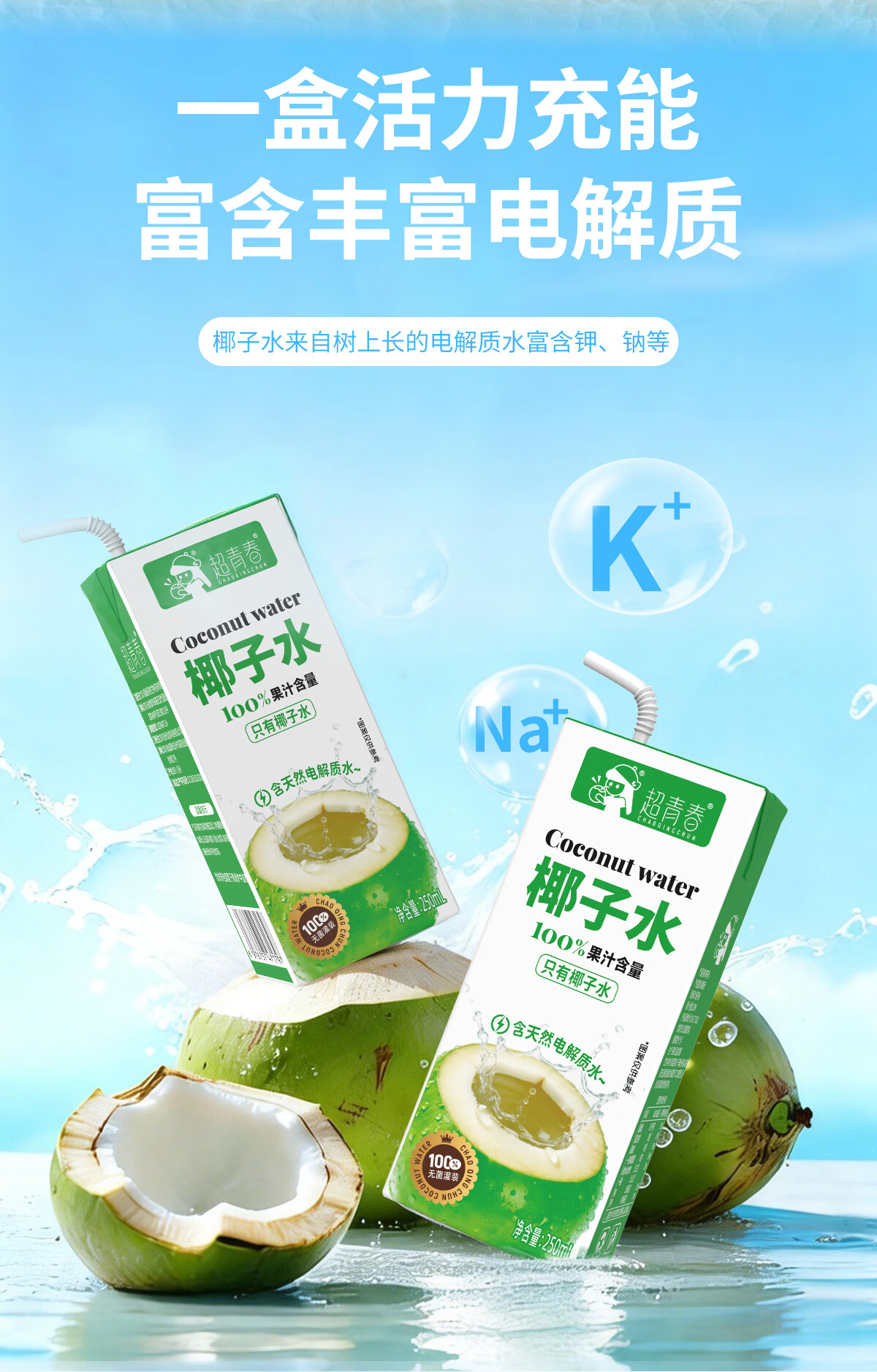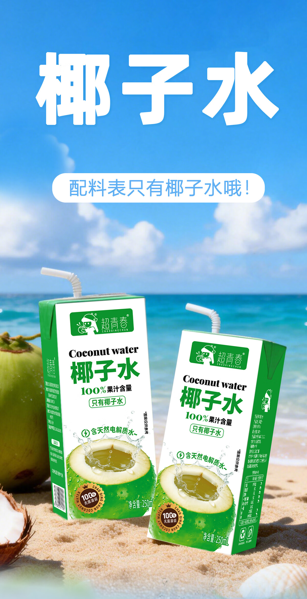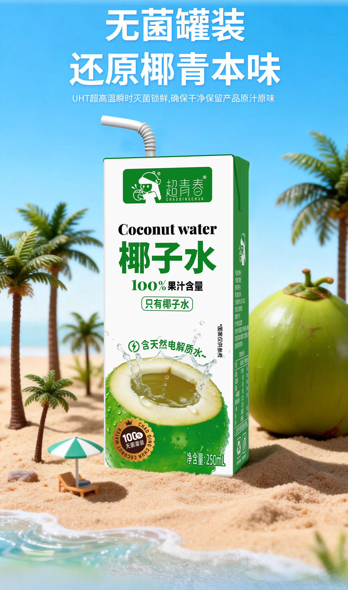 超青春果汁椰子水天然电解质整箱饮料 椰子水250ml*10盒x1箱