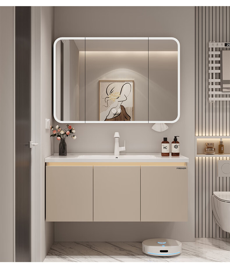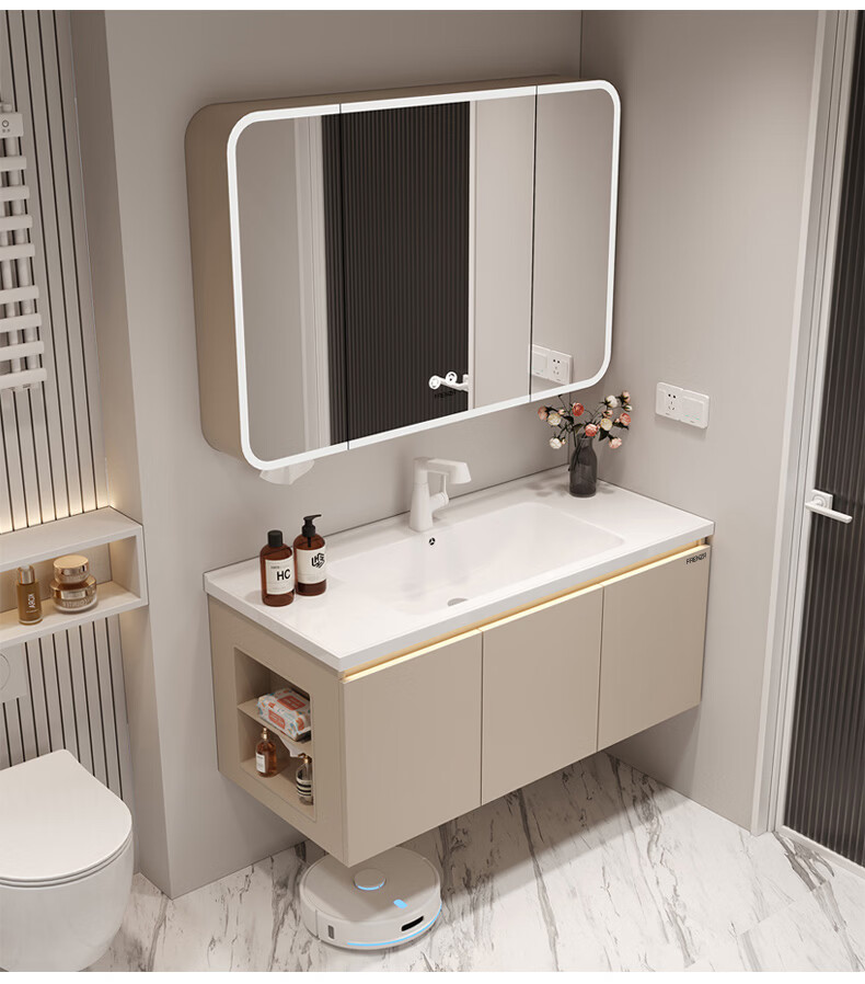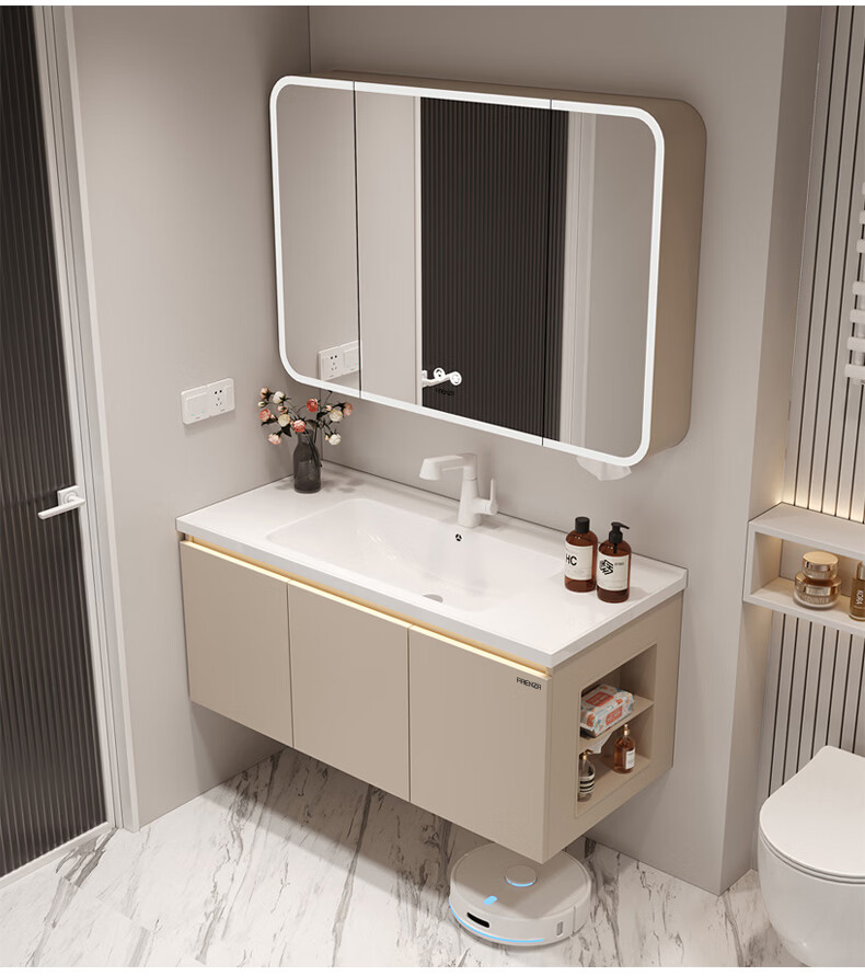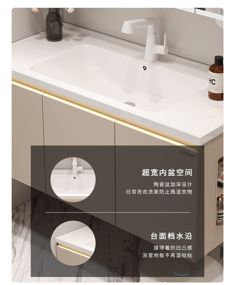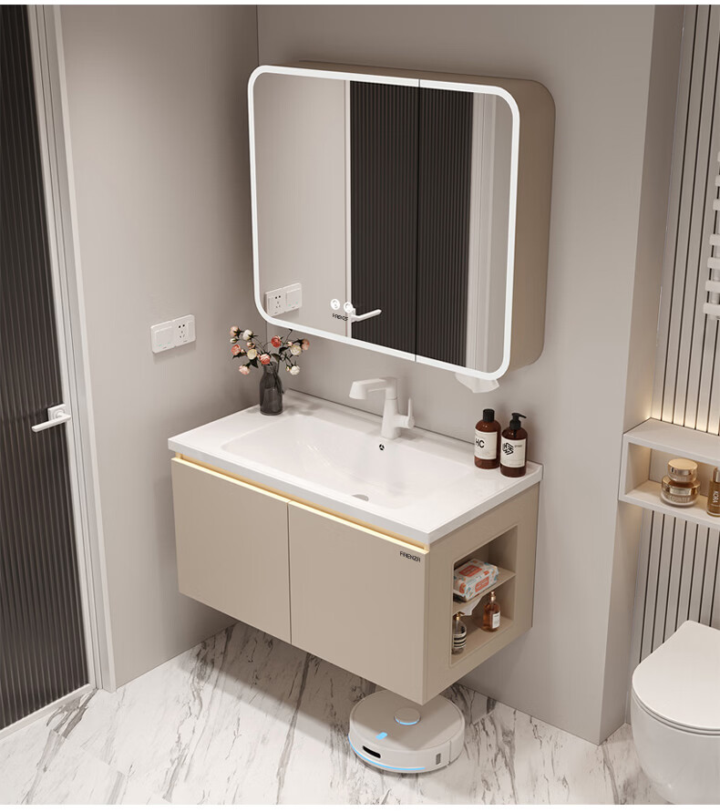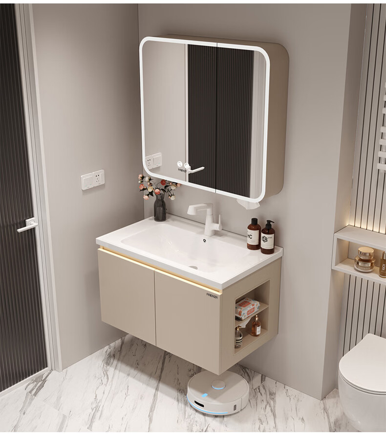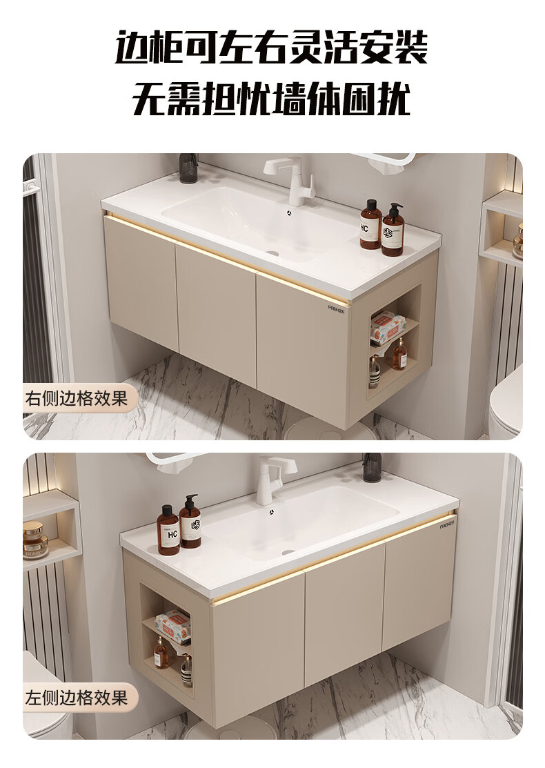 法恩莎奶油风浴室柜带侧边格陶瓷一体盆蜂窝铝卫生间洗手洗脸盆柜洗漱台 60cm奶咖|美妆镜柜|右侧格