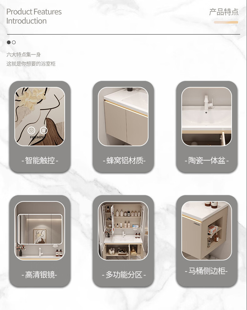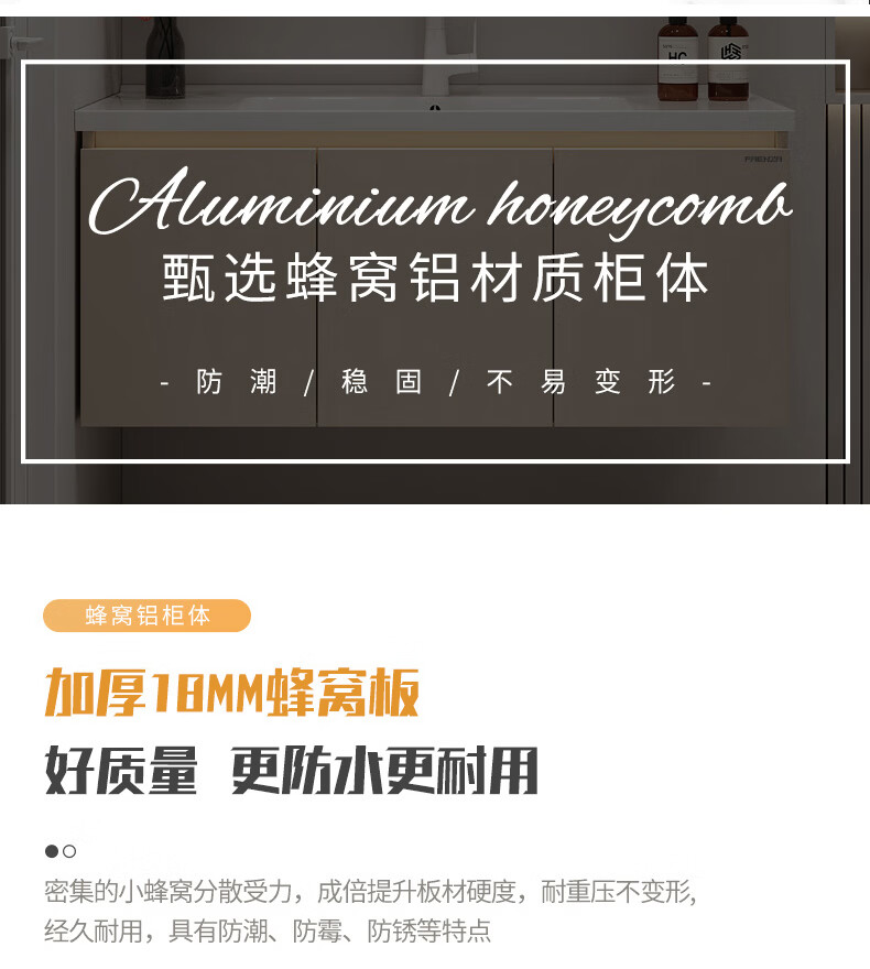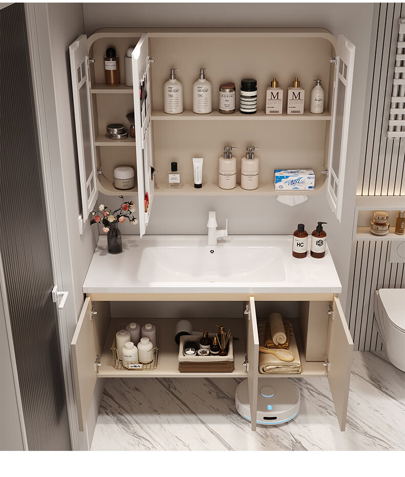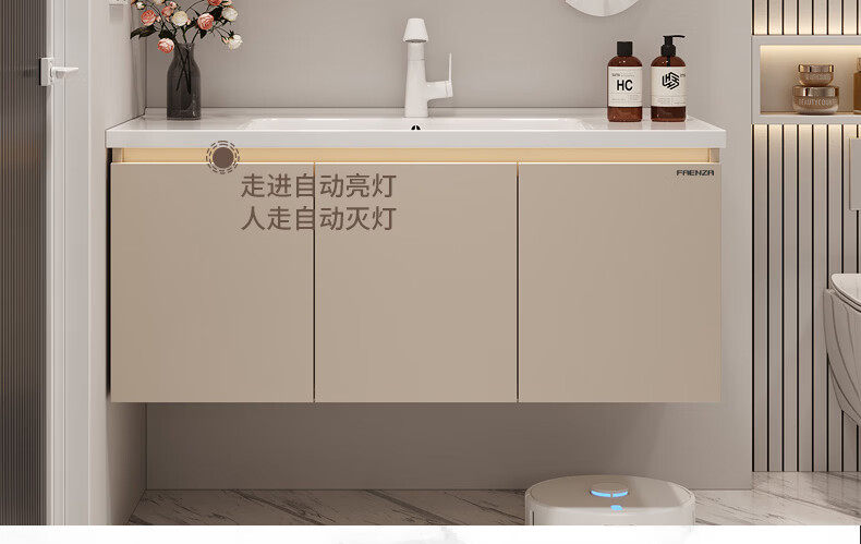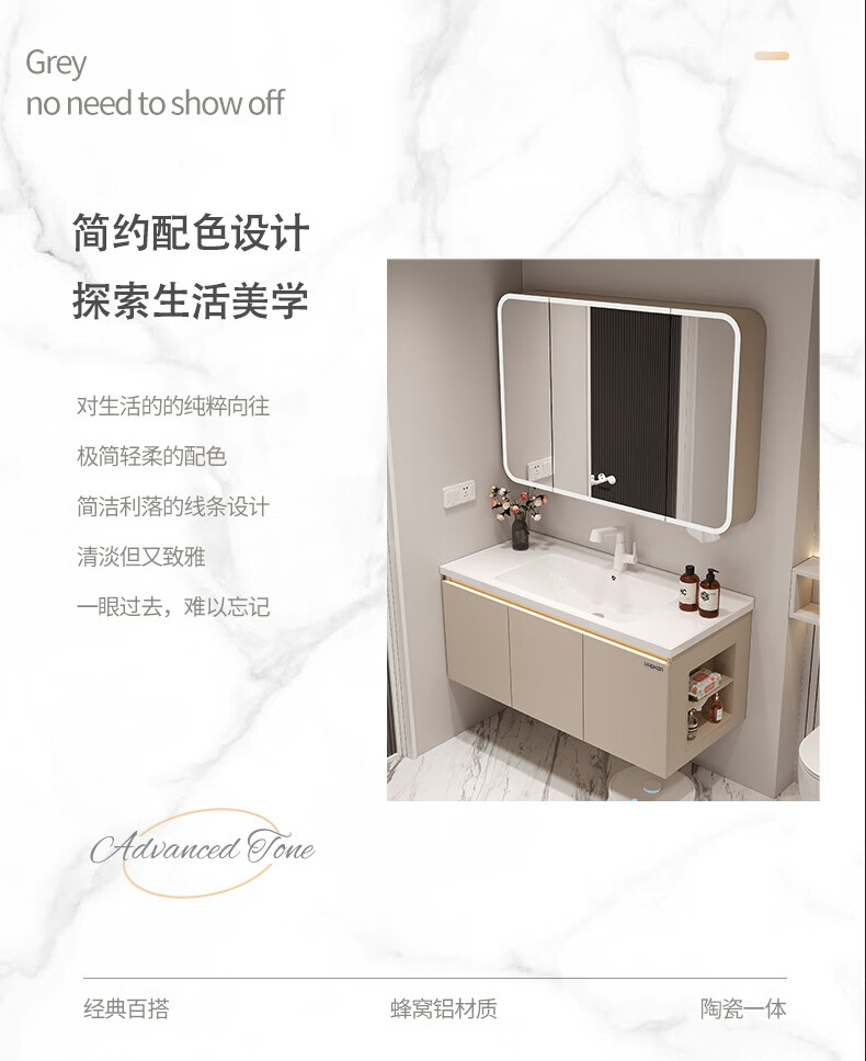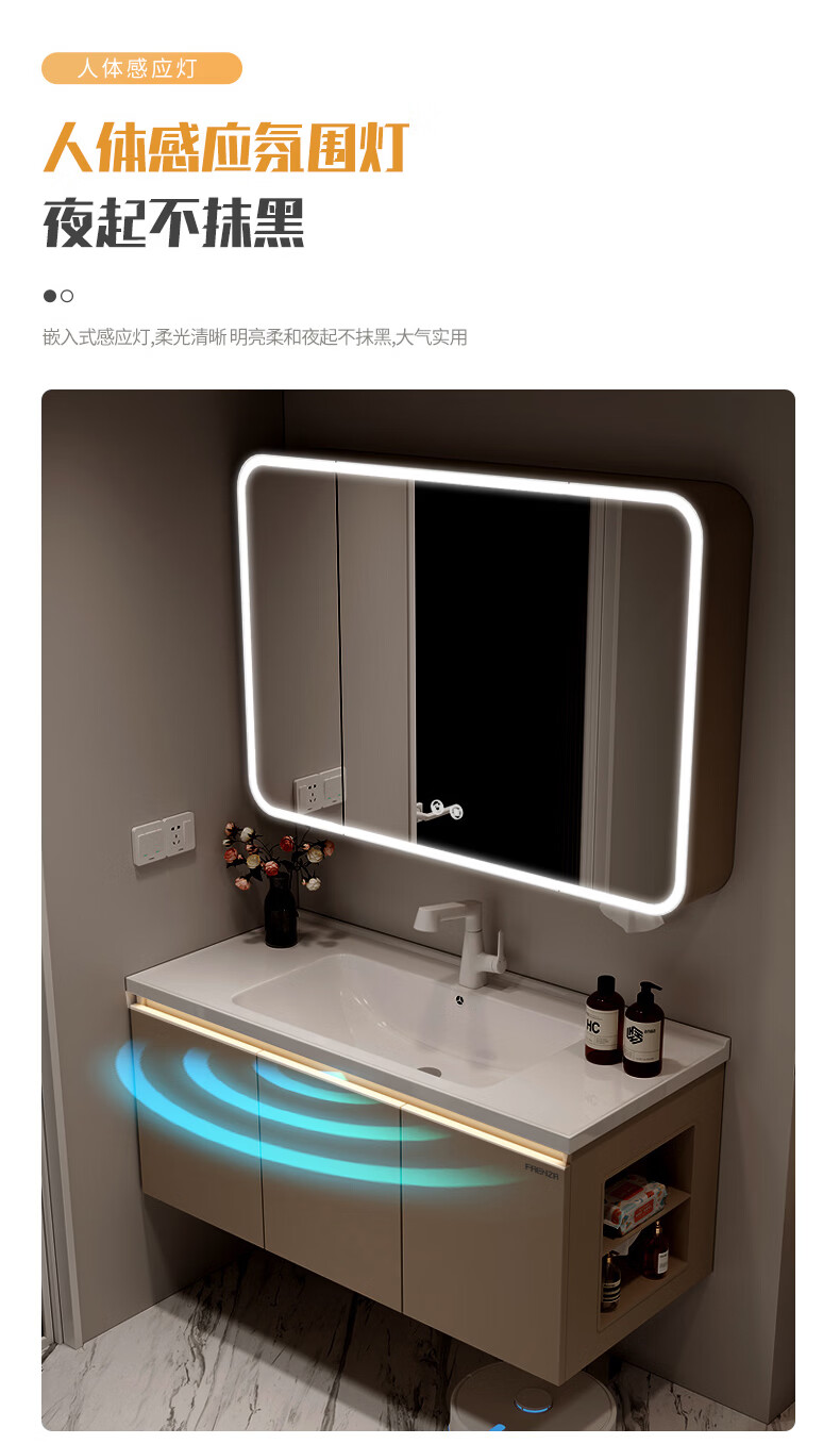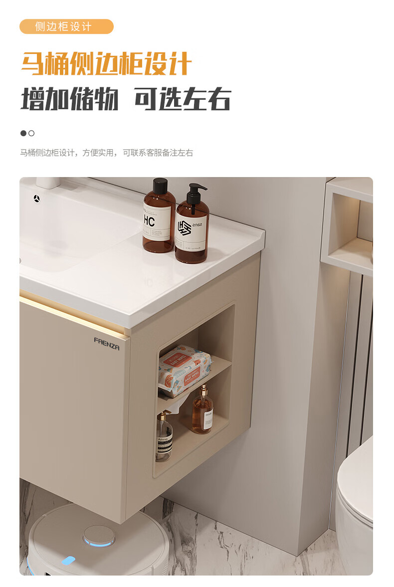 法恩莎奶油风浴室柜带侧边格陶瓷一体盆蜂窝铝卫生间洗手洗脸盆柜洗漱台 60cm奶咖|美妆镜柜|右侧格