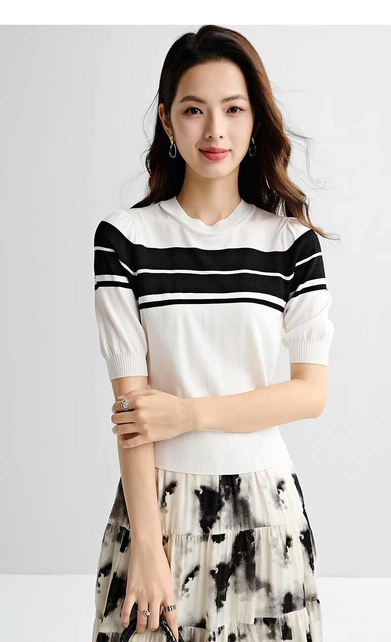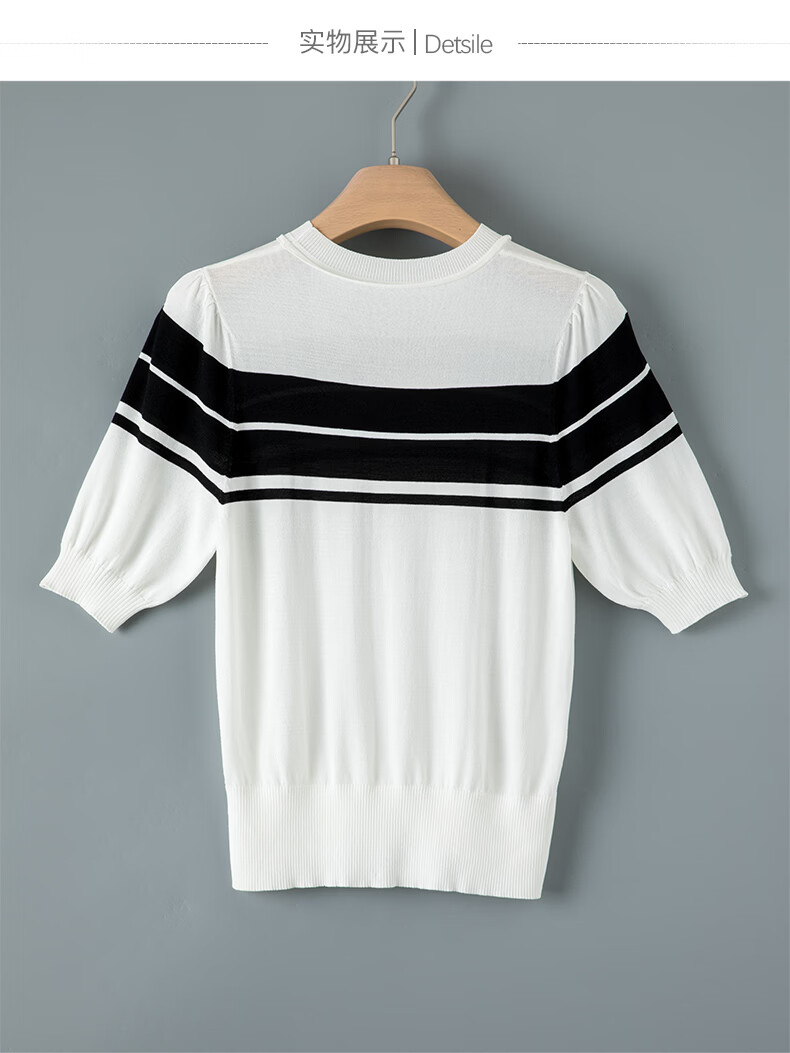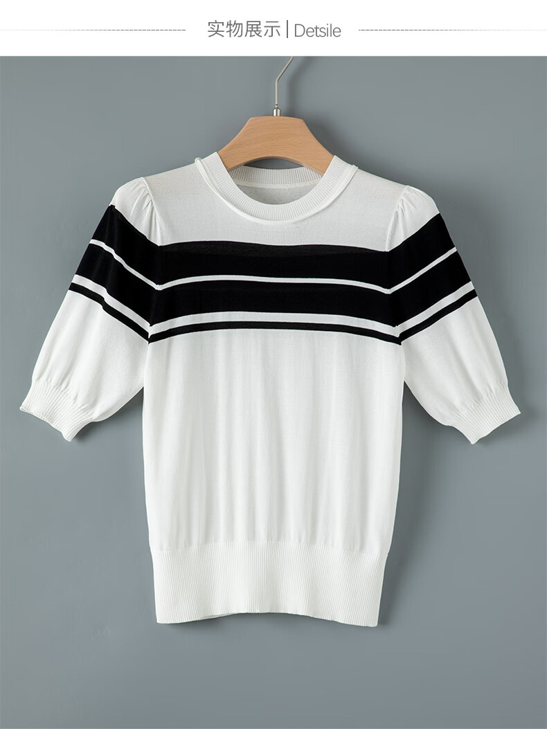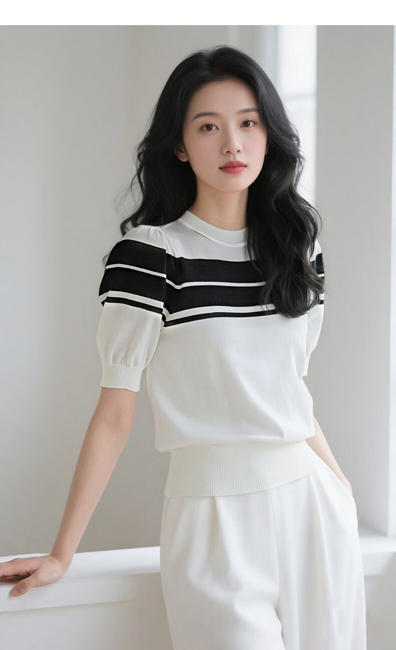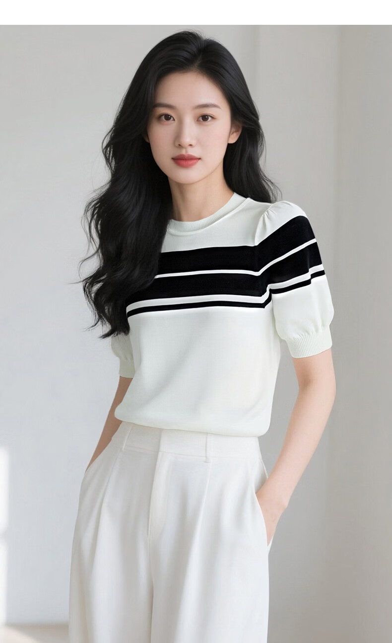 晚白2026年春夏款时尚条纹圆领短袖弹力舒适泡泡袖冰丝凉感针织T女 白色 S