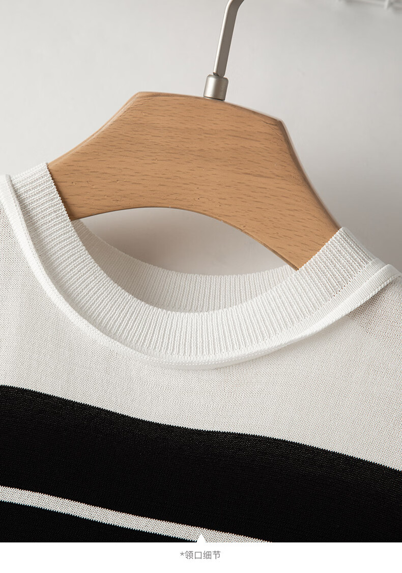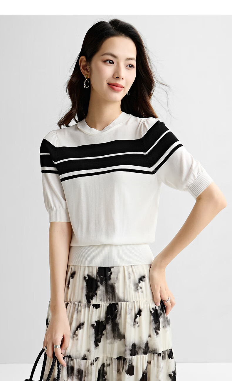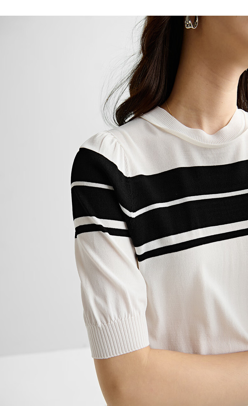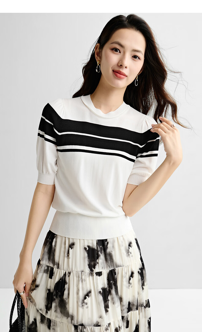 晚白2026年春夏款时尚条纹圆领短袖弹力舒适泡泡袖冰丝凉感针织T女 白色 S