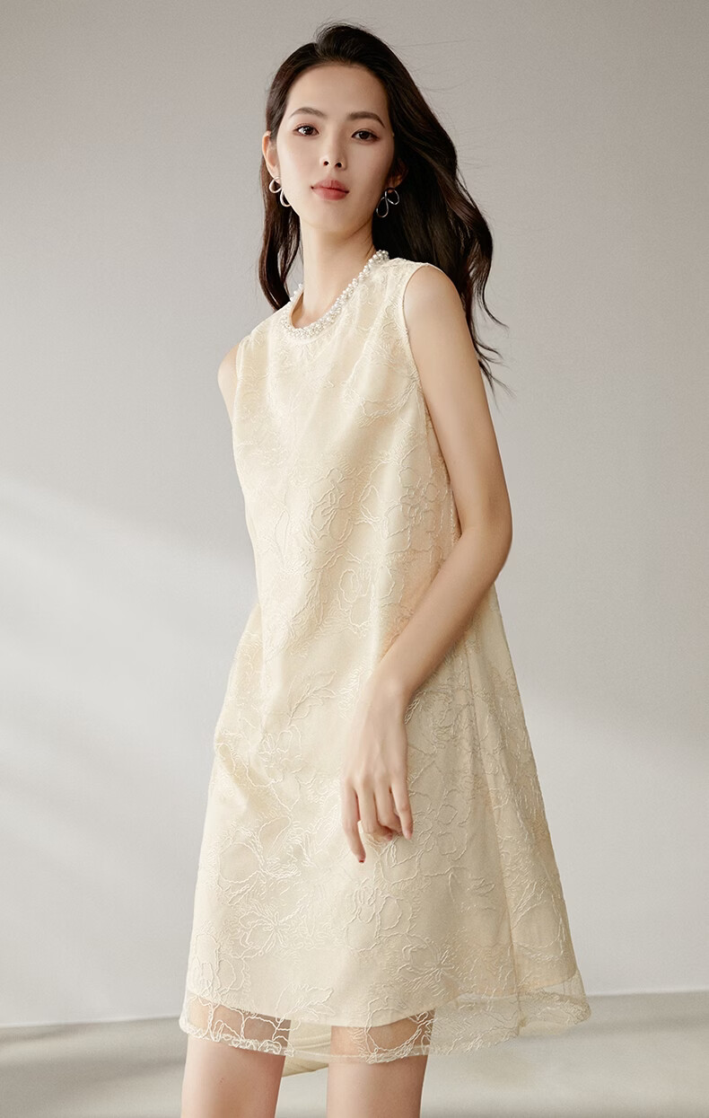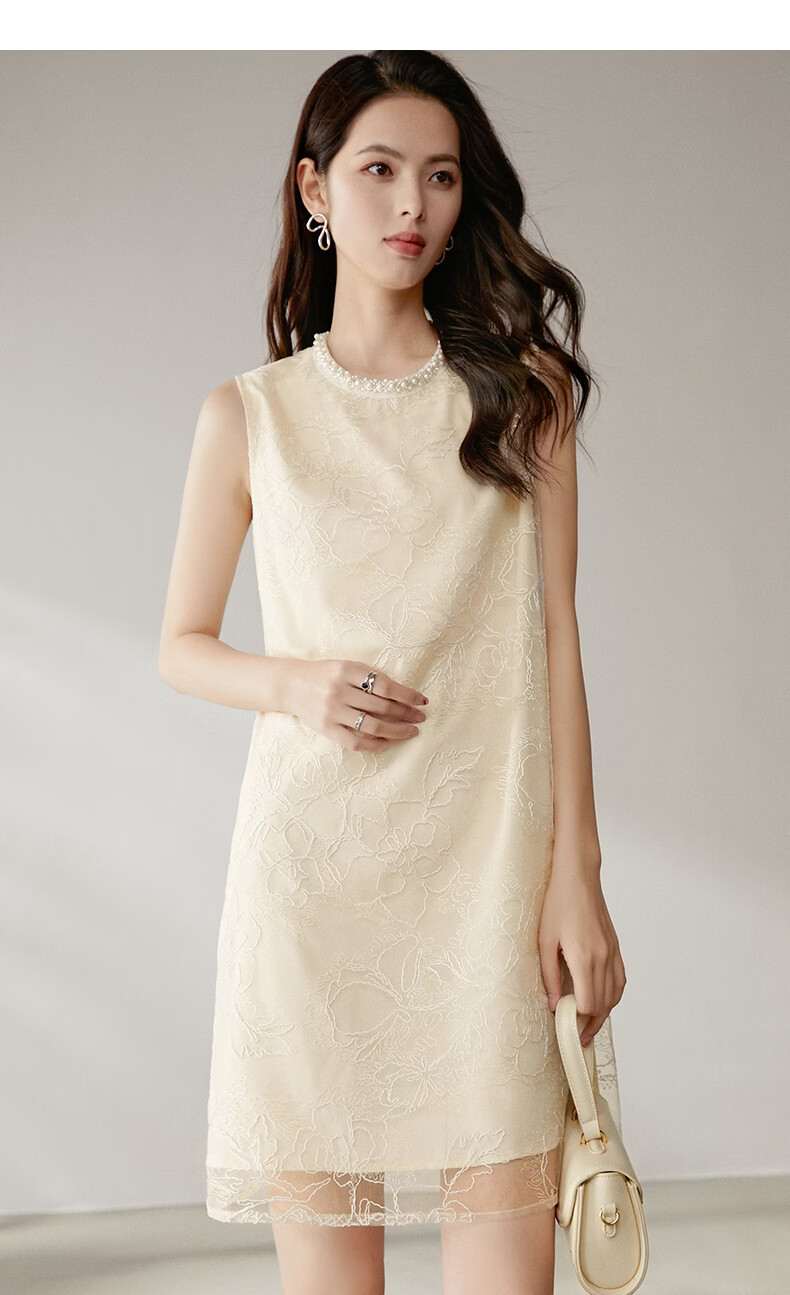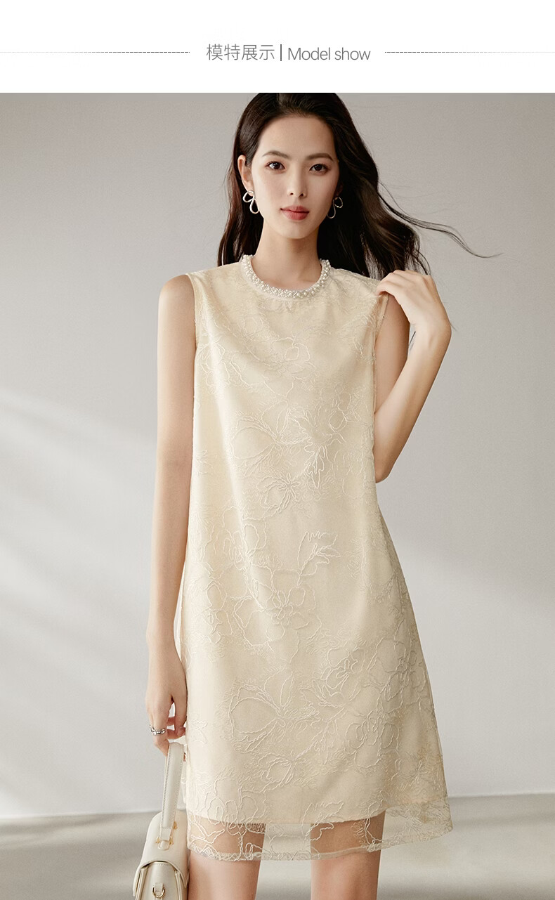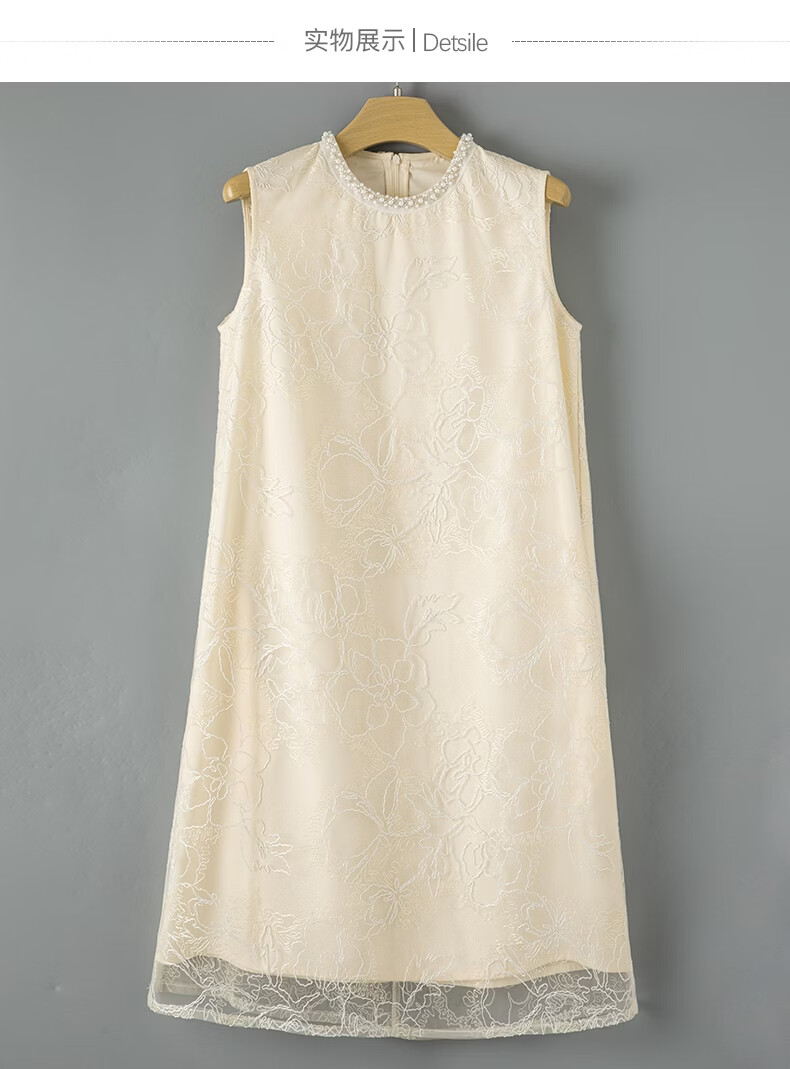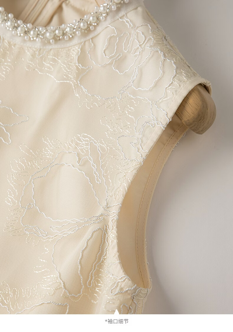 晚白2026年春夏款法式温柔珍珠圆领裙子提花刺绣小个子显瘦无袖连衣裙 杏色 S