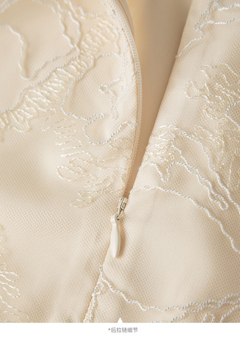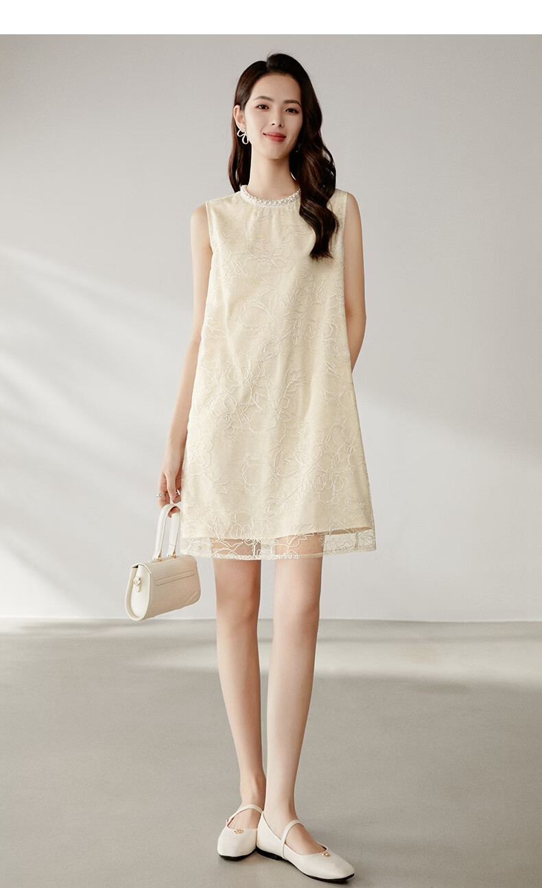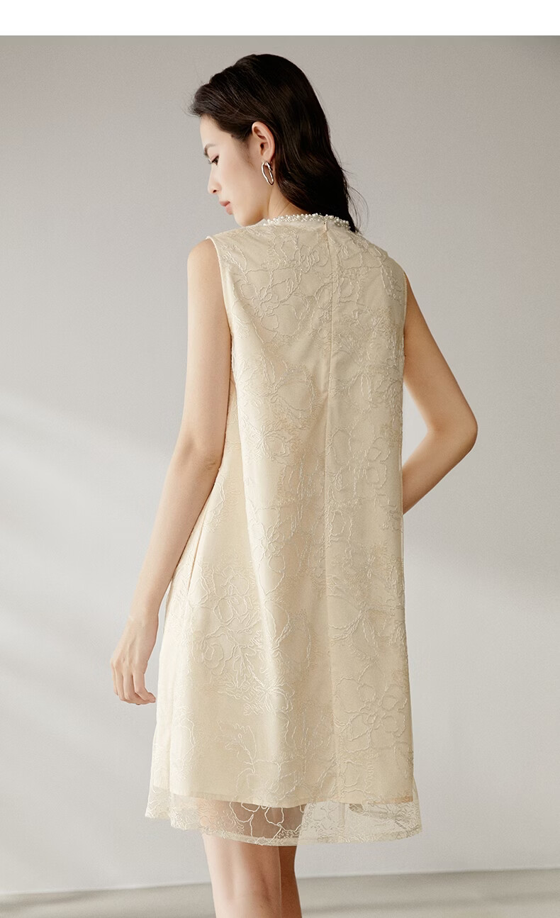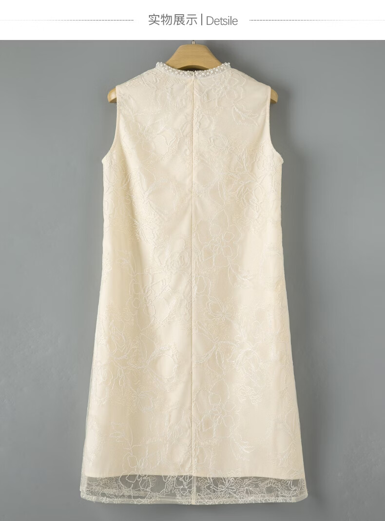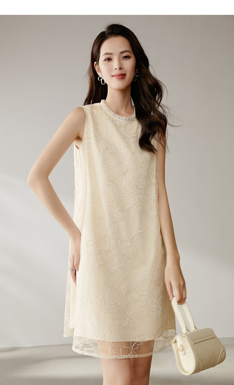 晚白2026年春夏款法式温柔珍珠圆领裙子提花刺绣小个子显瘦无袖连衣裙 杏色 S