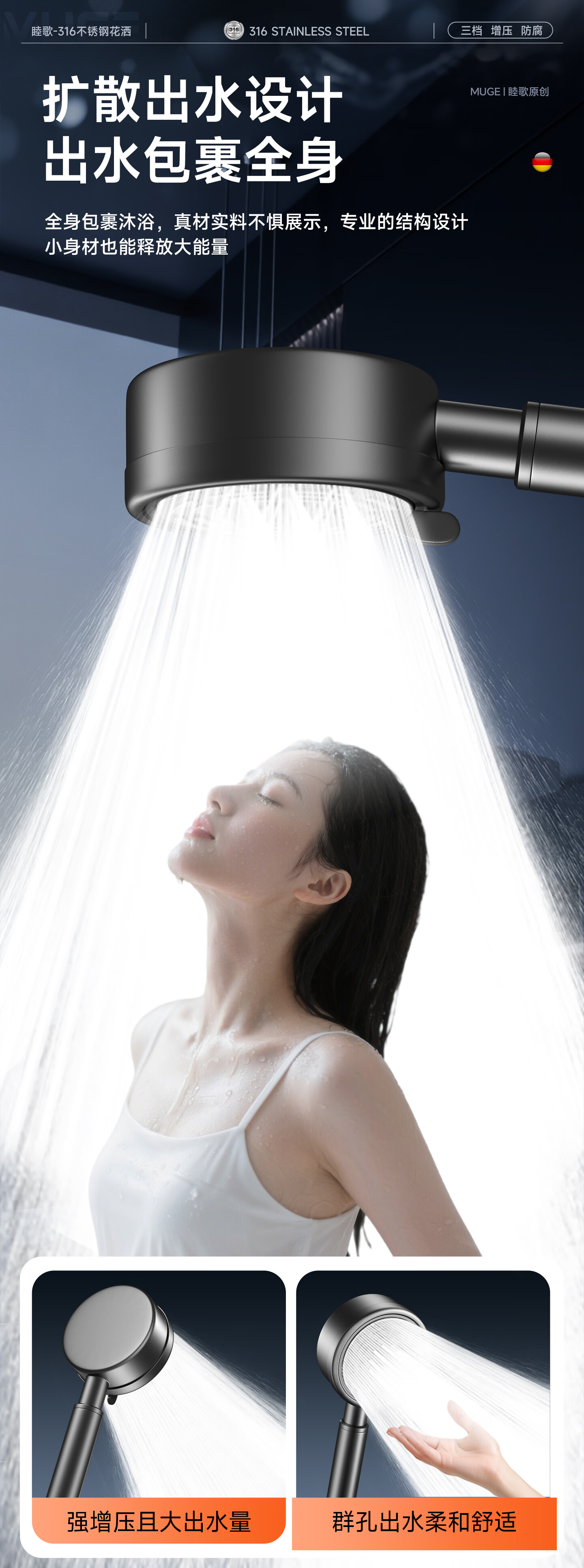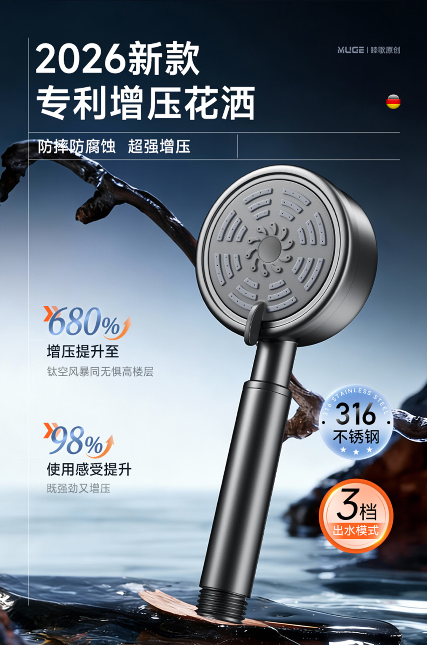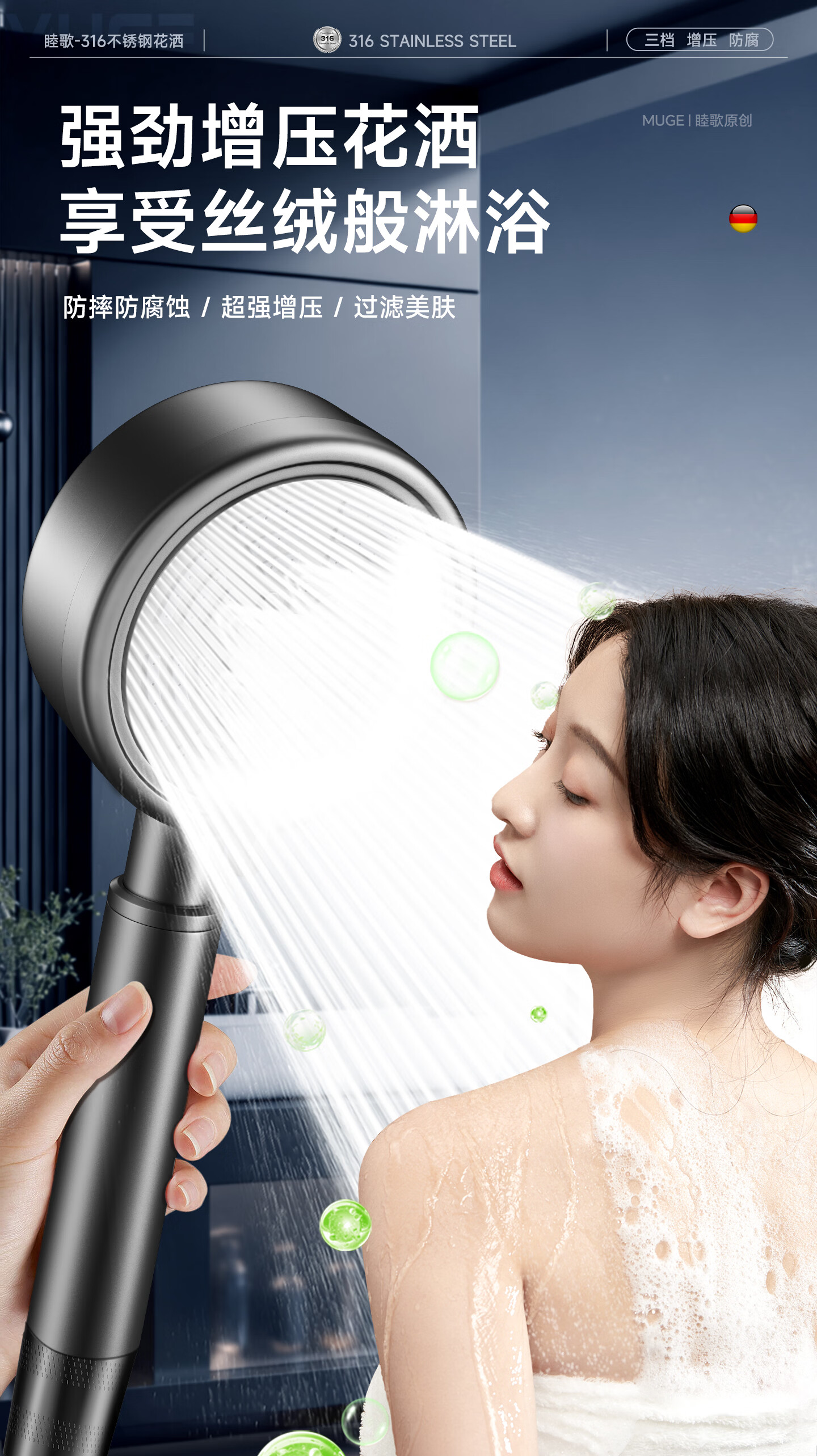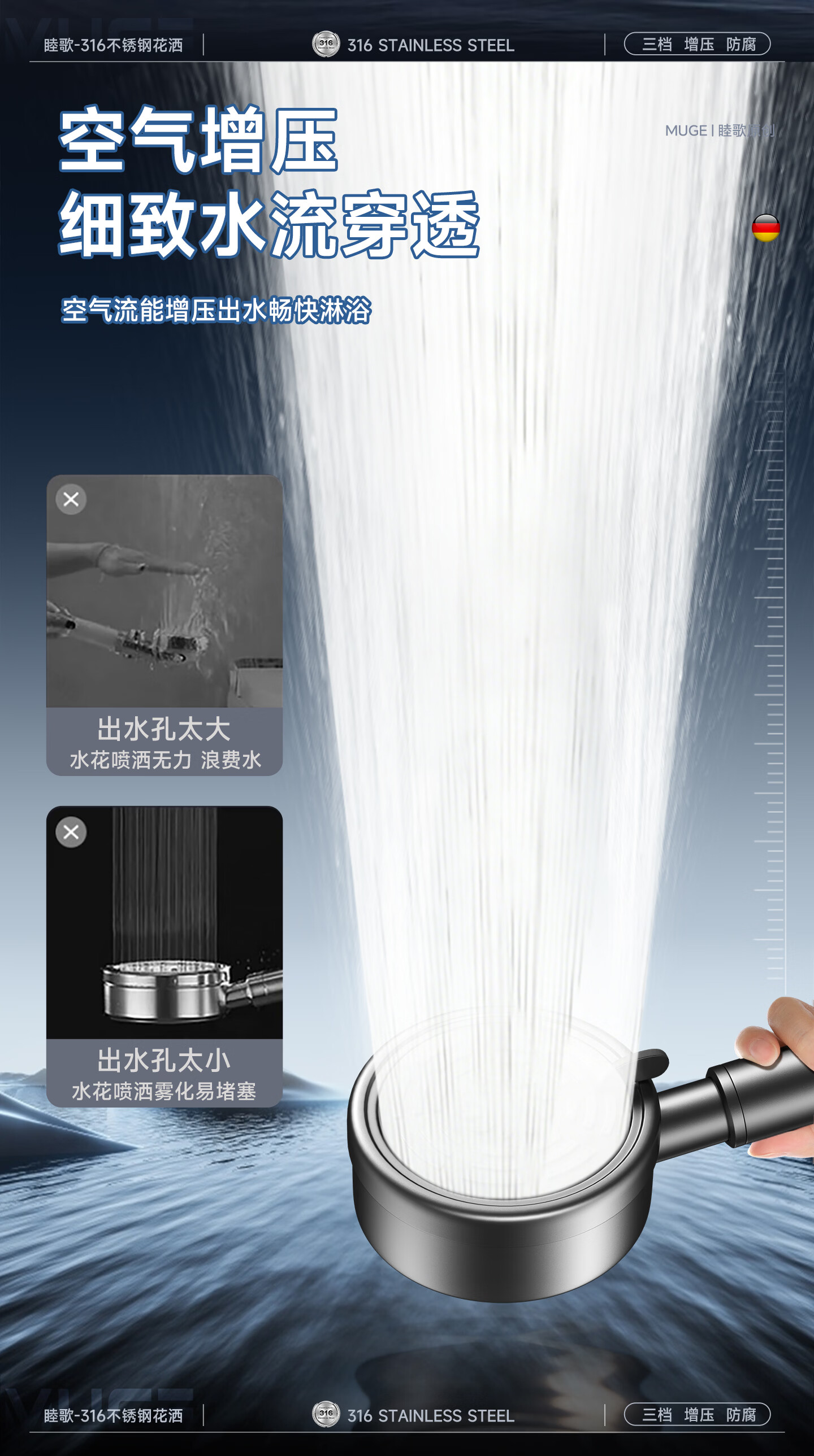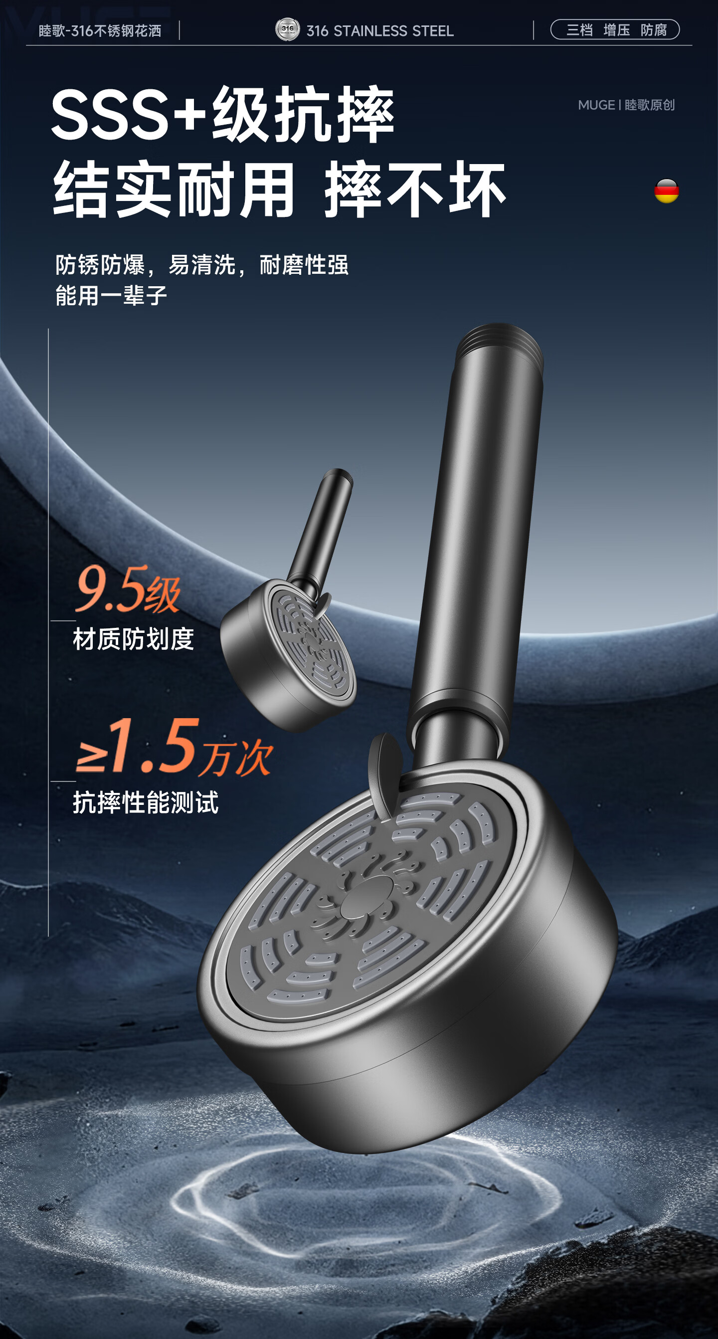 睦歌(MUGE)浴室增压花洒淋浴喷头超强高压大出水316不锈钢淋浴花洒头莲蓬头 加厚316不锈钢【亮银色】增压花洒+1.5米管+支架
