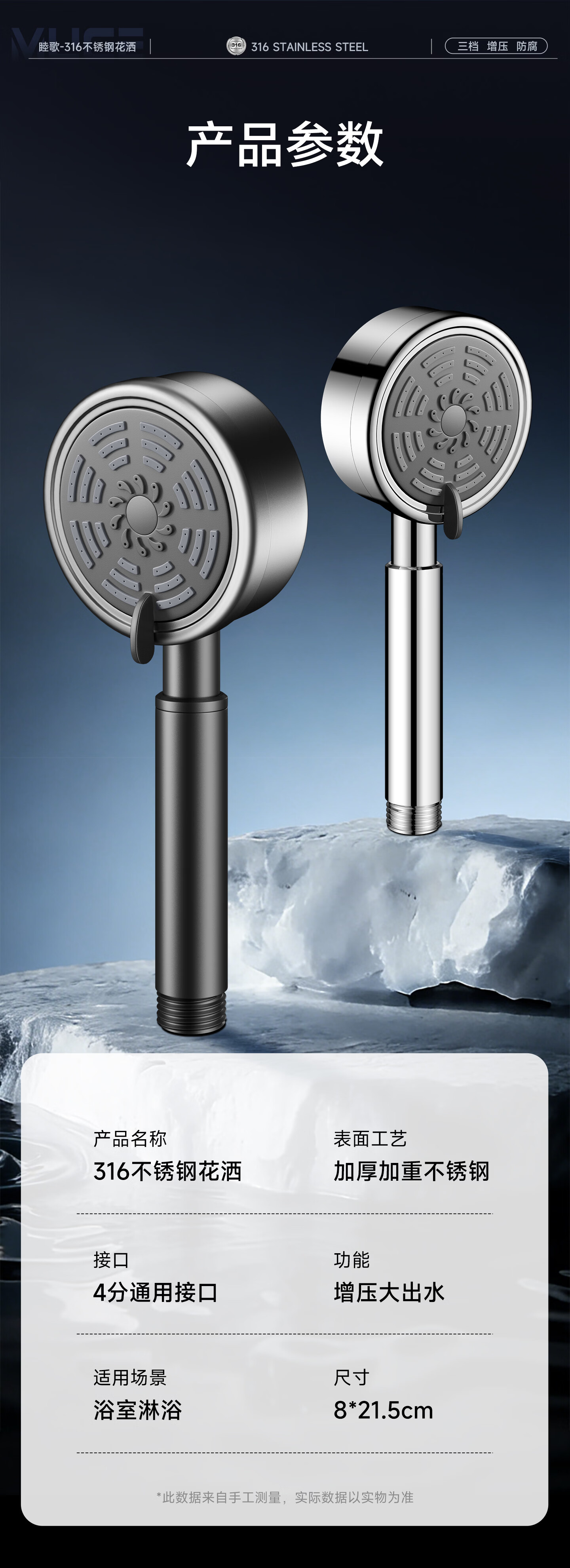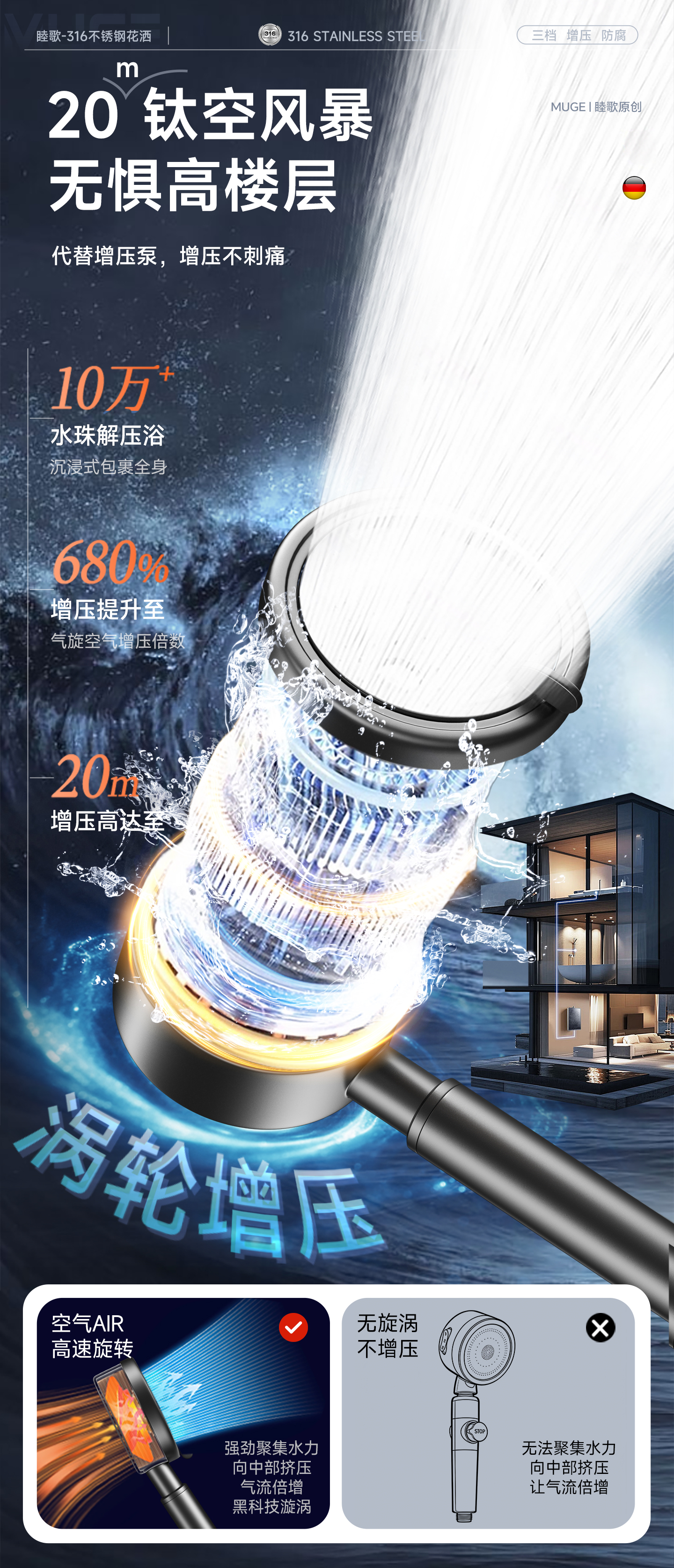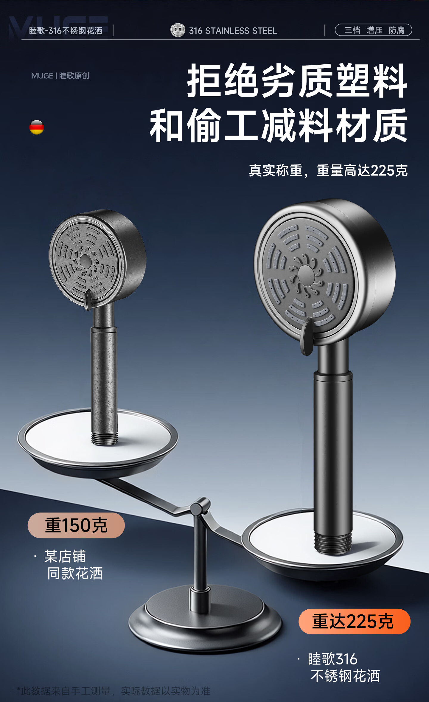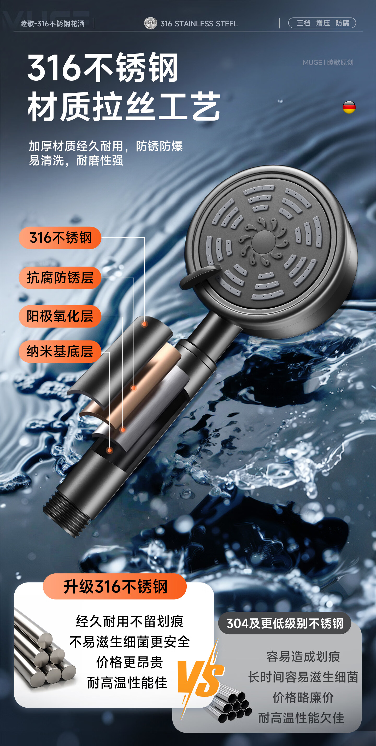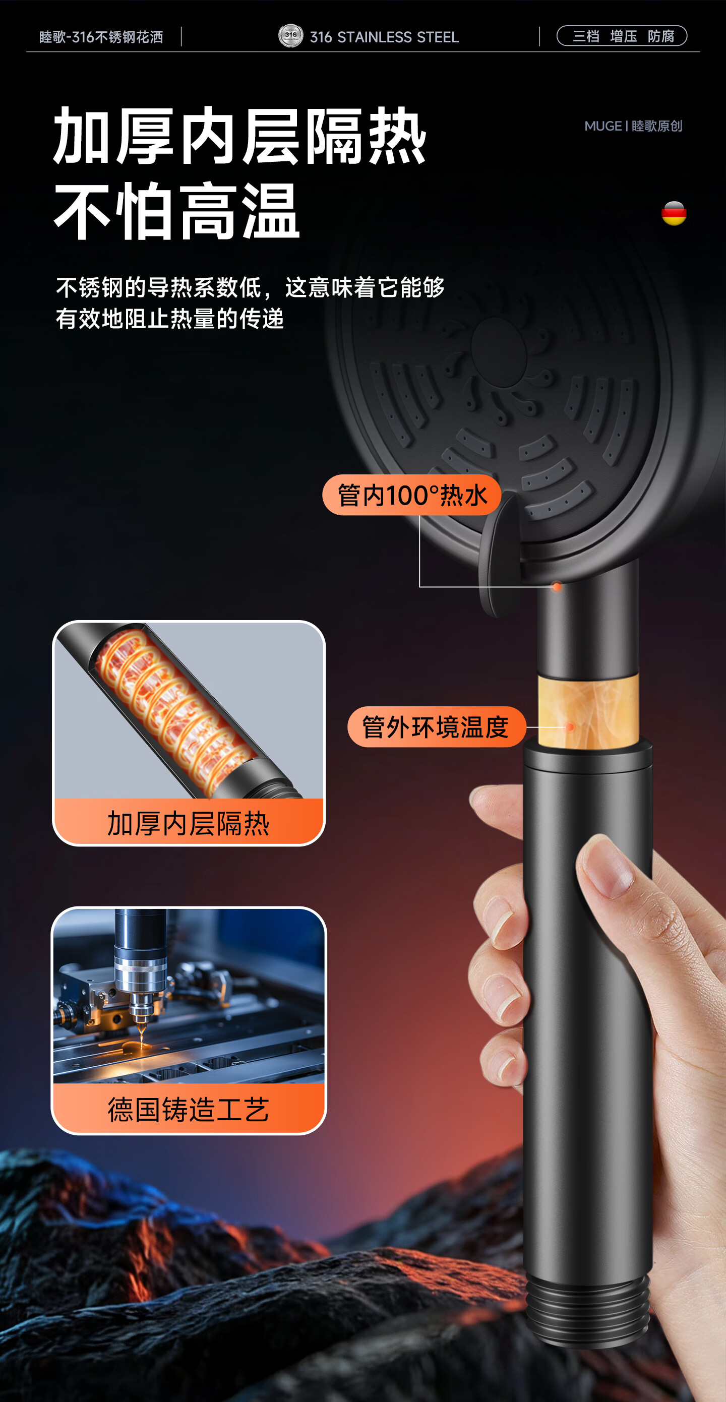 睦歌(MUGE)浴室增压花洒淋浴喷头超强高压大出水316不锈钢淋浴花洒头莲蓬头 加厚316不锈钢【亮银色】增压花洒+1.5米管+支架