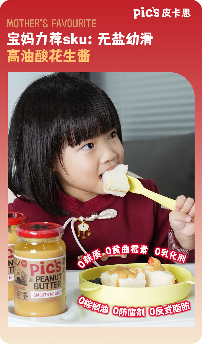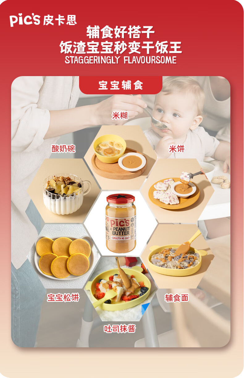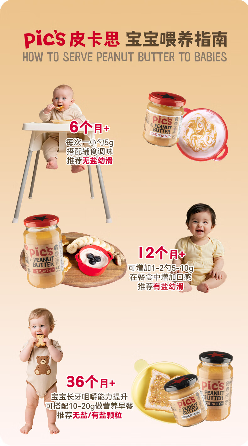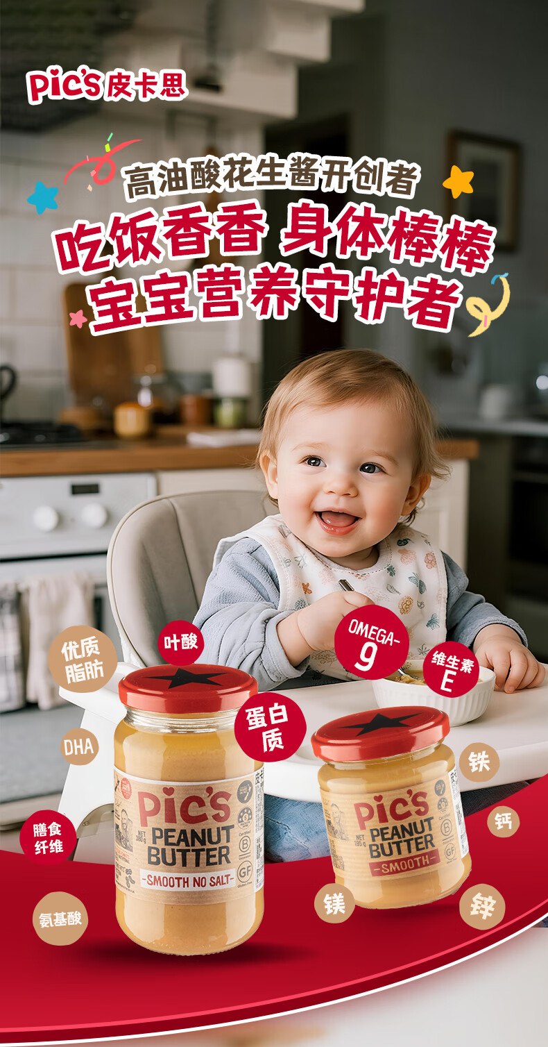 皮卡思pics花生酱195g无添加糖微盐 有盐幼滑款 进口抹面包宝宝拌面酱