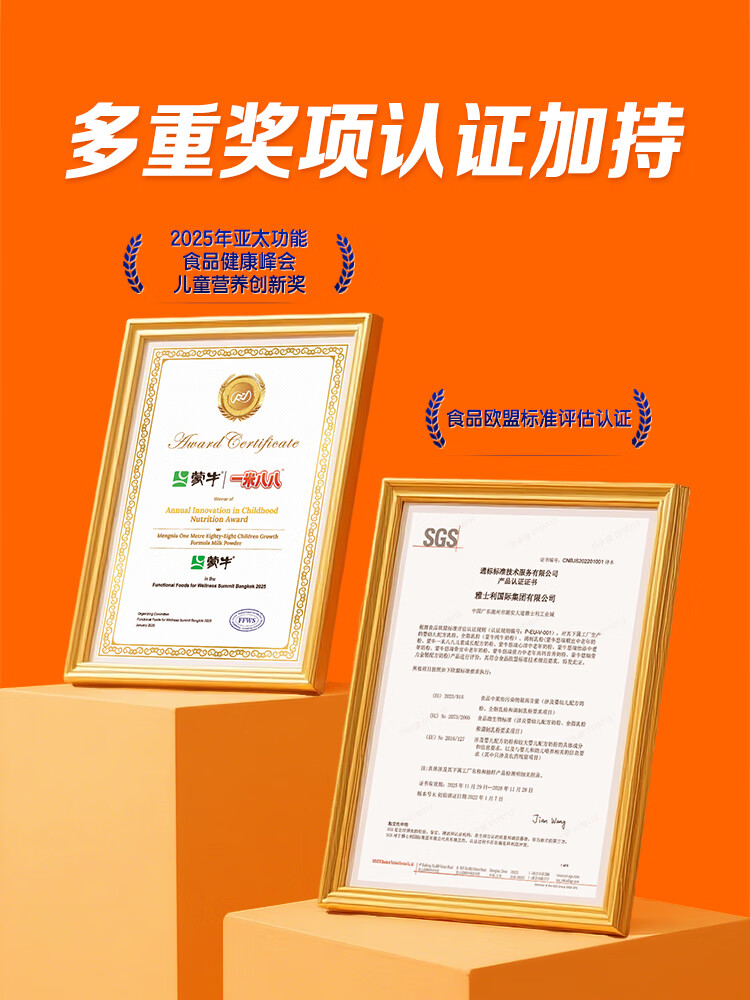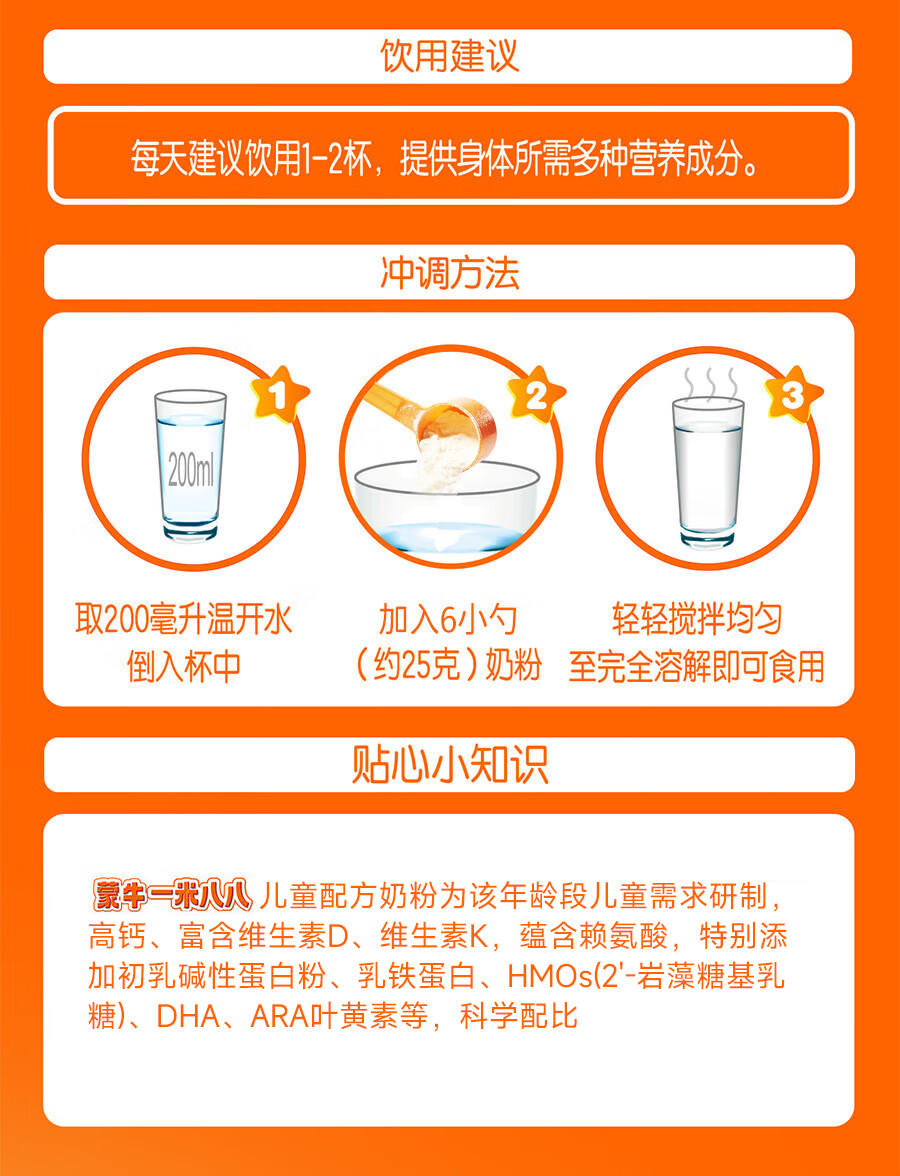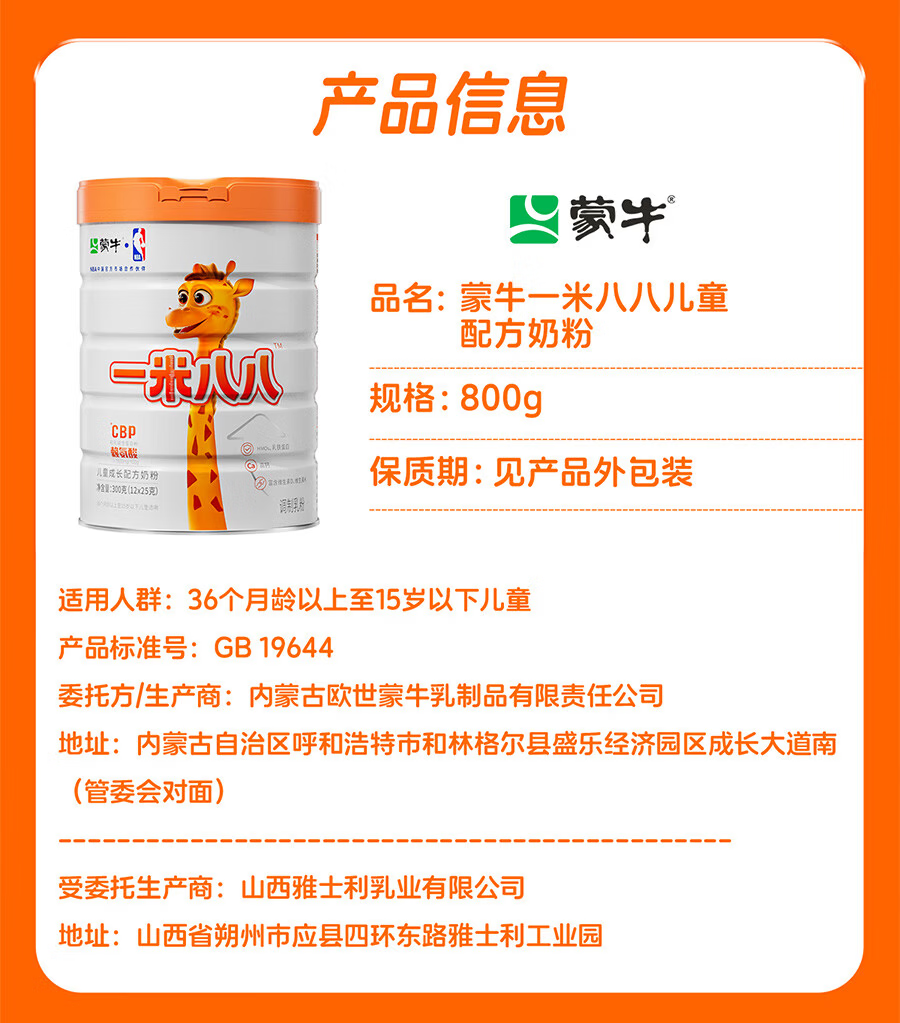 蒙牛一米八八儿童奶粉赖氨酸乳铁蛋白3-15岁罐装800g*4优质奶源