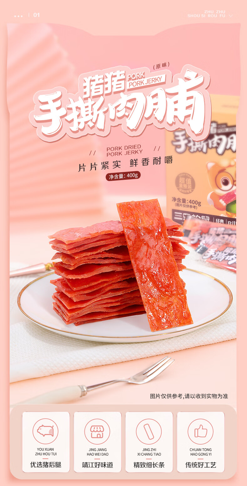 三只松鼠手撕肉脯原味400g/420g 量贩装 混发 休闲零食 靖江风味猪肉干
