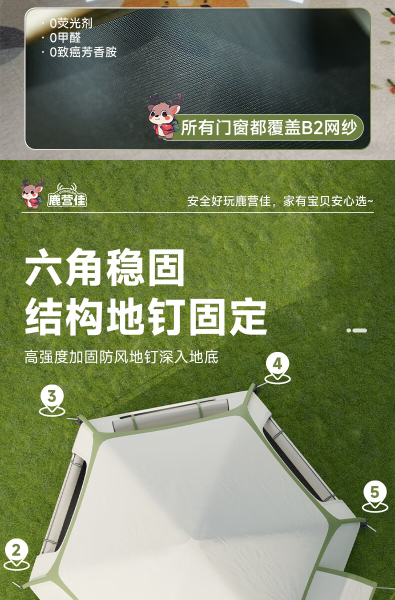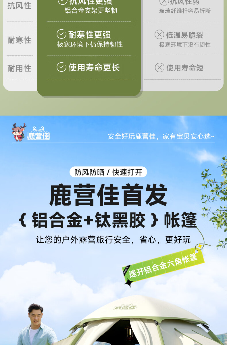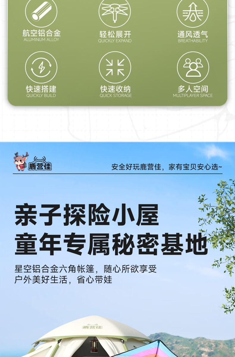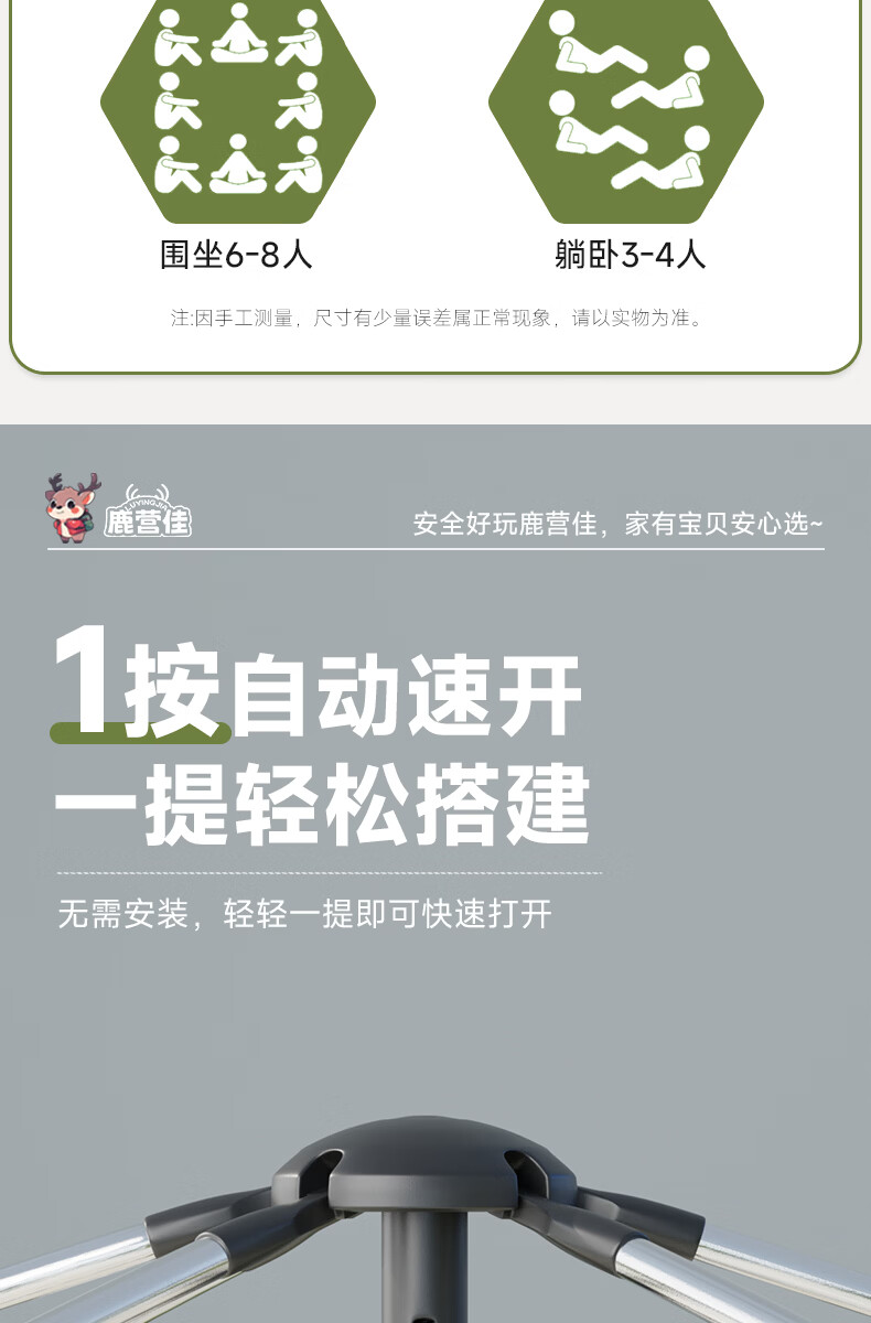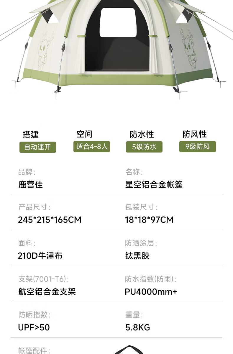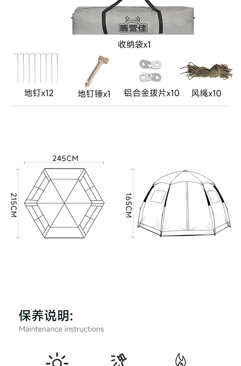 鹿营佳铝合金杆钛黑胶防晒帐篷户外露营全自动速开防雨野外过夜星空顶 铝合金六面帐篷+六角垫+防水垫