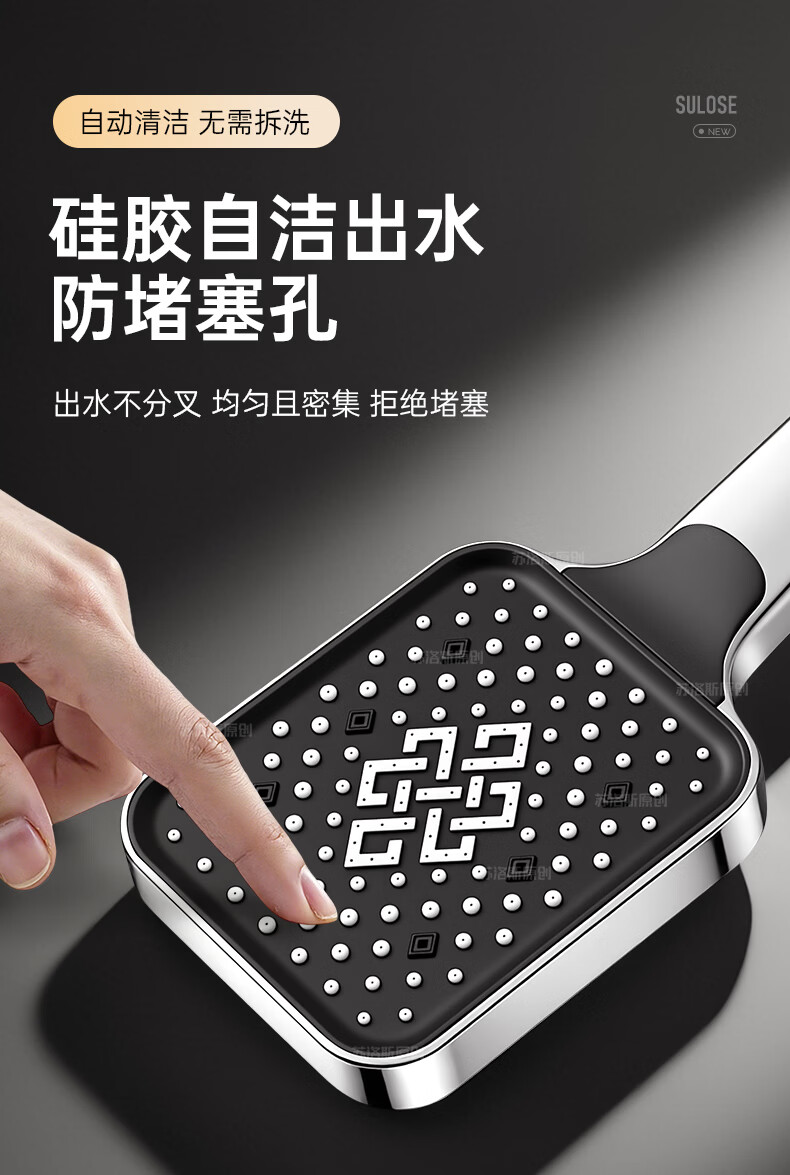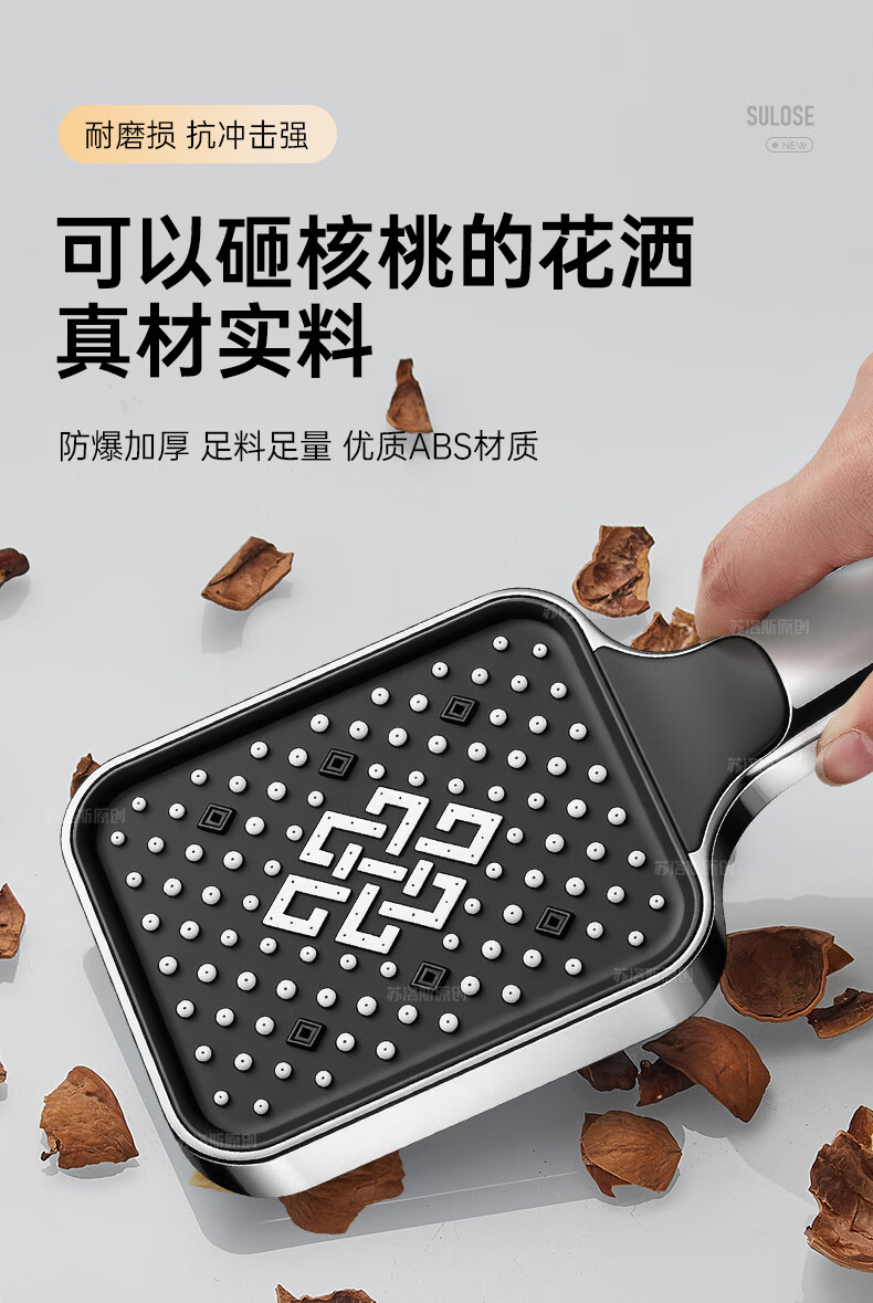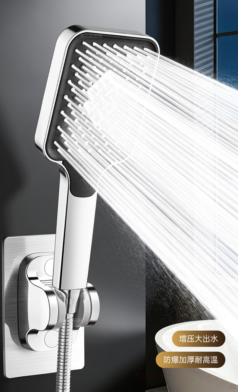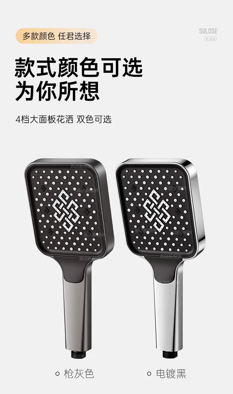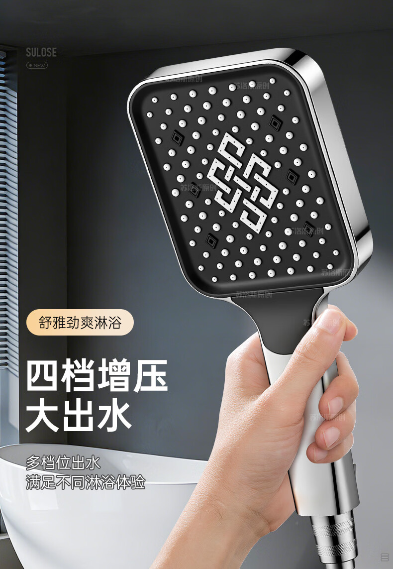 苏洛斯增压花洒淋浴喷头带软管套装浴室卫生间热水器洗澡手持加压莲蓬头 【方款电镀】空气增压丨四档出水切换 四分通用接口丨硅胶防堵出水孔