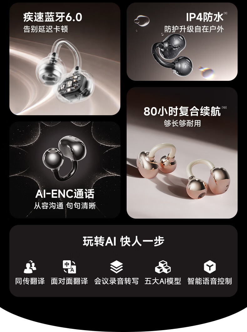 萨勒芬妮 夹耳式蓝牙耳机全开放式骨传导概念真无线不入耳双单挂耳式运动跑步通话降噪游戏适用苹果安卓机 曜石黑【双核空间音效丨AI实时翻译】 IMAX影院环绕音丨云感佩戴