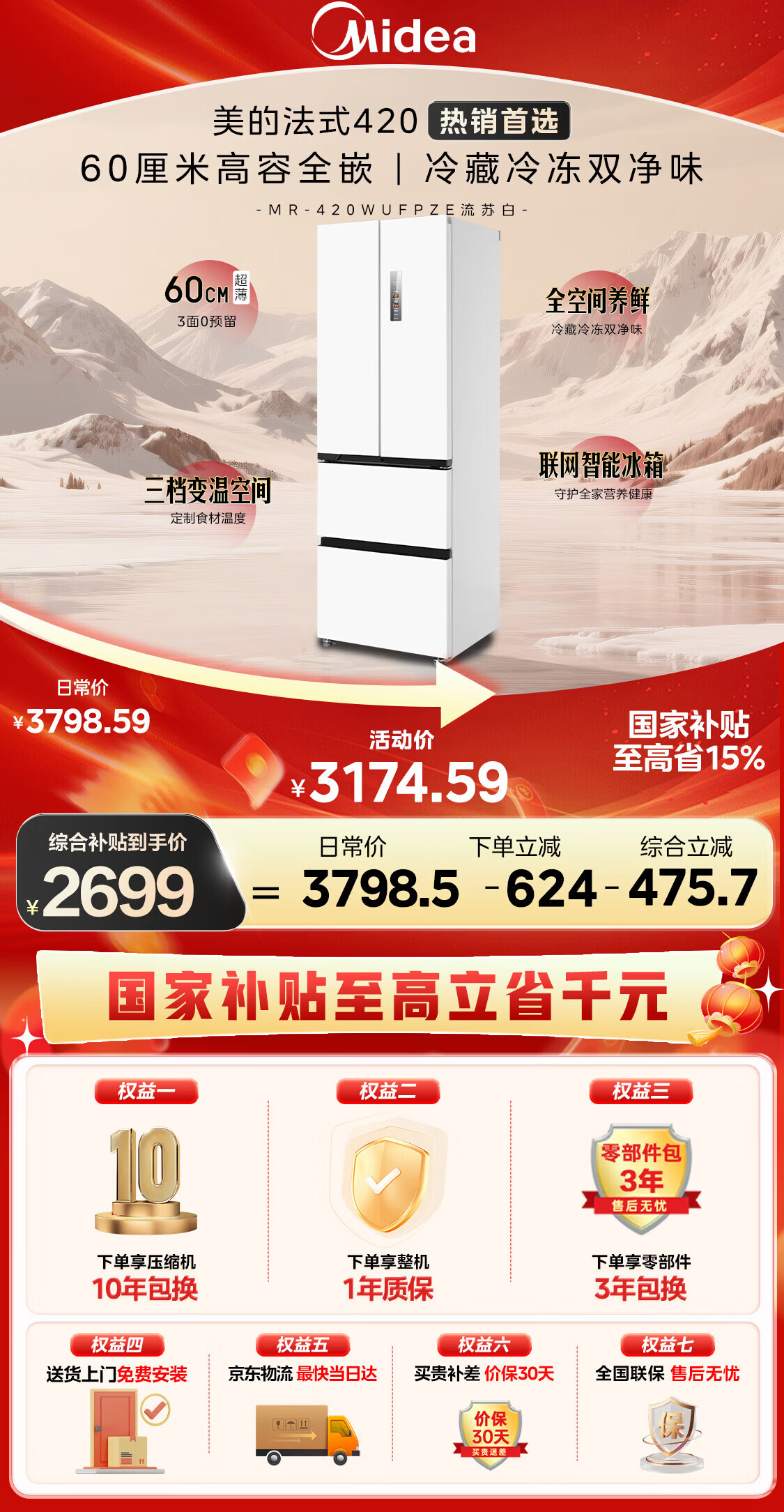 美的(Midea)420法式多门四门超薄纯平全嵌双变频大容量底部散热风冷无霜一级家用冰箱MR-420WUFPZE国家补贴