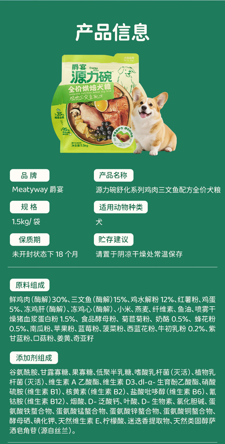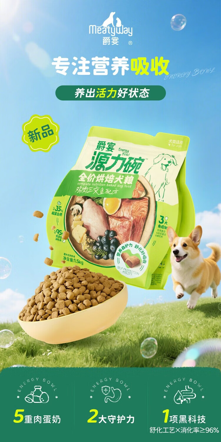 Meatyway爵宴源力碗狗粮全价烘焙粮鸡肉三文鱼 中小型成犬幼犬通用犬主粮 全价烘焙粮-鸡肉三文鱼配方 正装1.5kg*3包