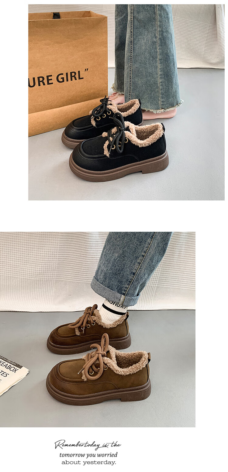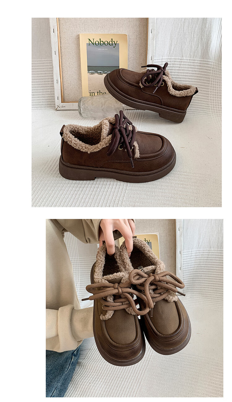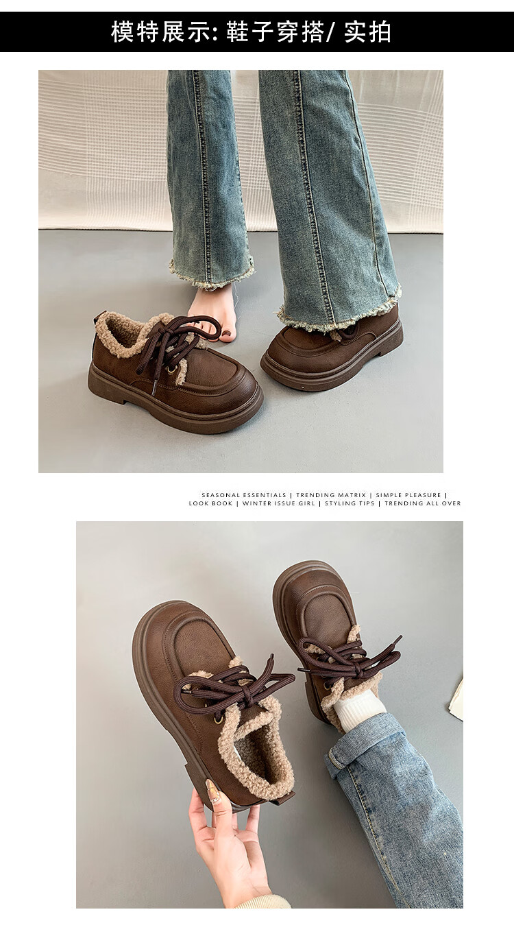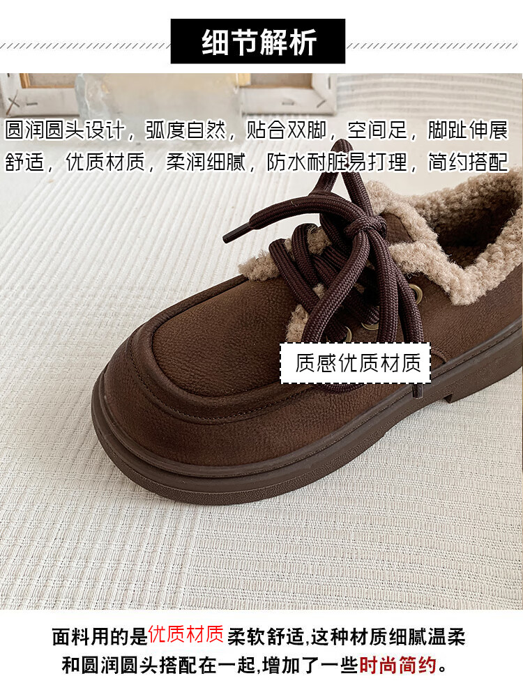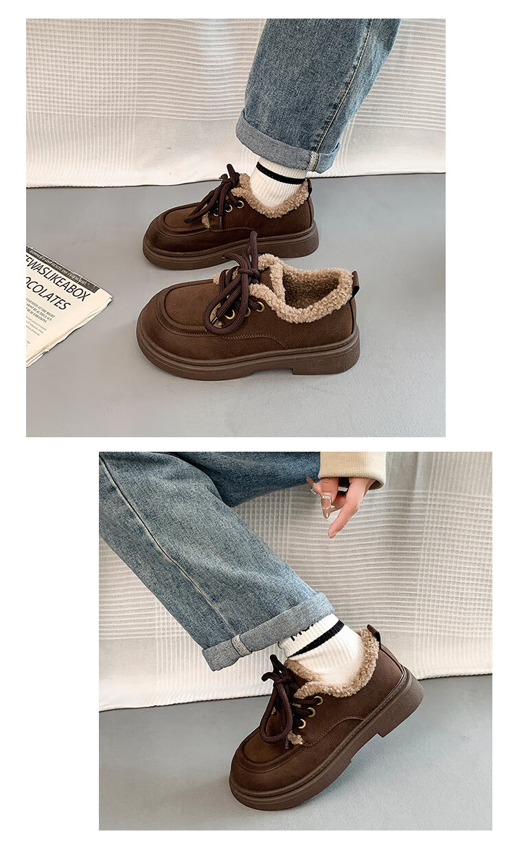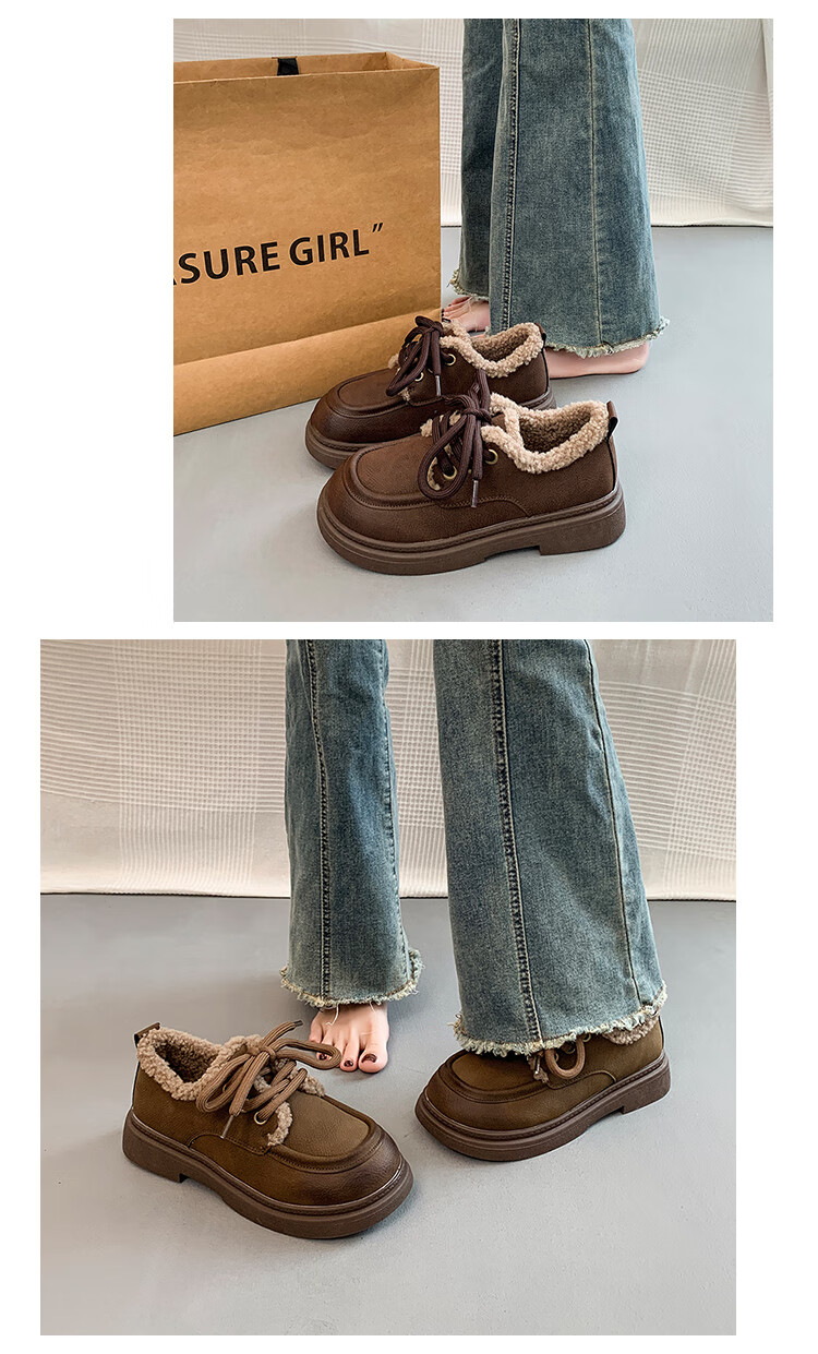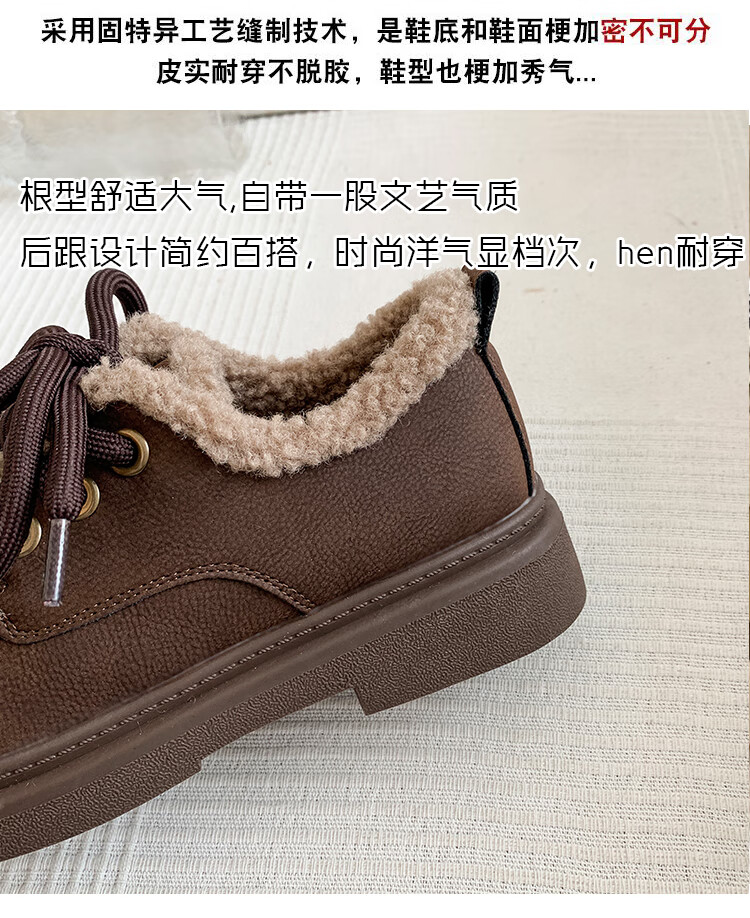 稻草人(MEXICAN)复古勃肯鞋女2026冬季新款厚底加绒加厚休闲保暖棉鞋羊羔毛小皮鞋 棕色 35
