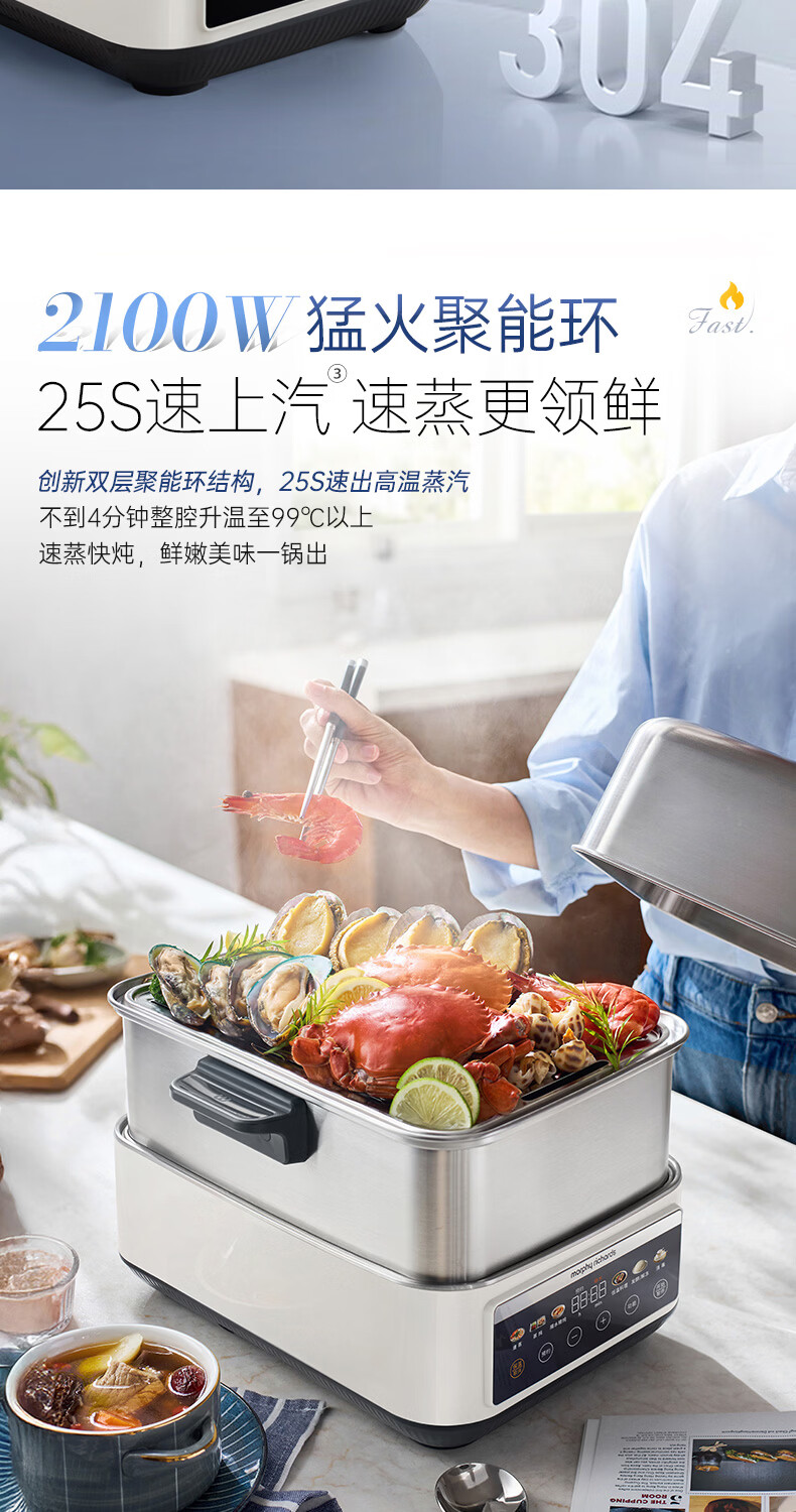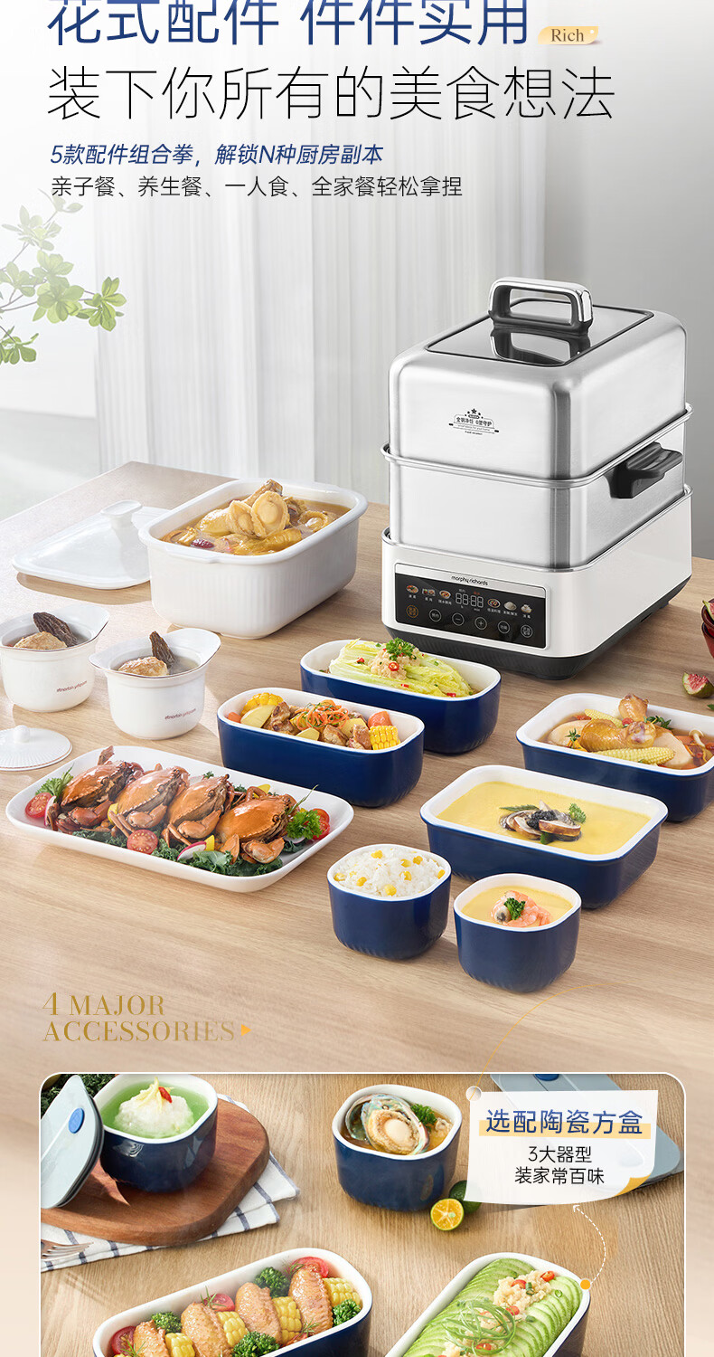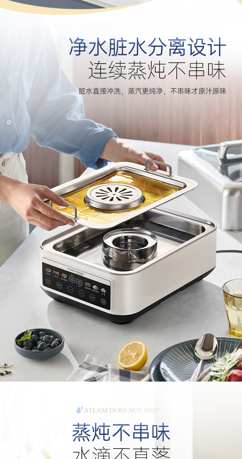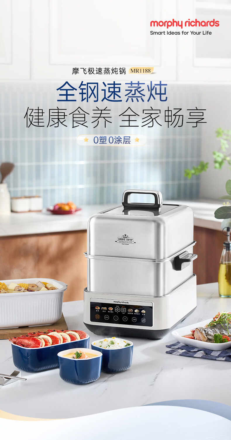 摩飞电器(Morphyrichards)电蒸锅 0涂层全不锈钢家用3-4人炖蒸一体蒸炖锅速蒸锅多功能锅 大容量隔水炖盅蒸汽锅电炖锅MR1188