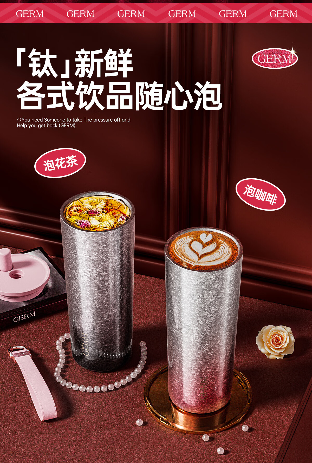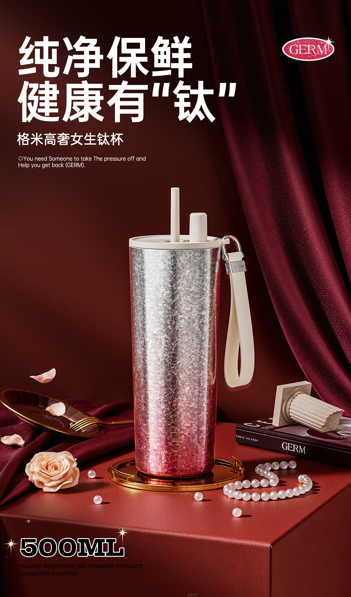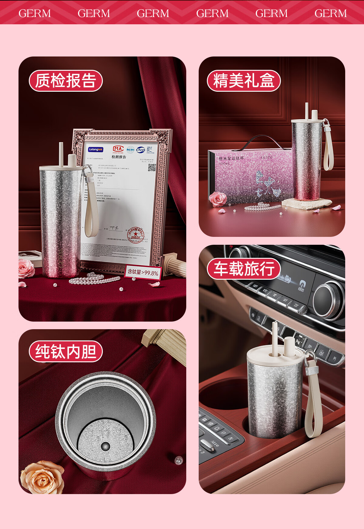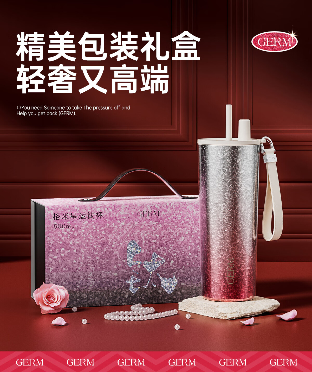 格米(germ)星运双层纯钛吸管保温杯高颜值水杯女士礼物水壶大容量车载杯子 星运钛杯礼盒【月夜暮粉】500ML