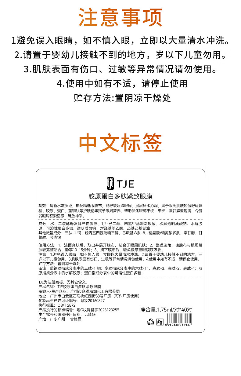 TJE英国TJE胶原蛋白多肽紧致眼膜(40对/盒)提拉紧致淡化细纹补水保湿