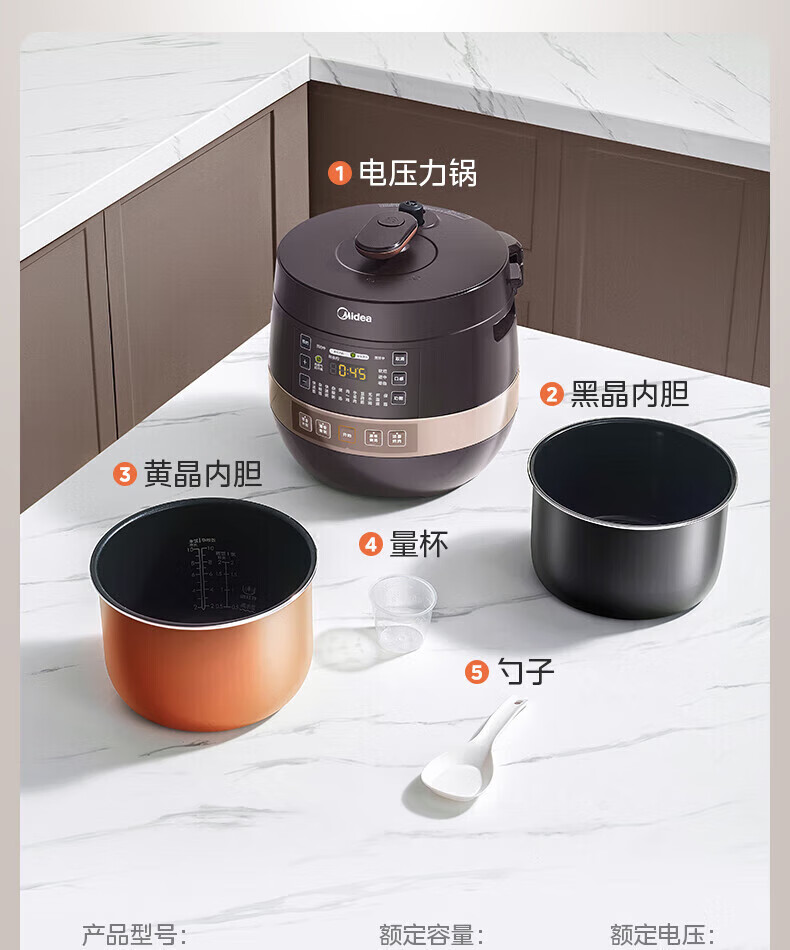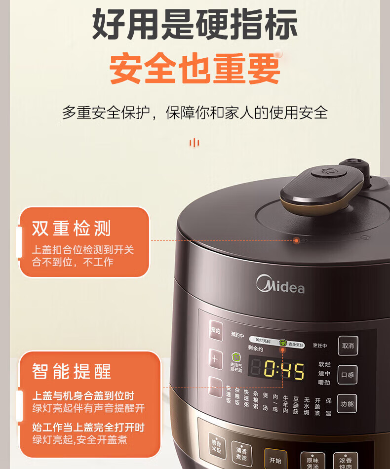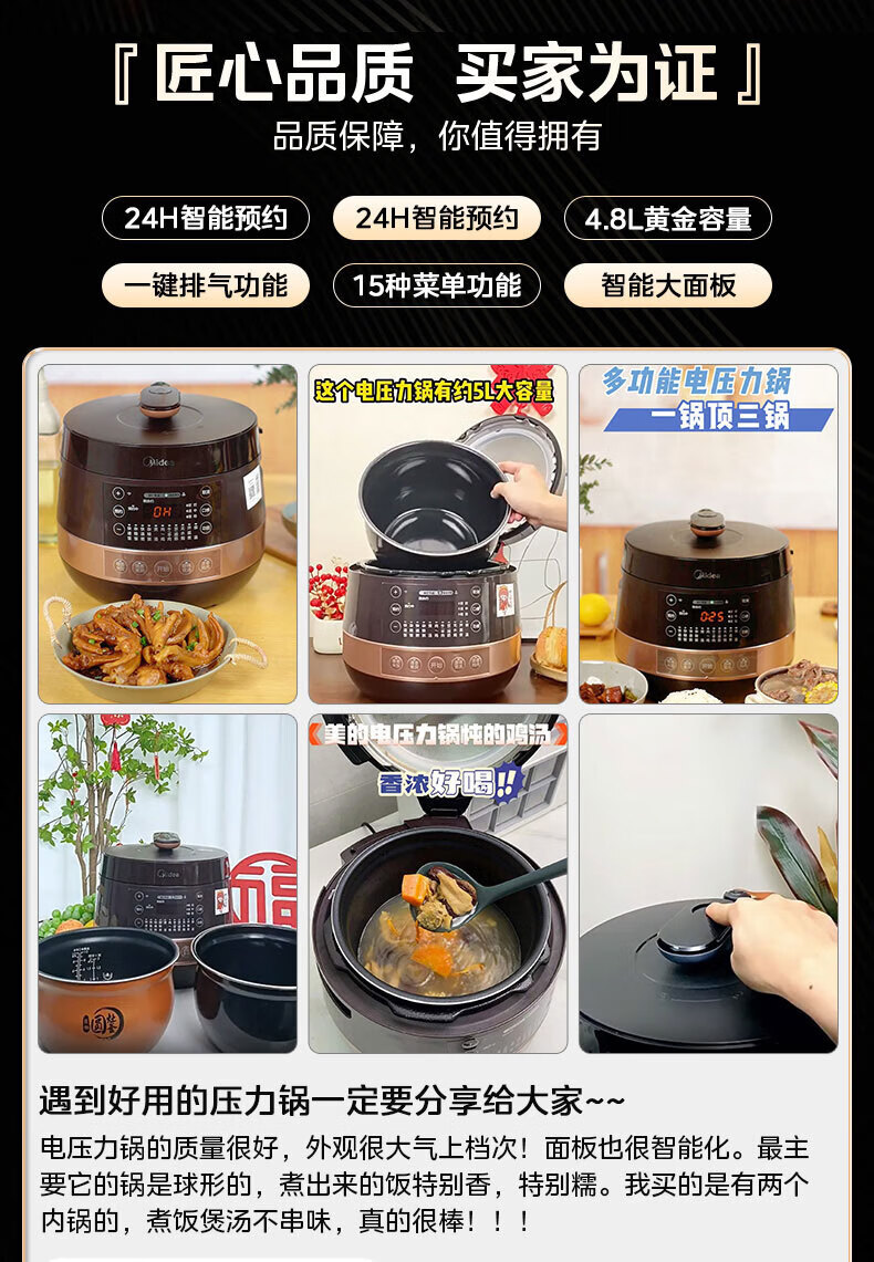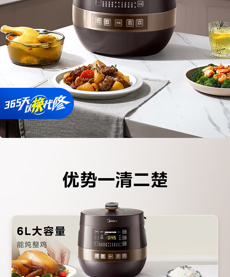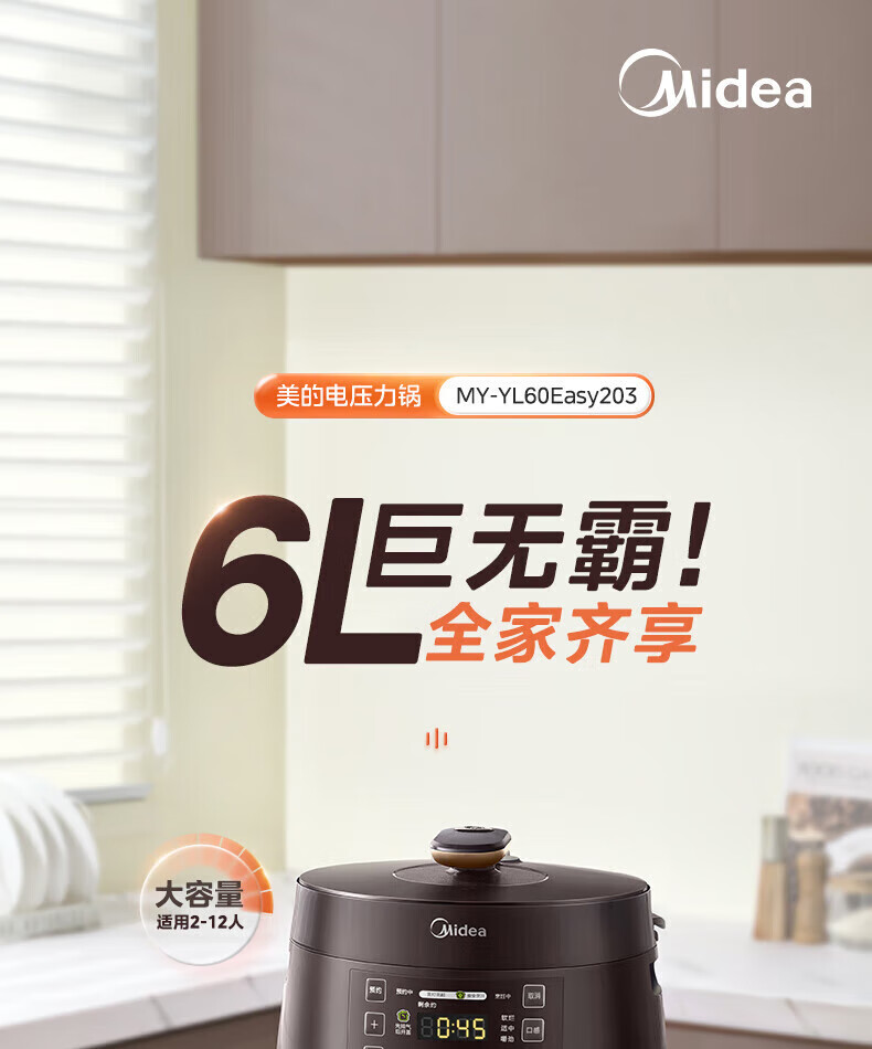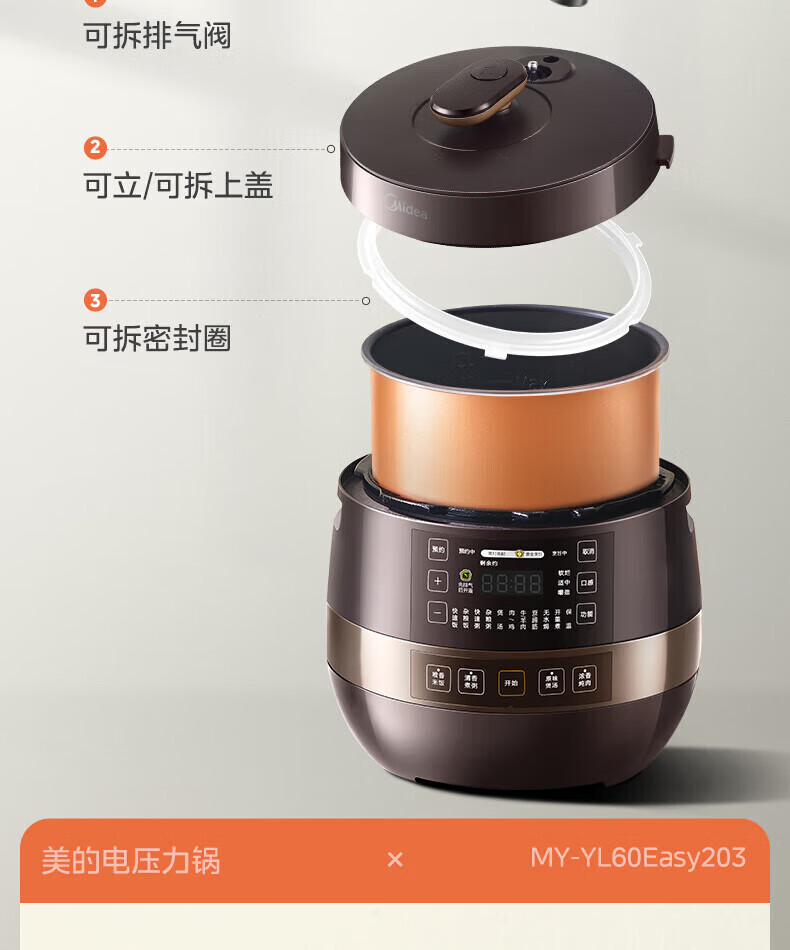 美的(Midea)电压力锅电高压锅6升大容量5-6-10人家用电饭煲高压电饭锅电压力蒸锅炖蒸煮一体一锅双胆煲汤锅 6升【70Kpa高压】口感可调 6L