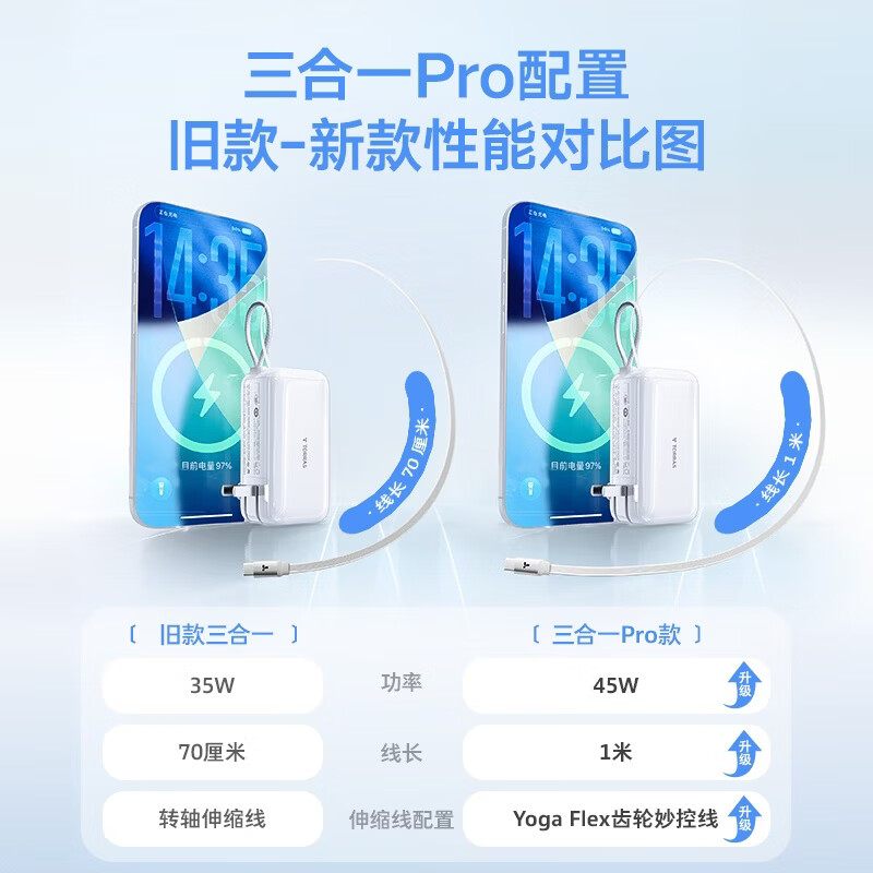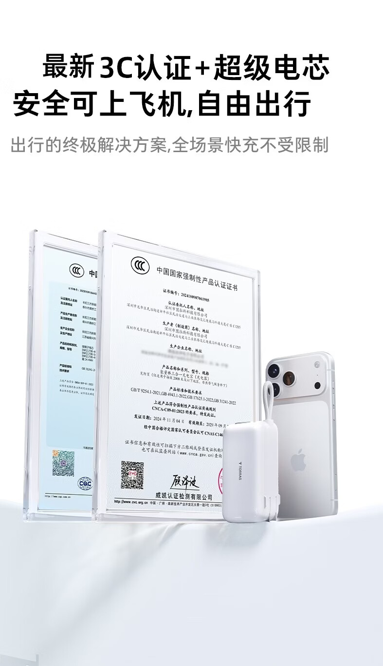 图拉斯充电宝【26年顶配45W丨三合一随心充Pro】3C认证带插头可上飞机快充自带伸缩线移动电源能量棒苹果 【热销45W顶配】丨天空蓝丨1W毫安