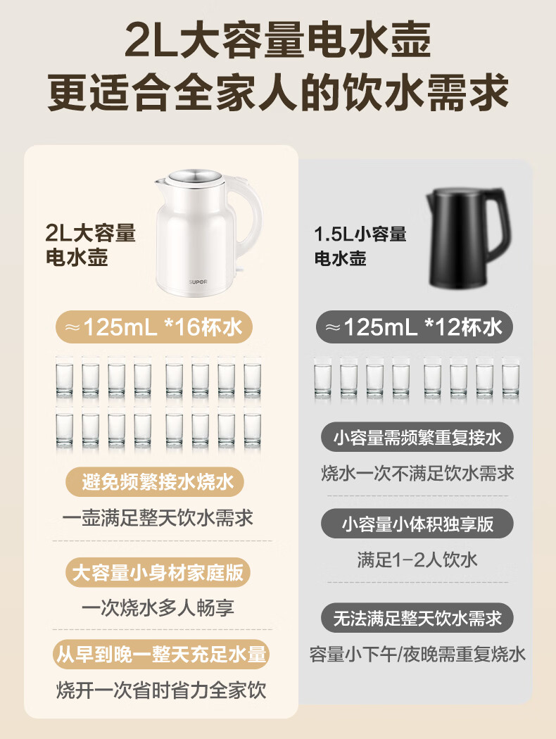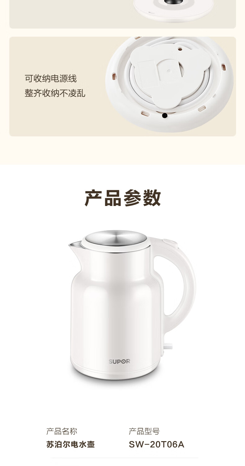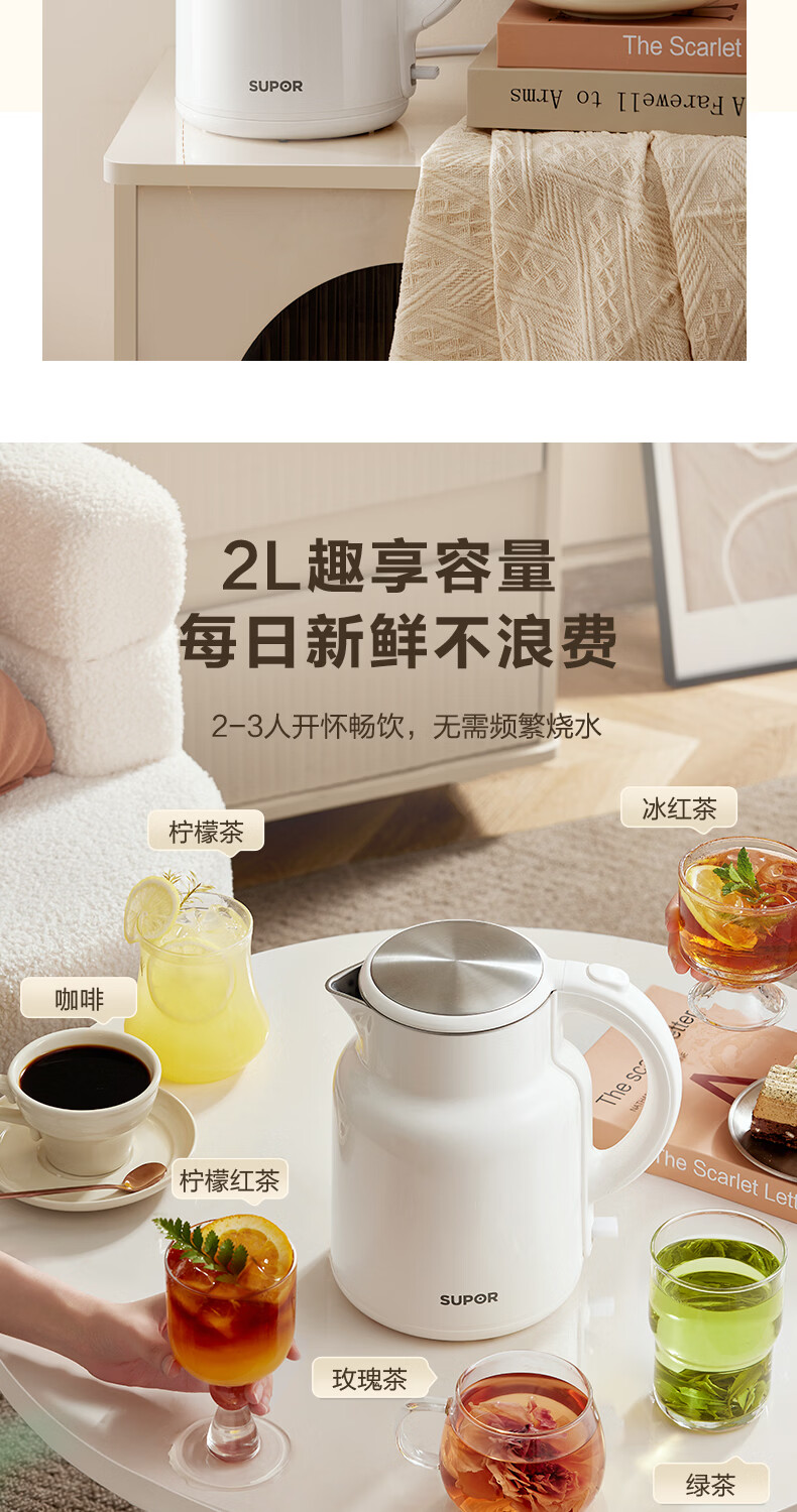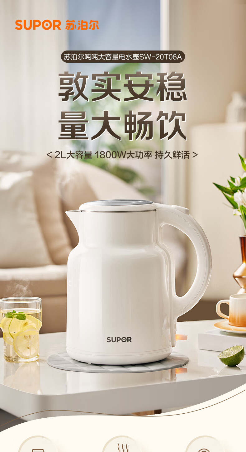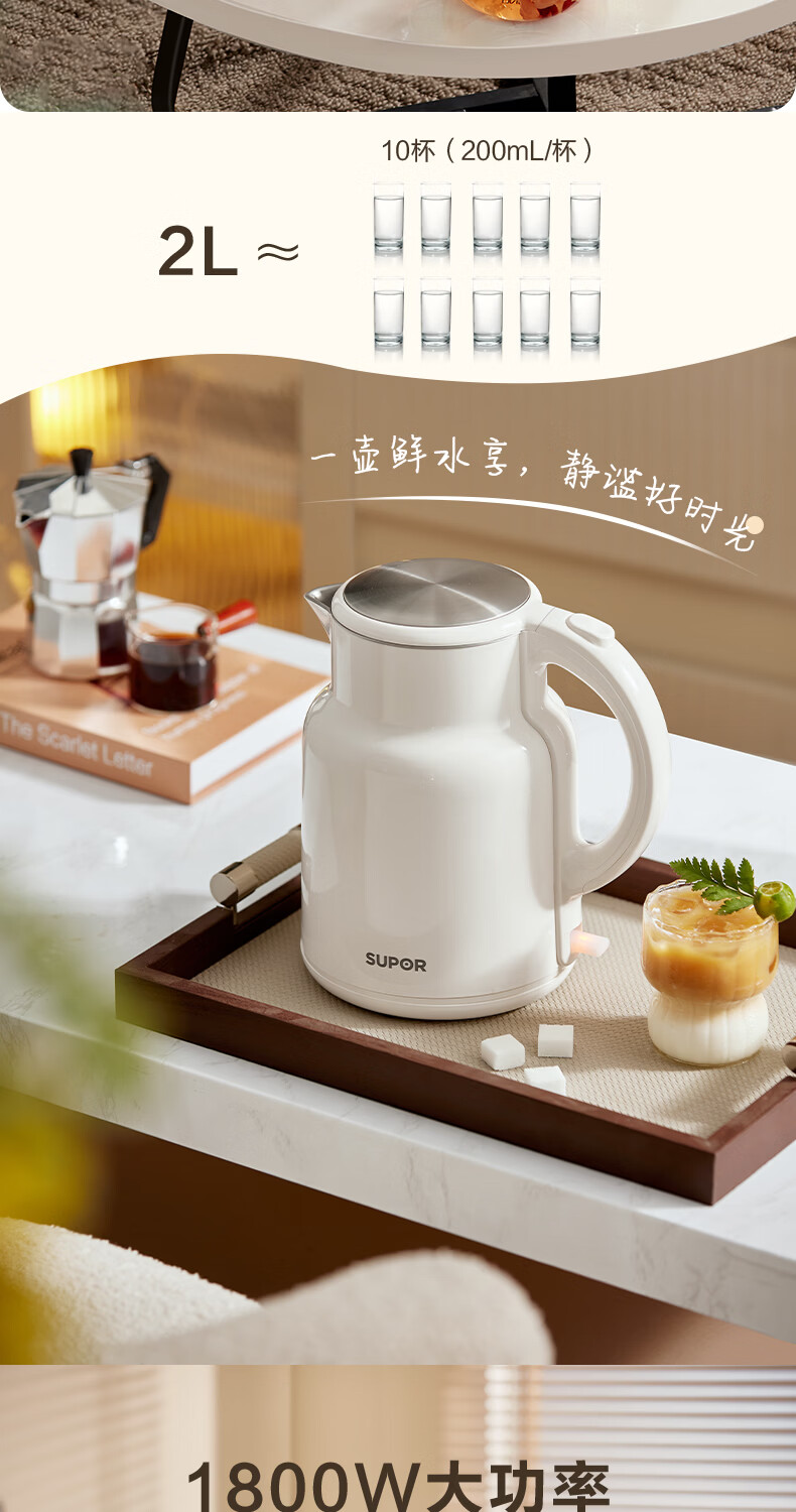 苏泊尔(SUPOR)吨吨大容量电水壶热水壶 2L大容量全钢无缝电热水壶 304不锈钢烧水壶 SW-20T06A