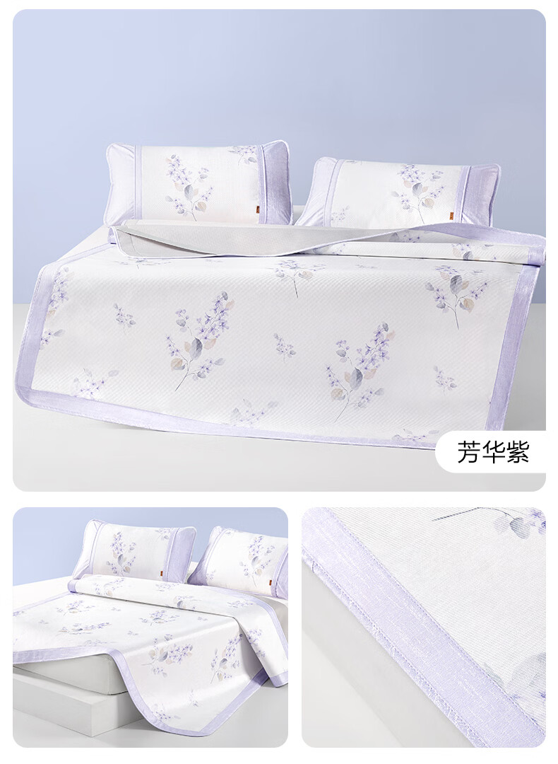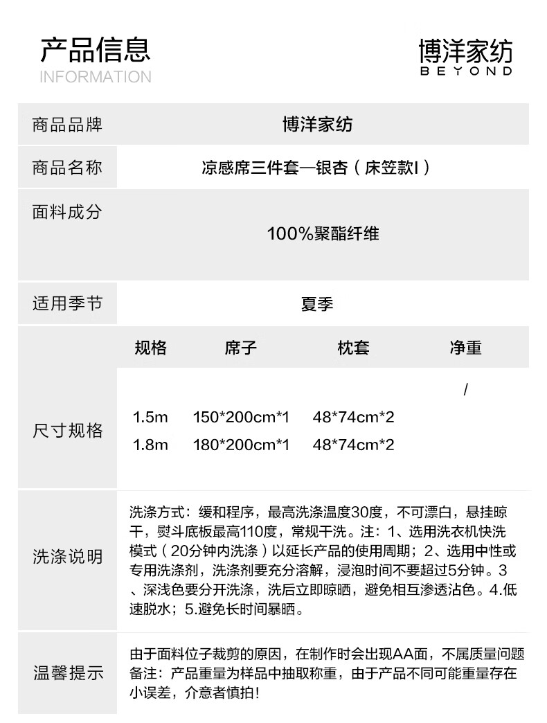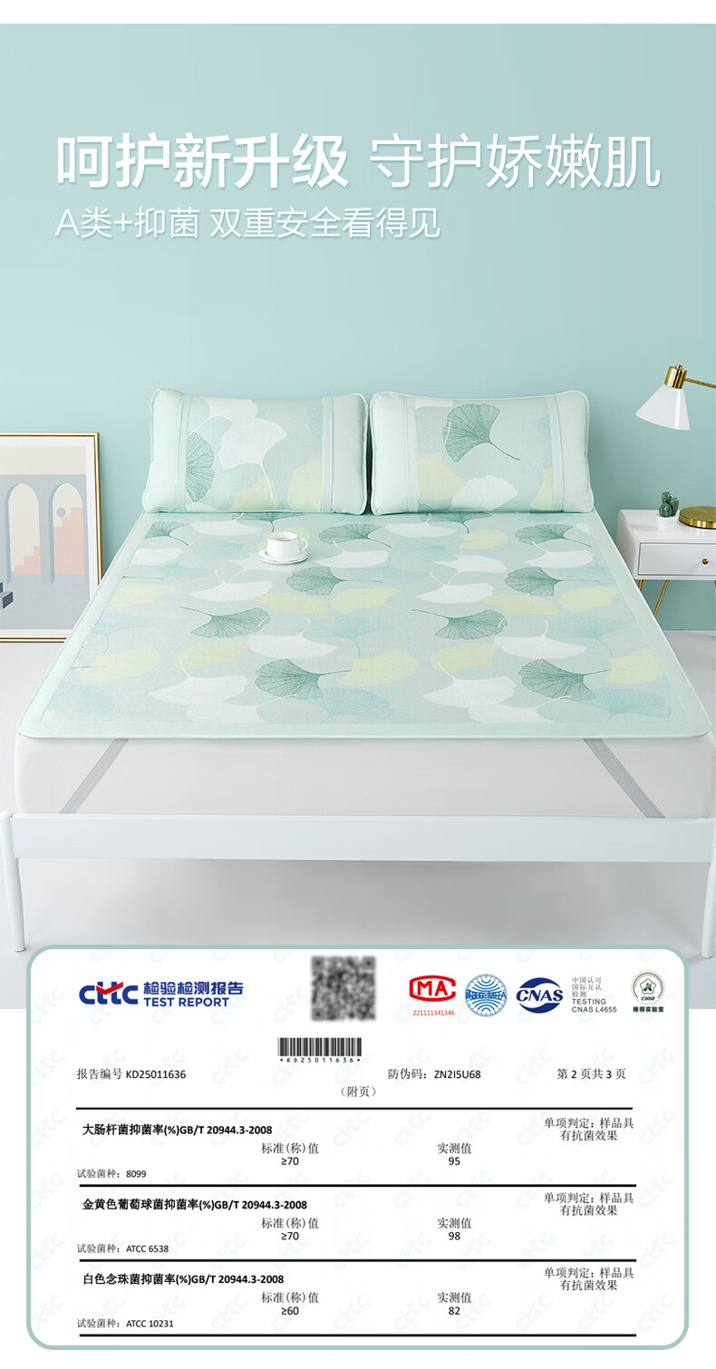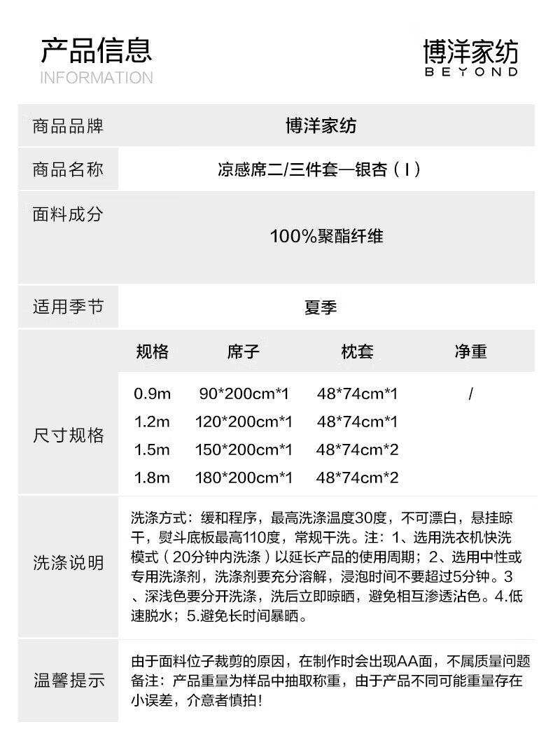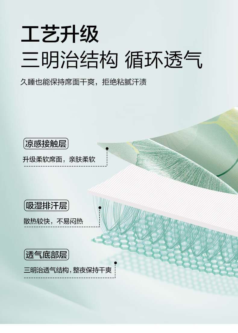 博洋(BEYOND)博洋印花可水洗冰丝席子夏软凉席二三件套可折叠冰丝席单双人夏季 【可水洗+A类】凉感软凉席-银杏 90*200cm