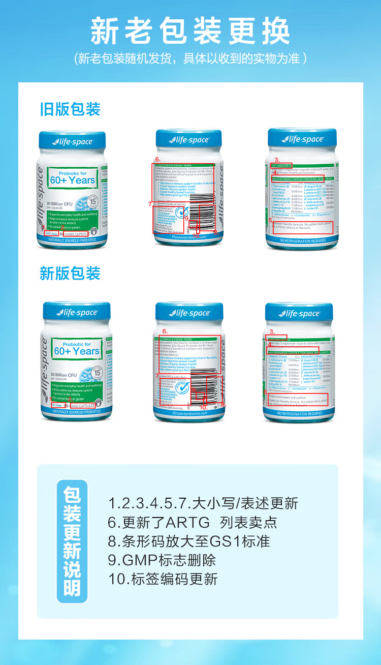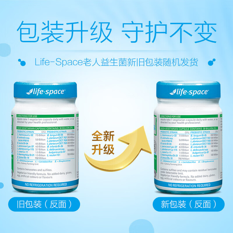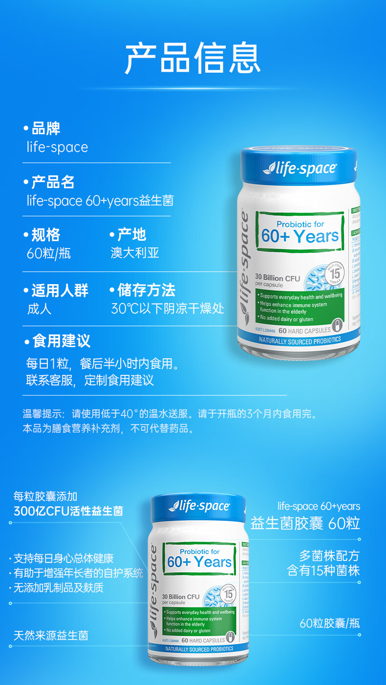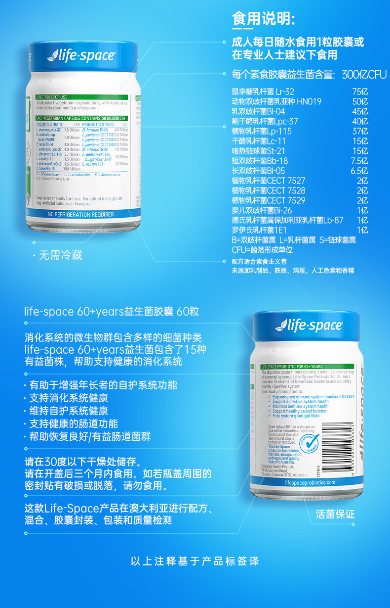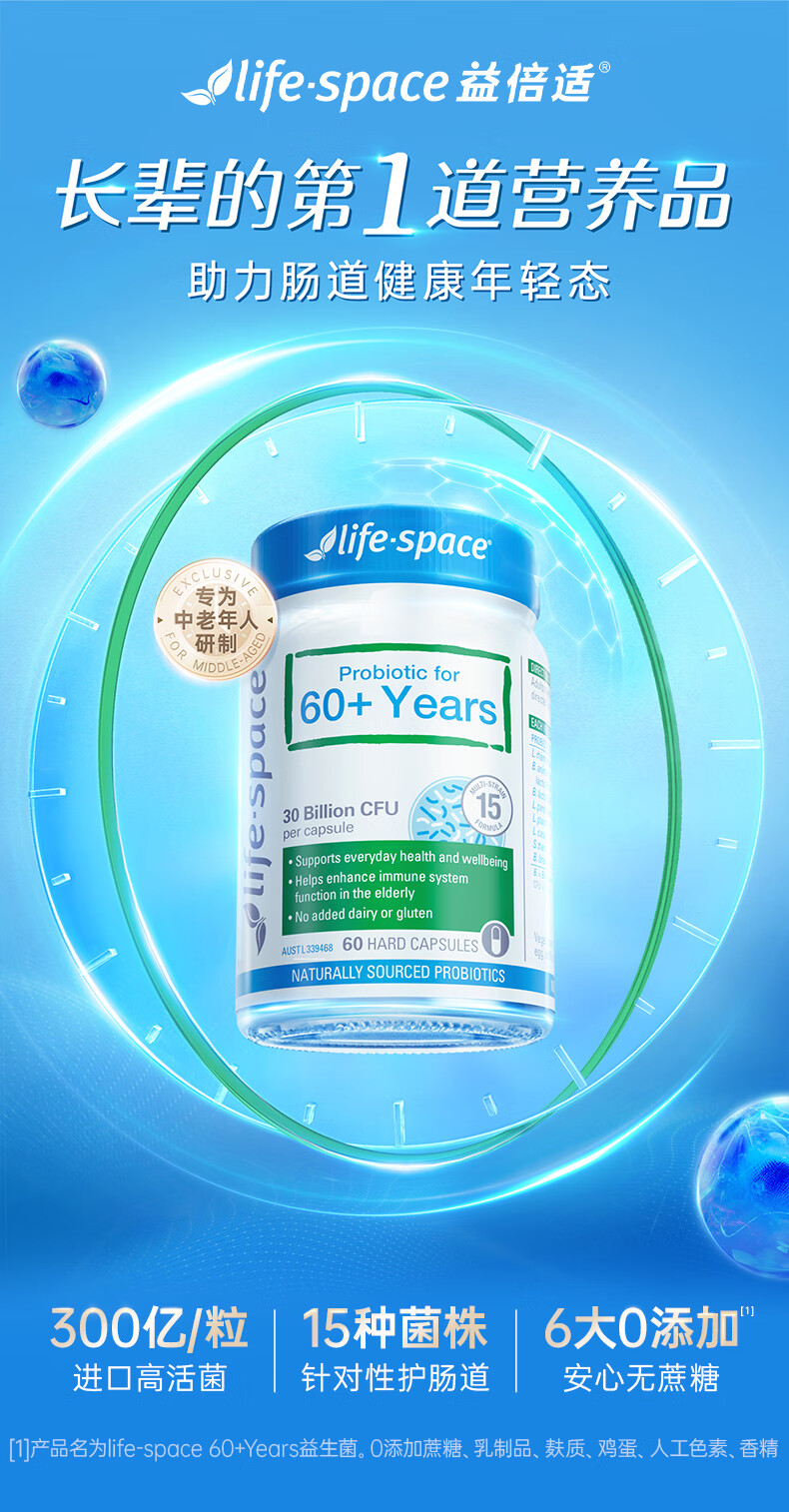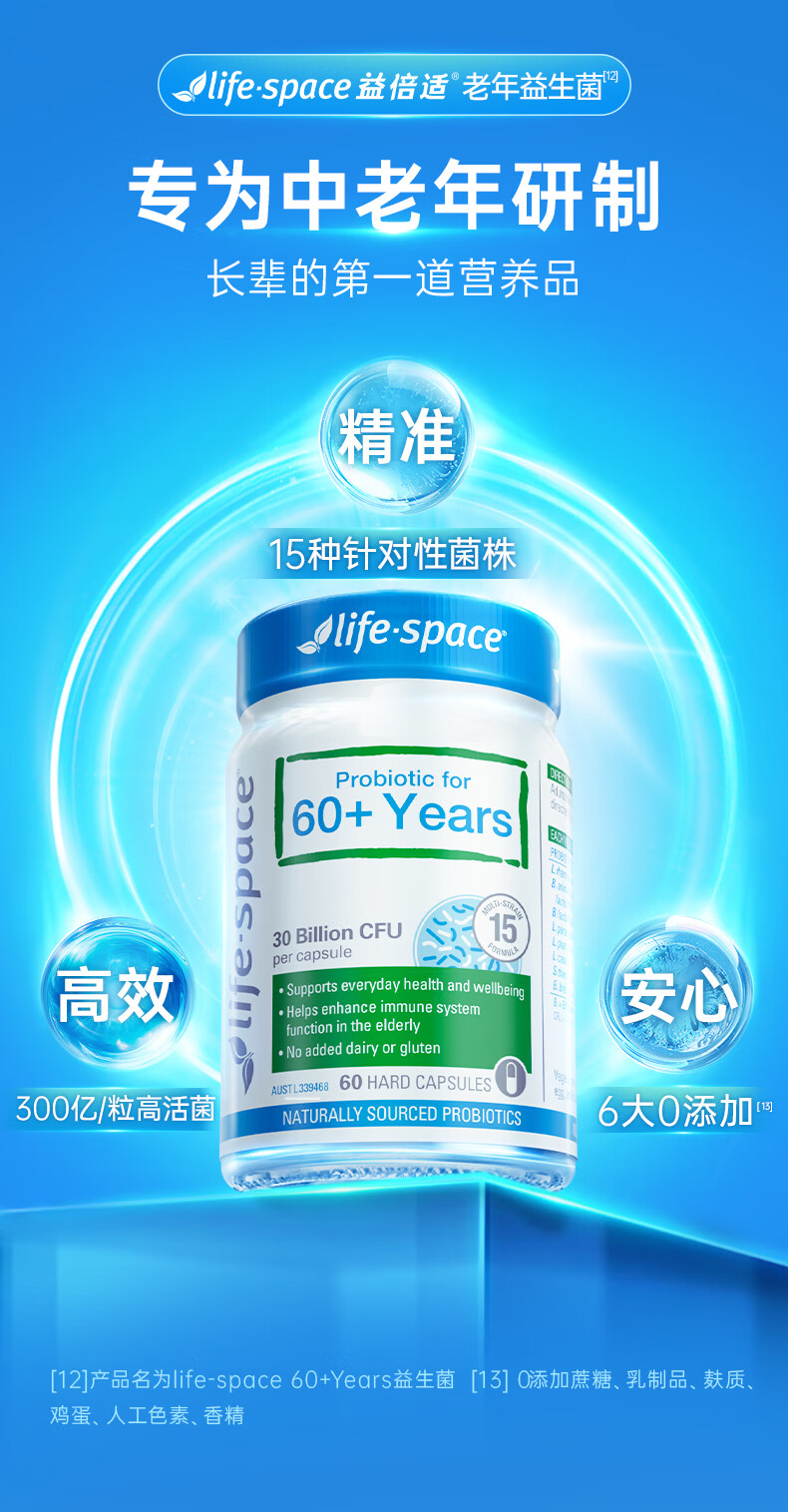 Life Space益倍适成人中老年益生菌胶囊300亿活菌60粒/瓶澳洲进口【常青瓶】