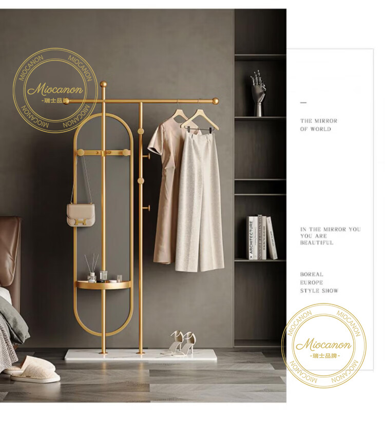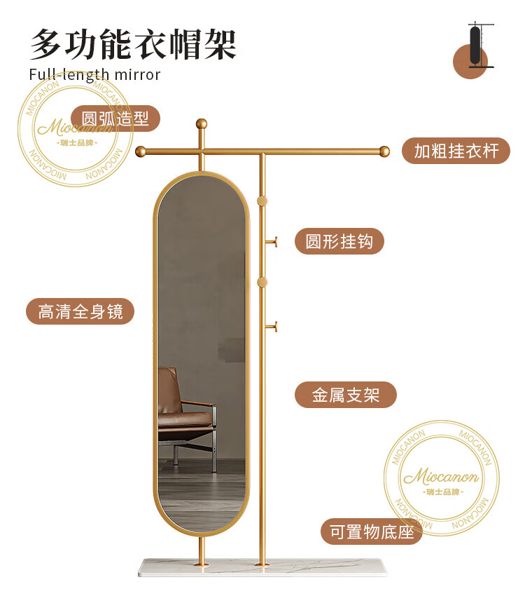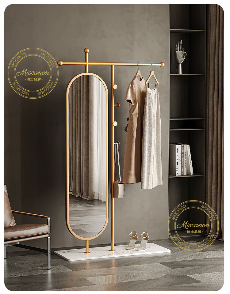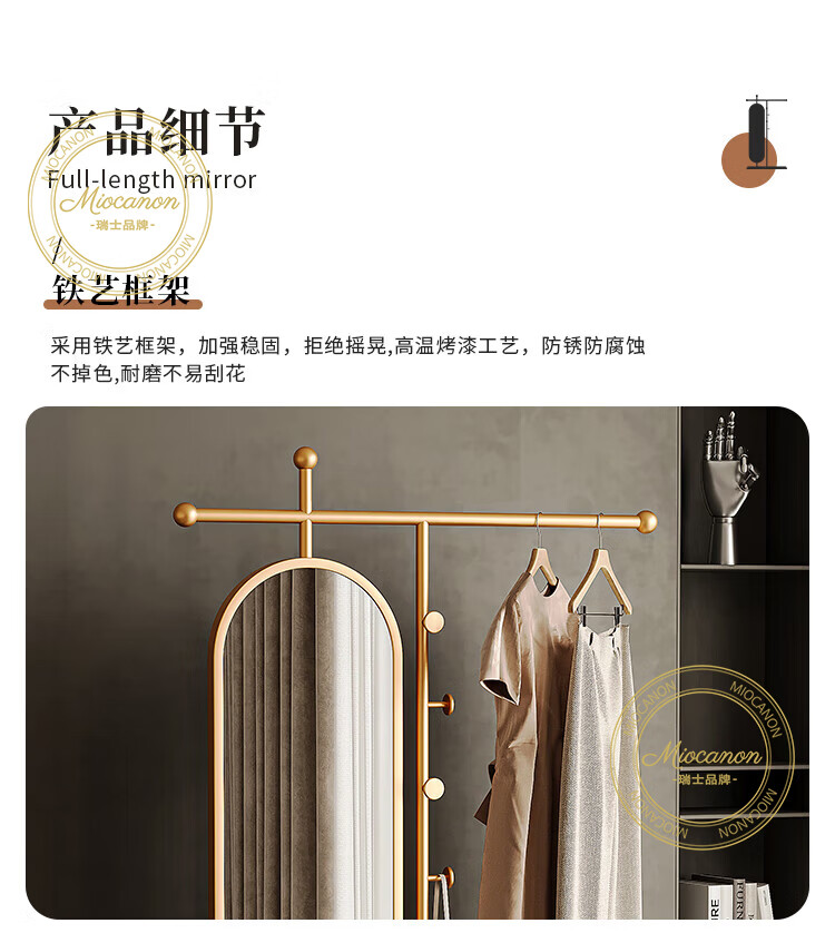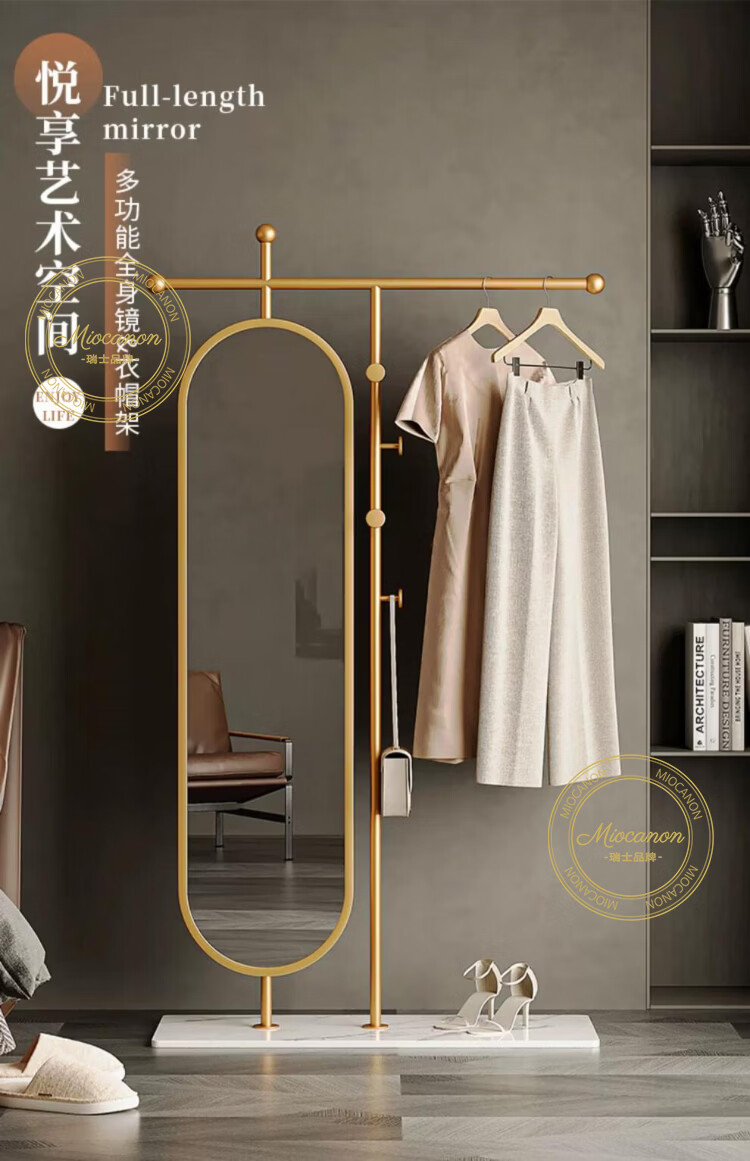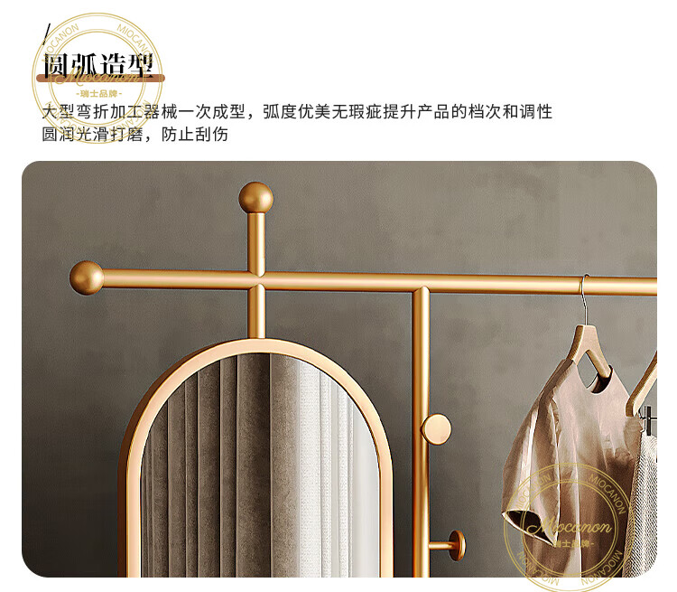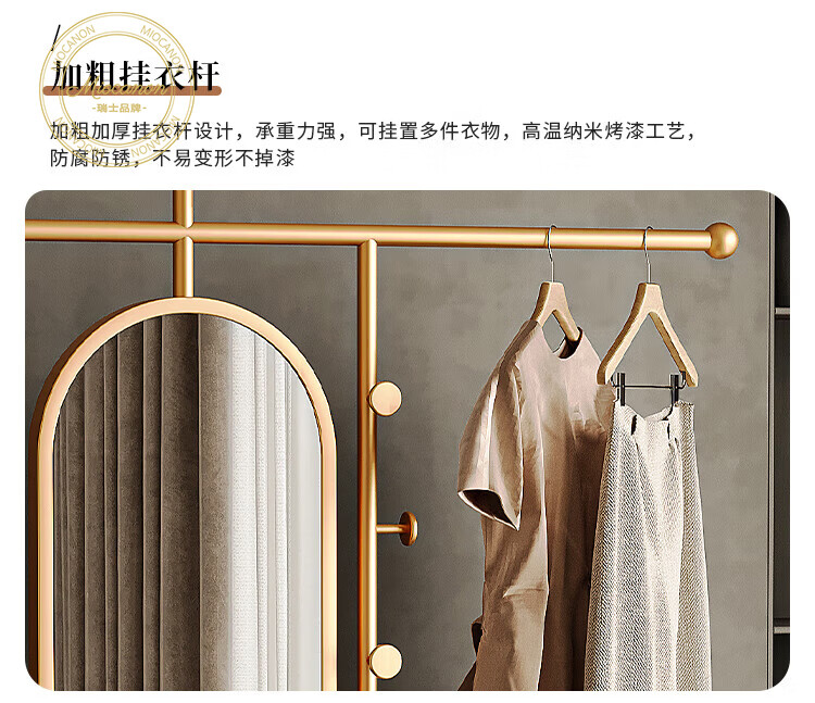 MIOCANON瑞士品牌轻奢衣帽架穿衣镜一体挂衣架落地卧室带镜子可旋转多功能 【金色】衣帽架+360度旋转镜子 长度100m