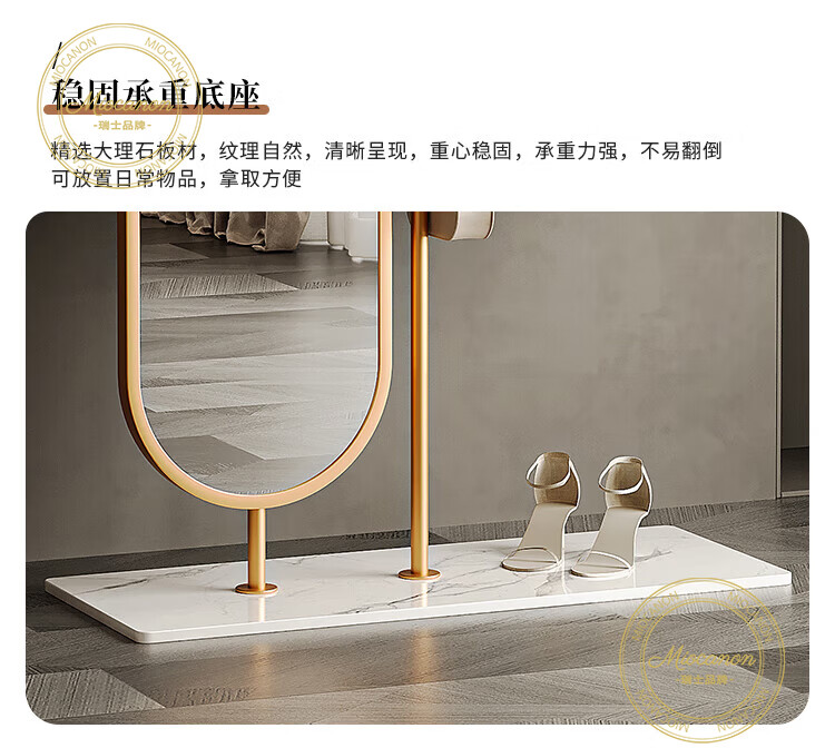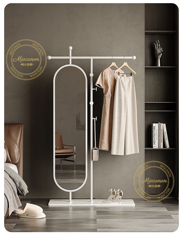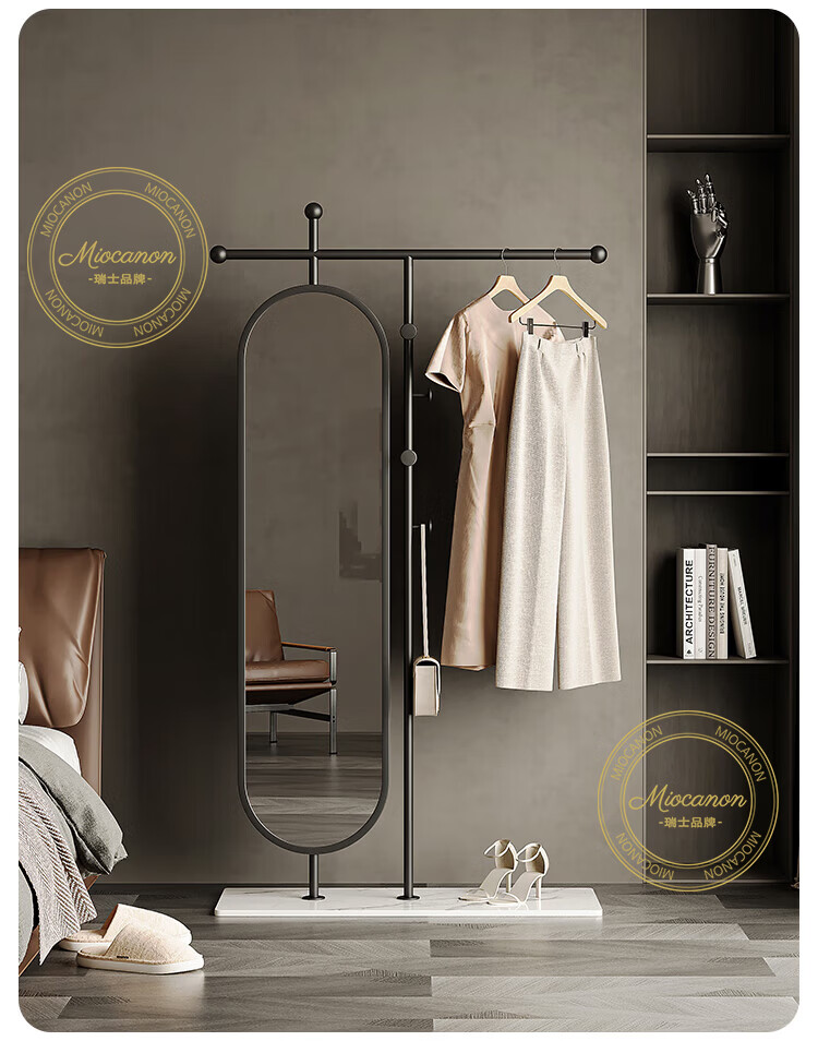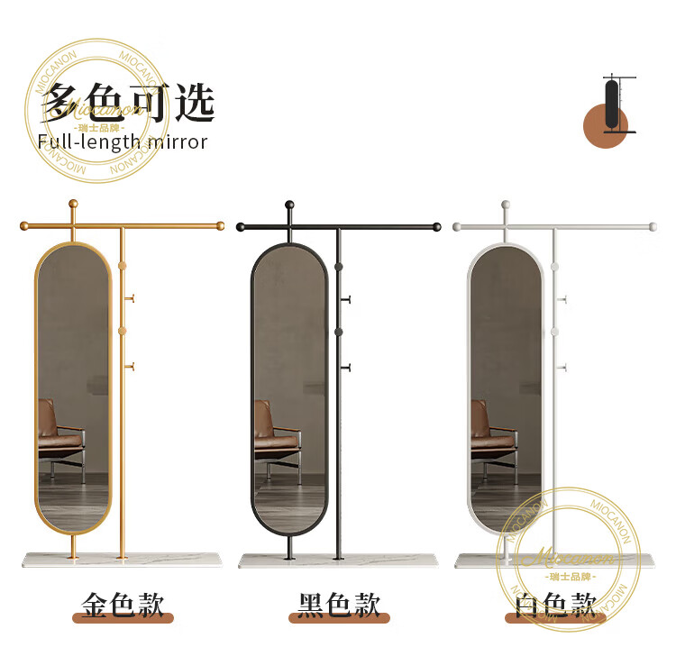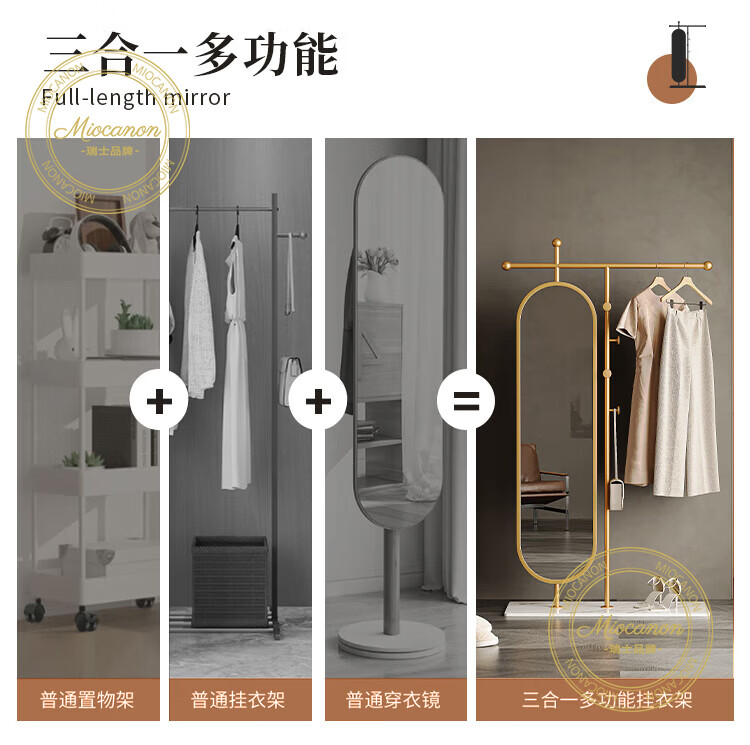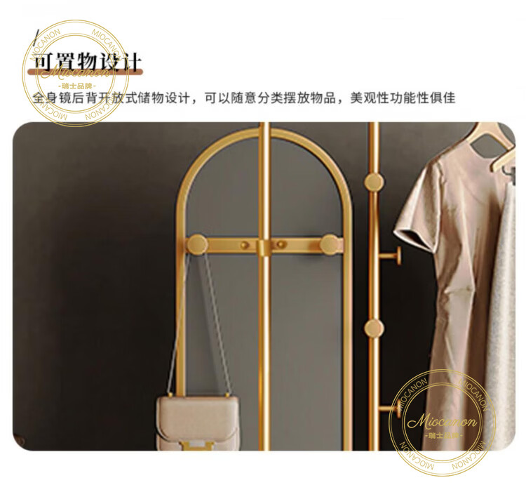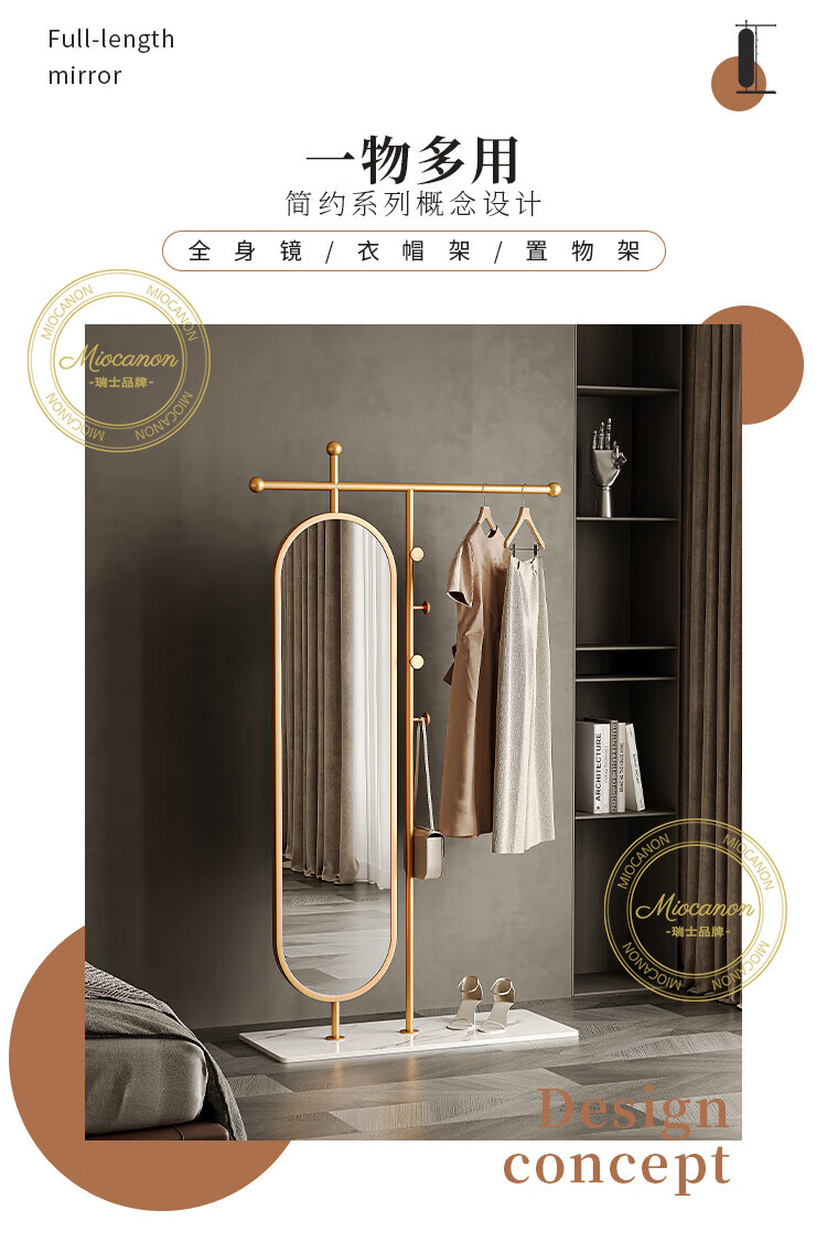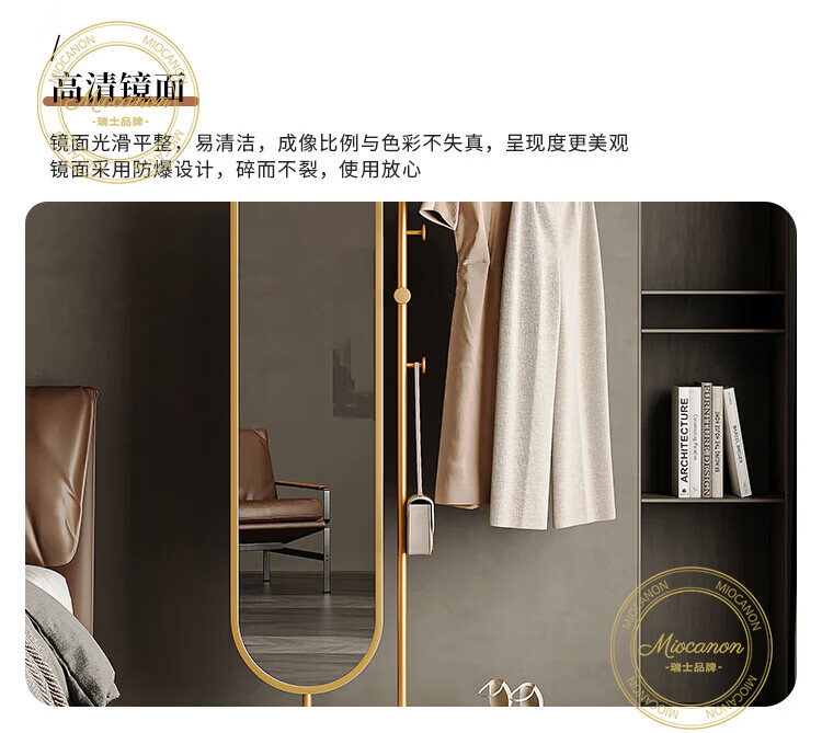 MIOCANON瑞士品牌轻奢衣帽架穿衣镜一体挂衣架落地卧室带镜子可旋转多功能 【金色】衣帽架+360度旋转镜子 长度100m