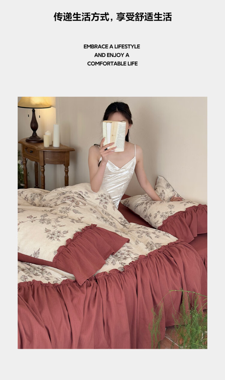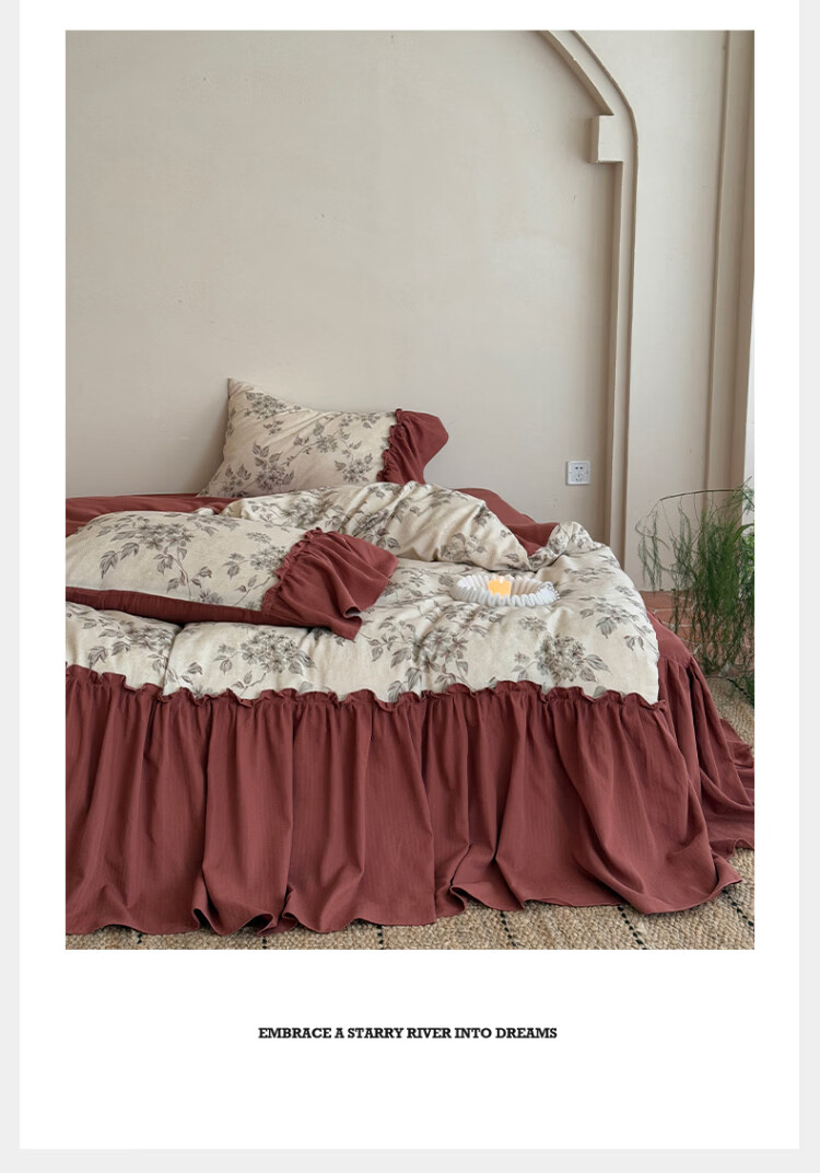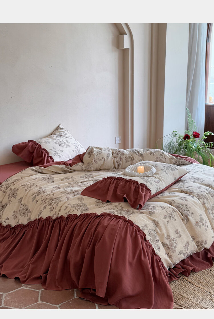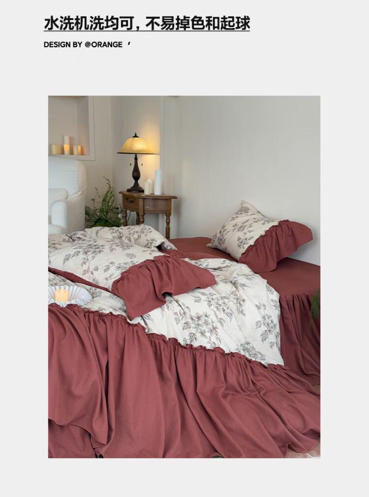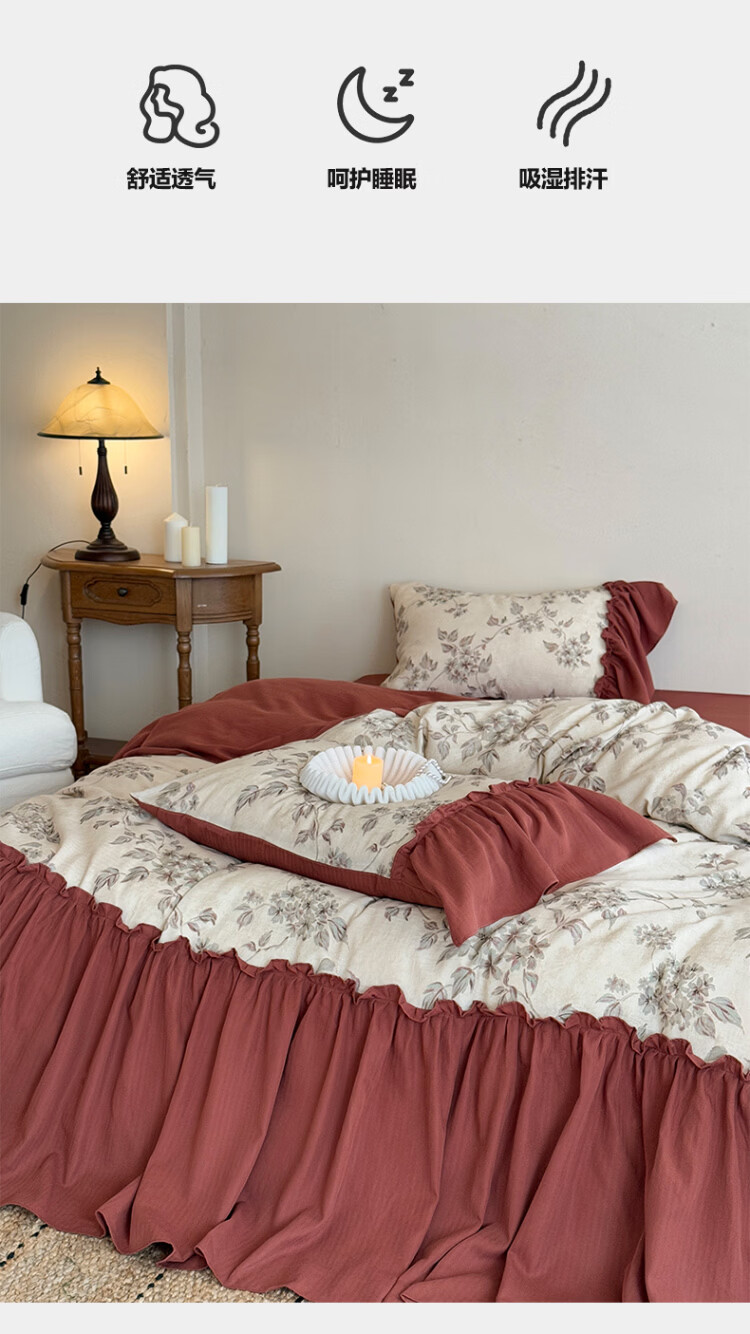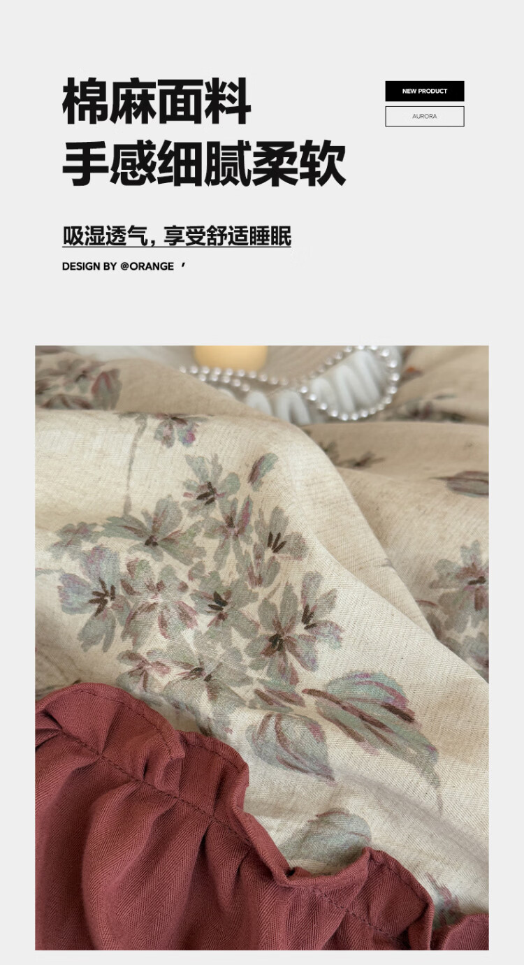 ROLAND LIVE法式复古文艺风棉麻四件套花边被套床裙款少女心透气亲肤床上用品 WL 棉麻四件套-午后蔷薇 1.5米床 床裙款 【被套200*230cm】