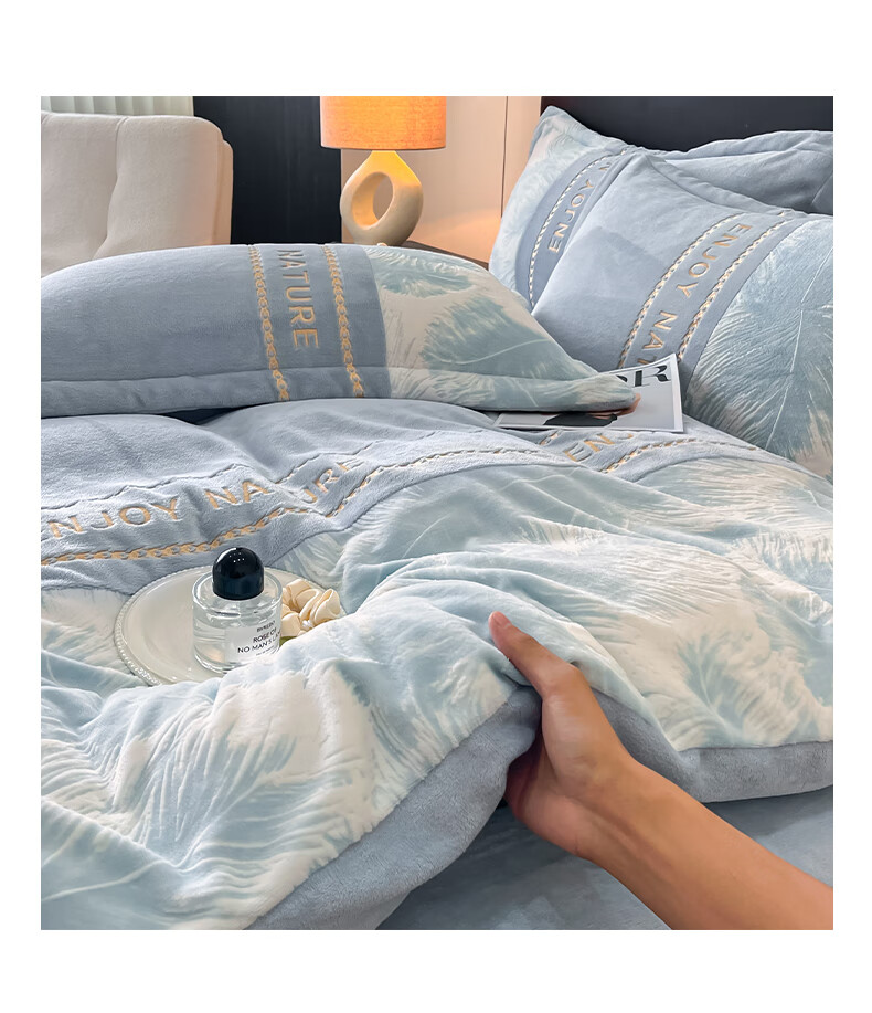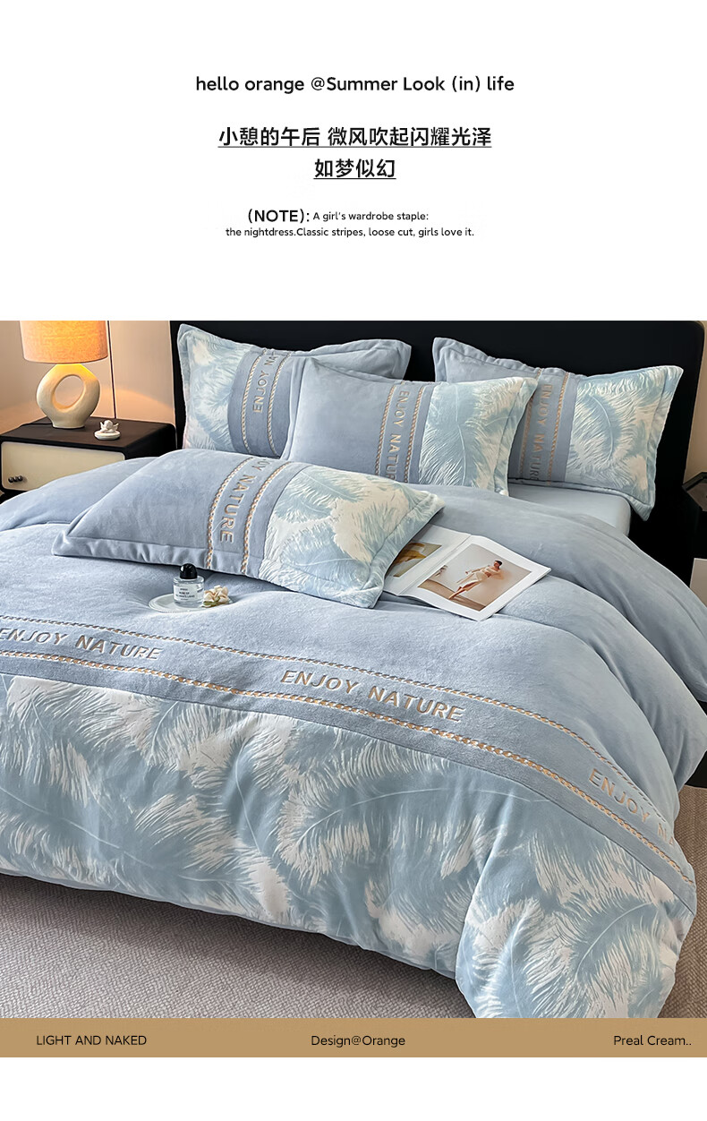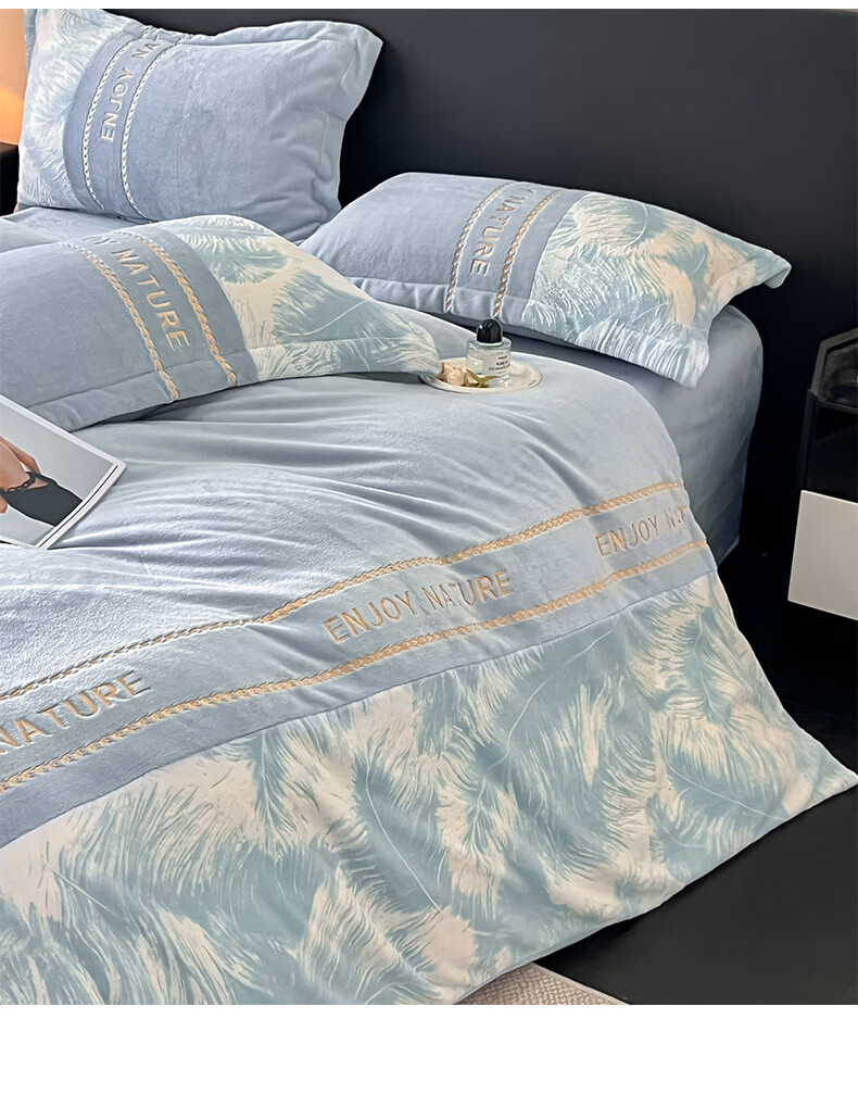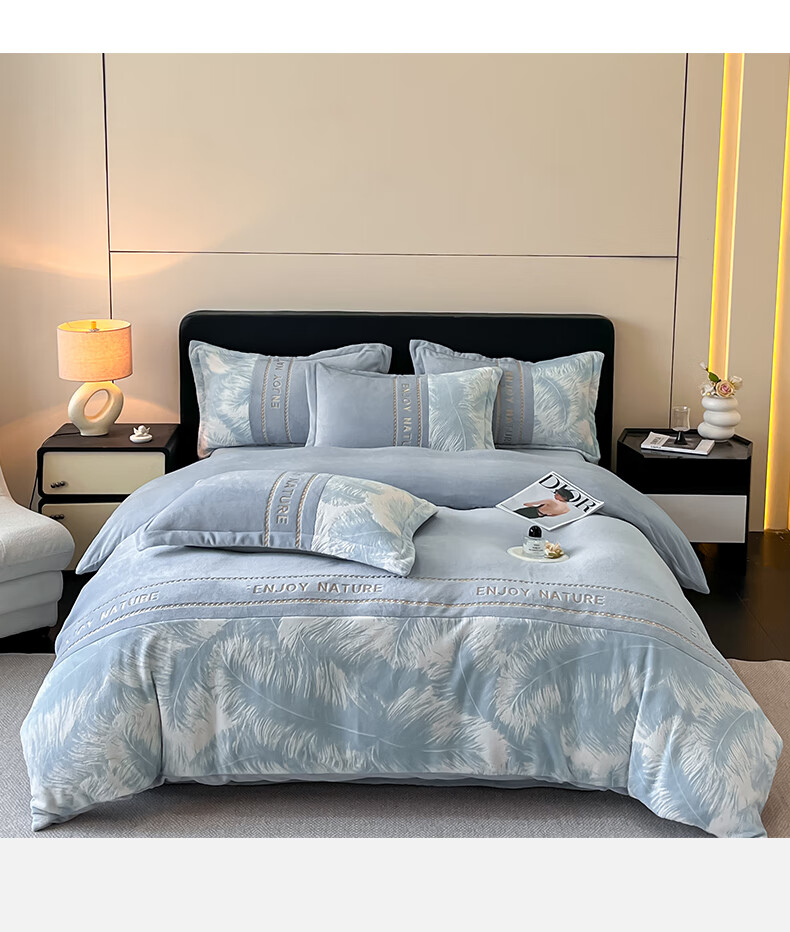 VJE轻奢高级感牛奶绒床上四件套秋冬季珊瑚绒法兰绒双面加绒被套床单 飞羽-繁星蓝 三件套1.2m 床单款 -被套150*200cm