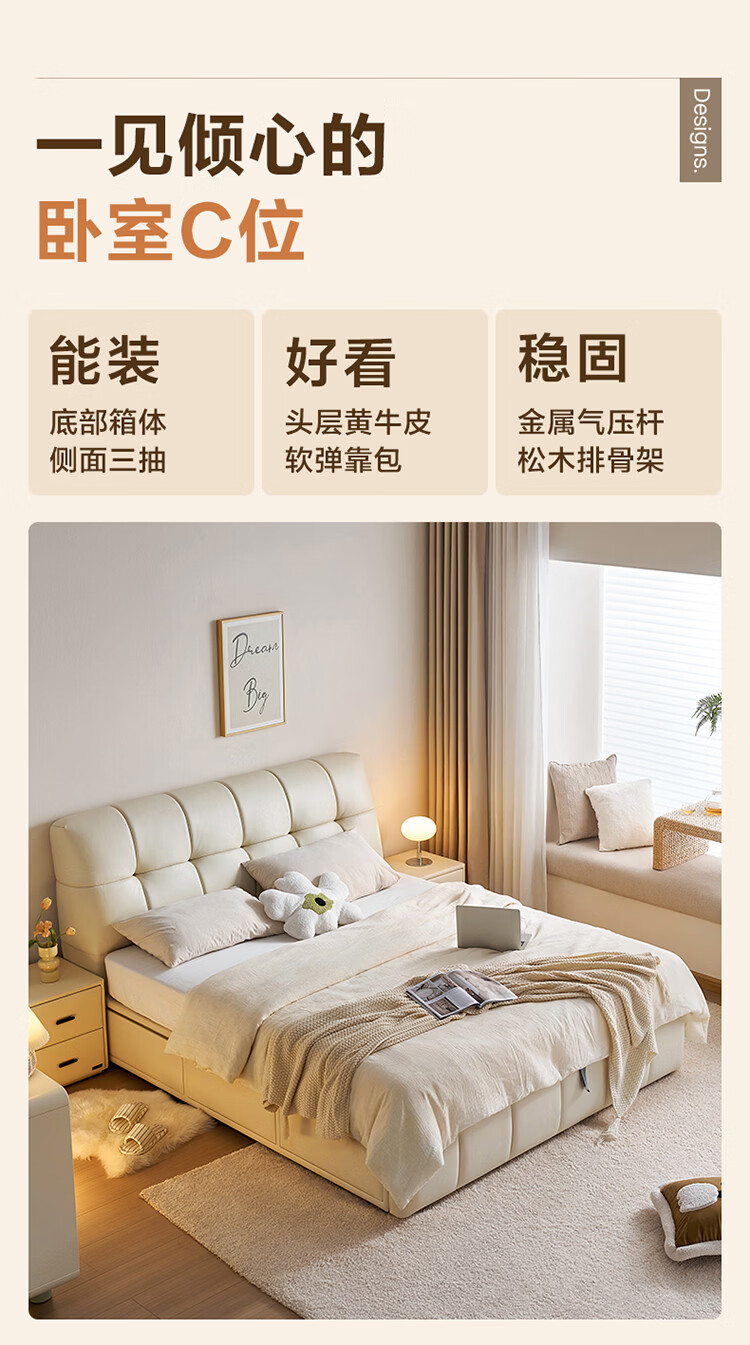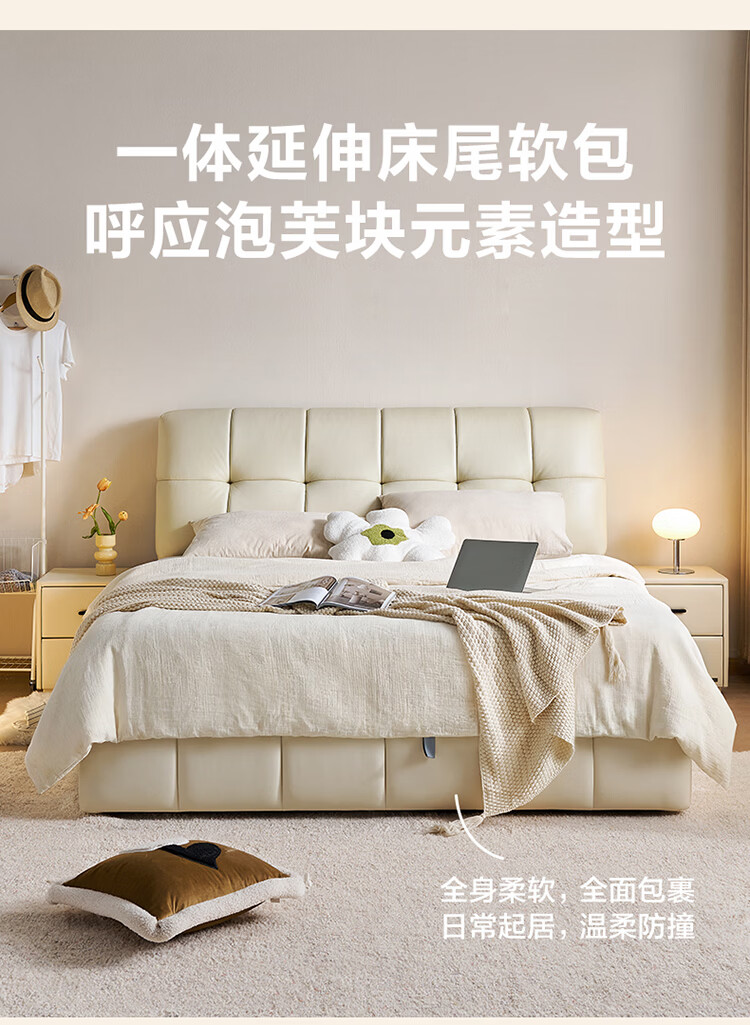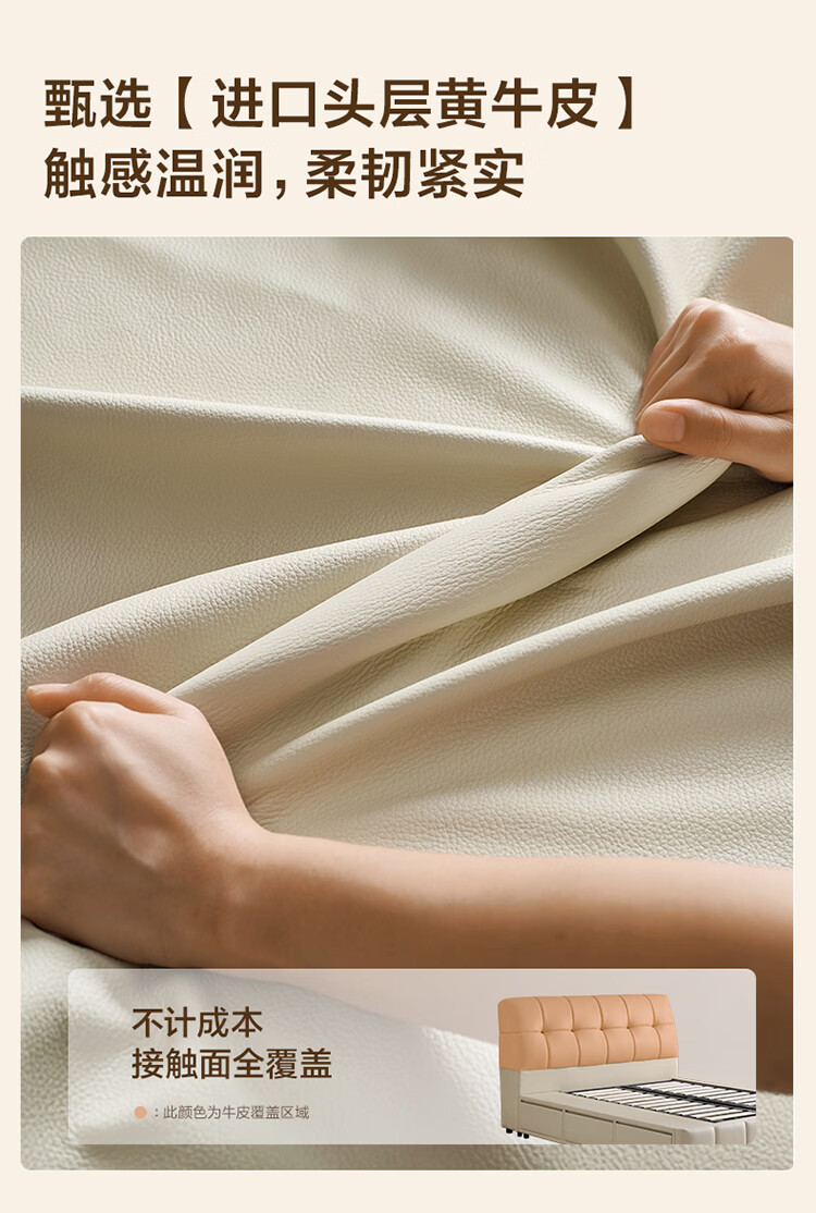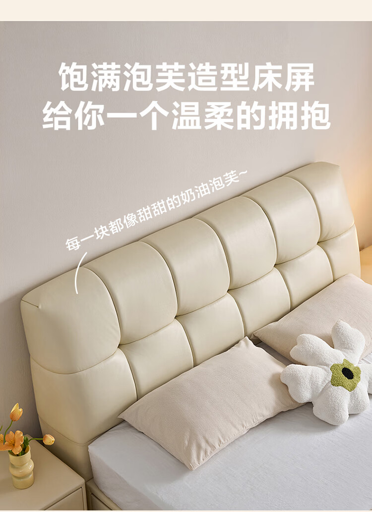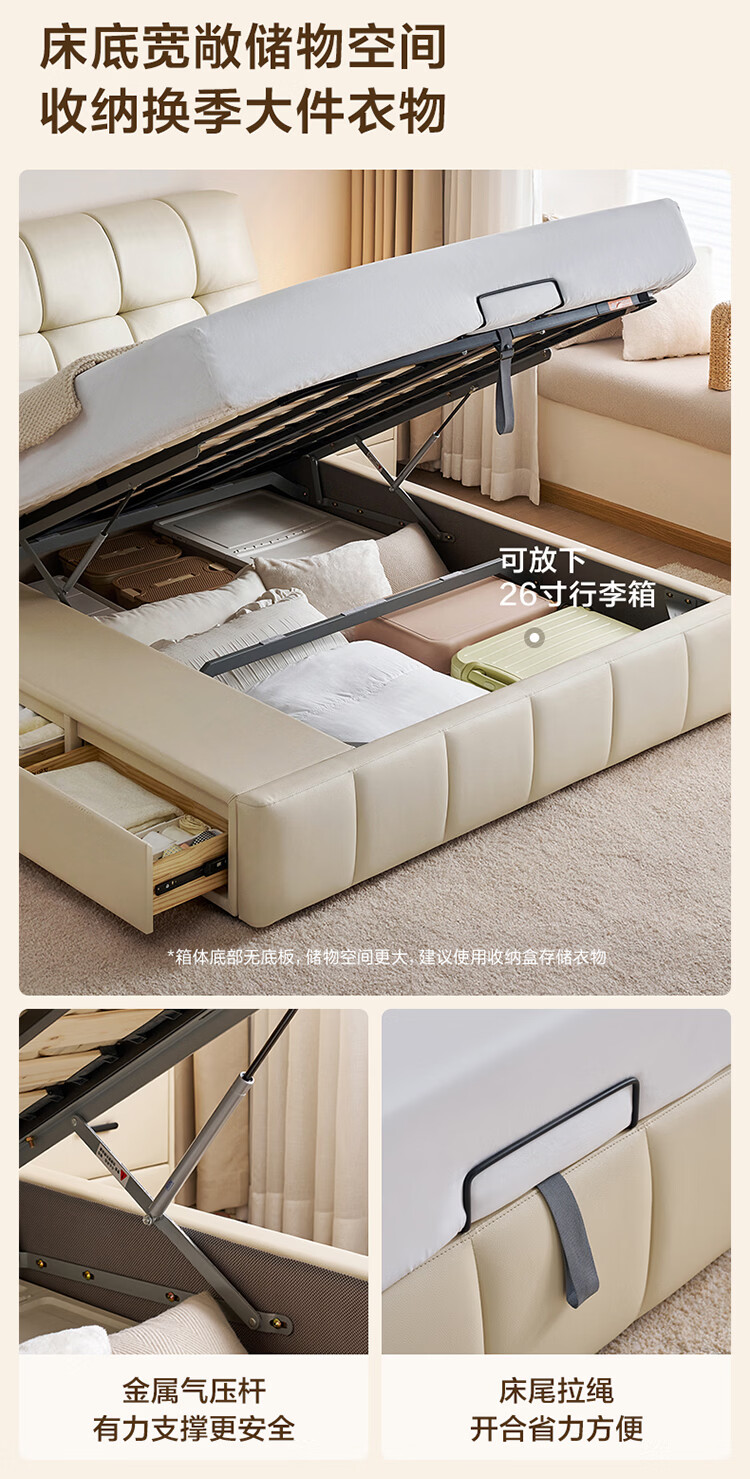 全友家居奶油风2026新款头层牛皮大床卧室高箱真皮储物床双人床小户型 正向储物皮床 1.5米x2米 单床