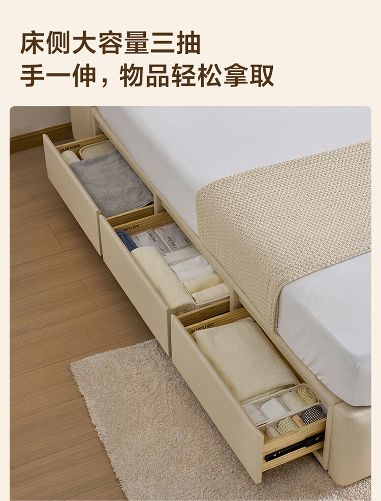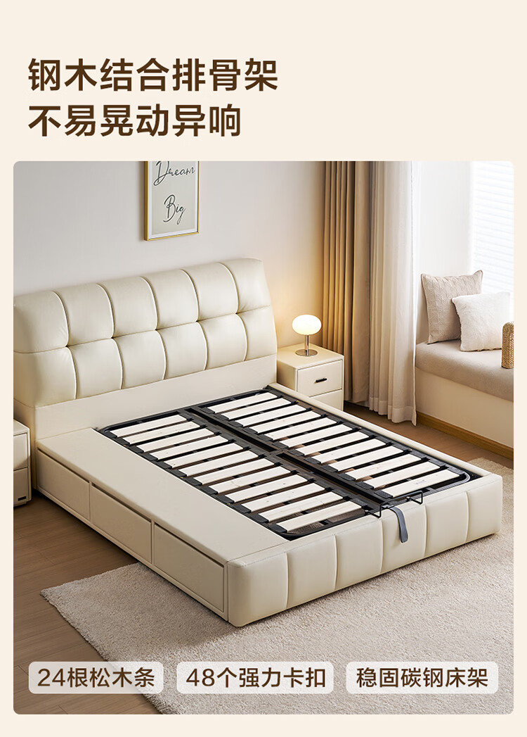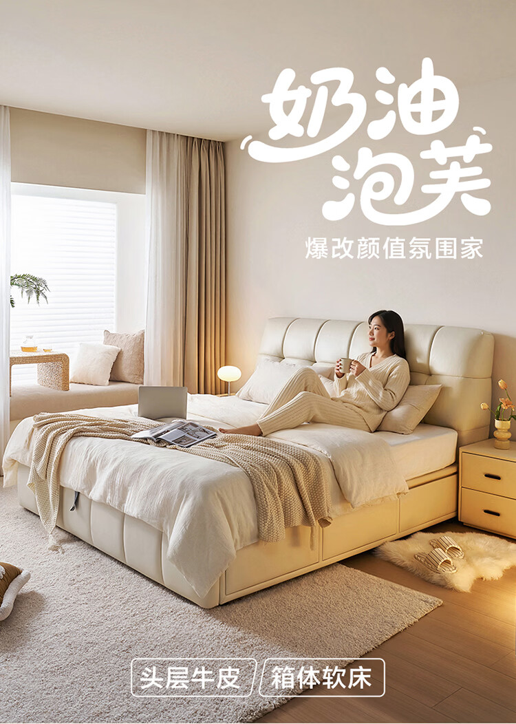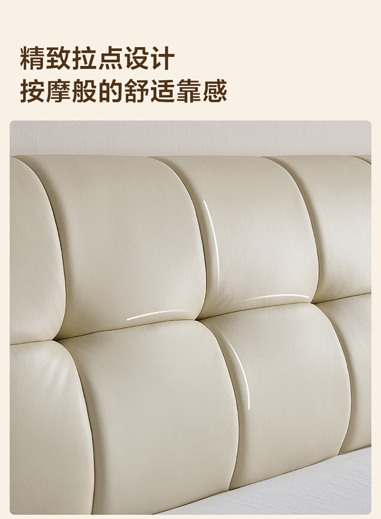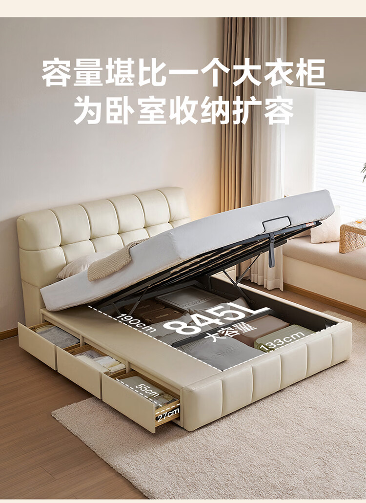 全友家居奶油风2026新款头层牛皮大床卧室高箱真皮储物床双人床小户型 正向储物皮床 1.5米x2米 单床
