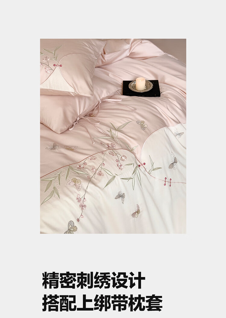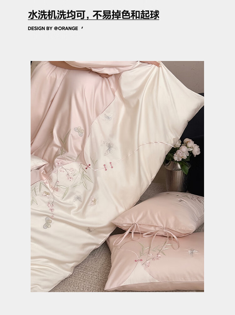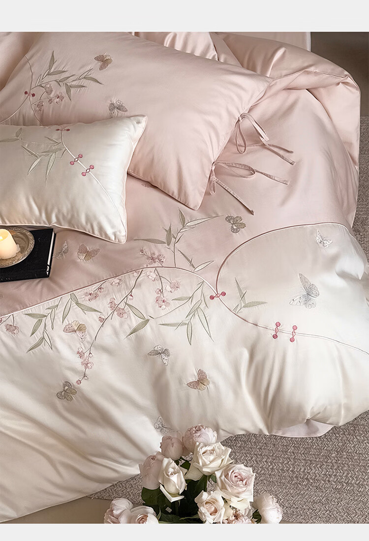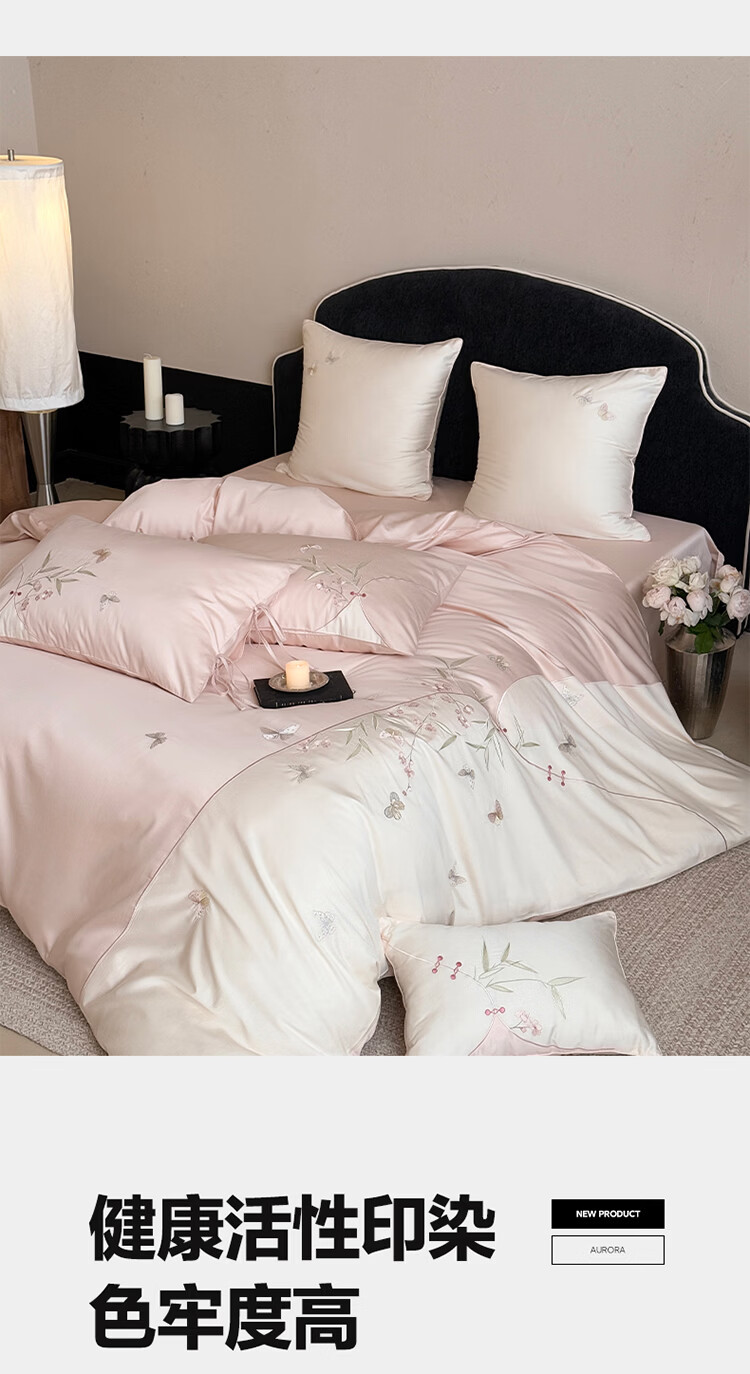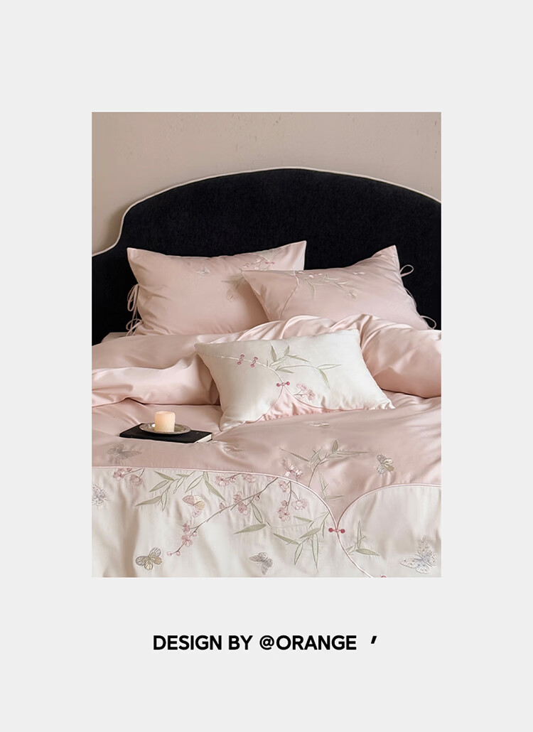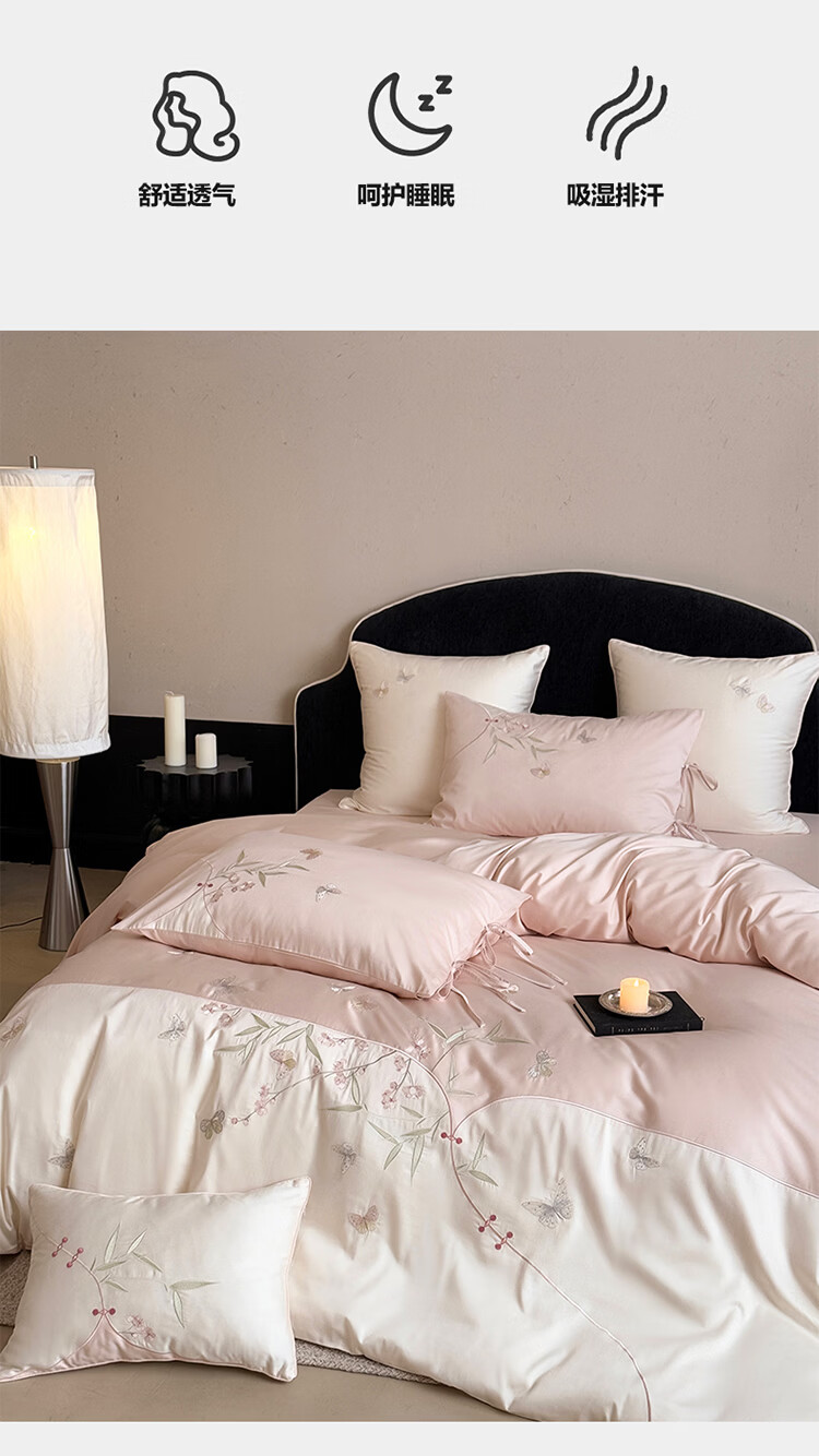 ROLAND LIVE轻奢长绒棉刺绣四件套全棉少女心被套床单裸睡1.8m床透气纯棉套件 LB 长绒棉刺绣套件-花影摇曳粉色 1.2米床 床单款 【被套150*200cm】