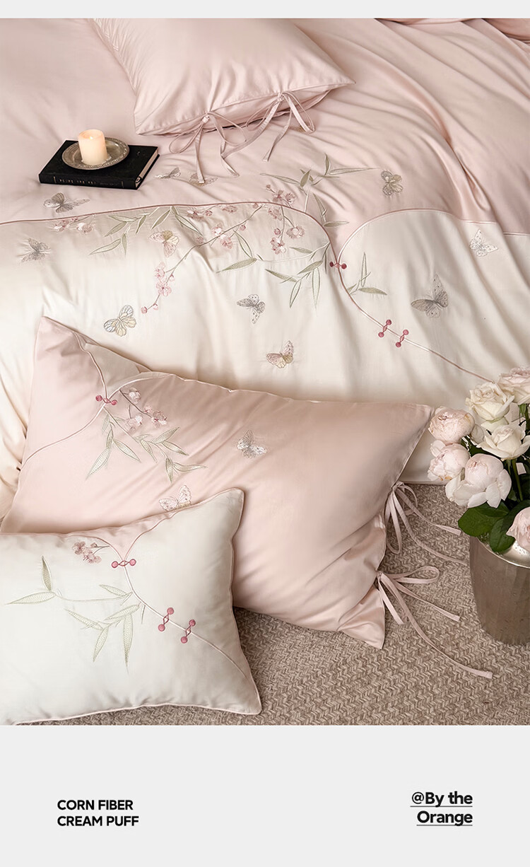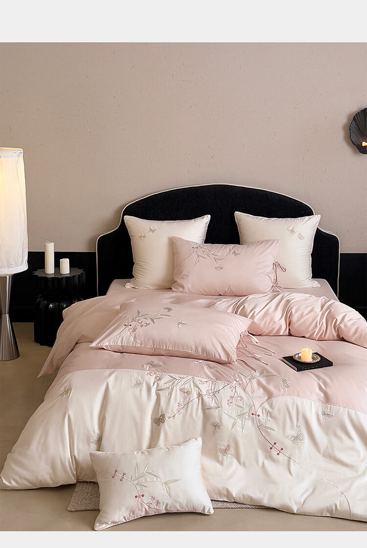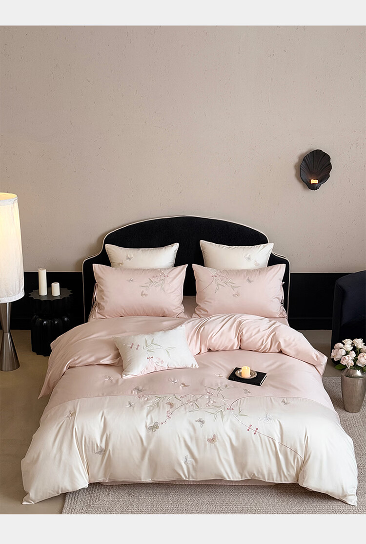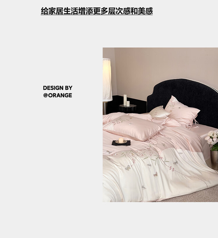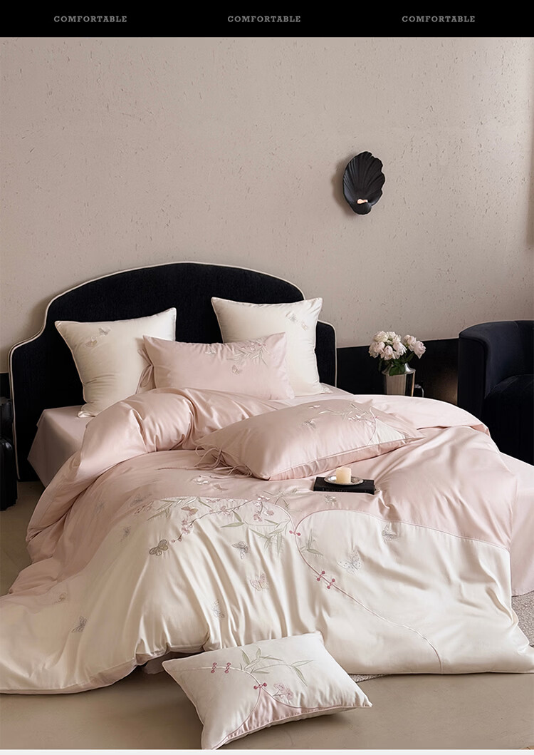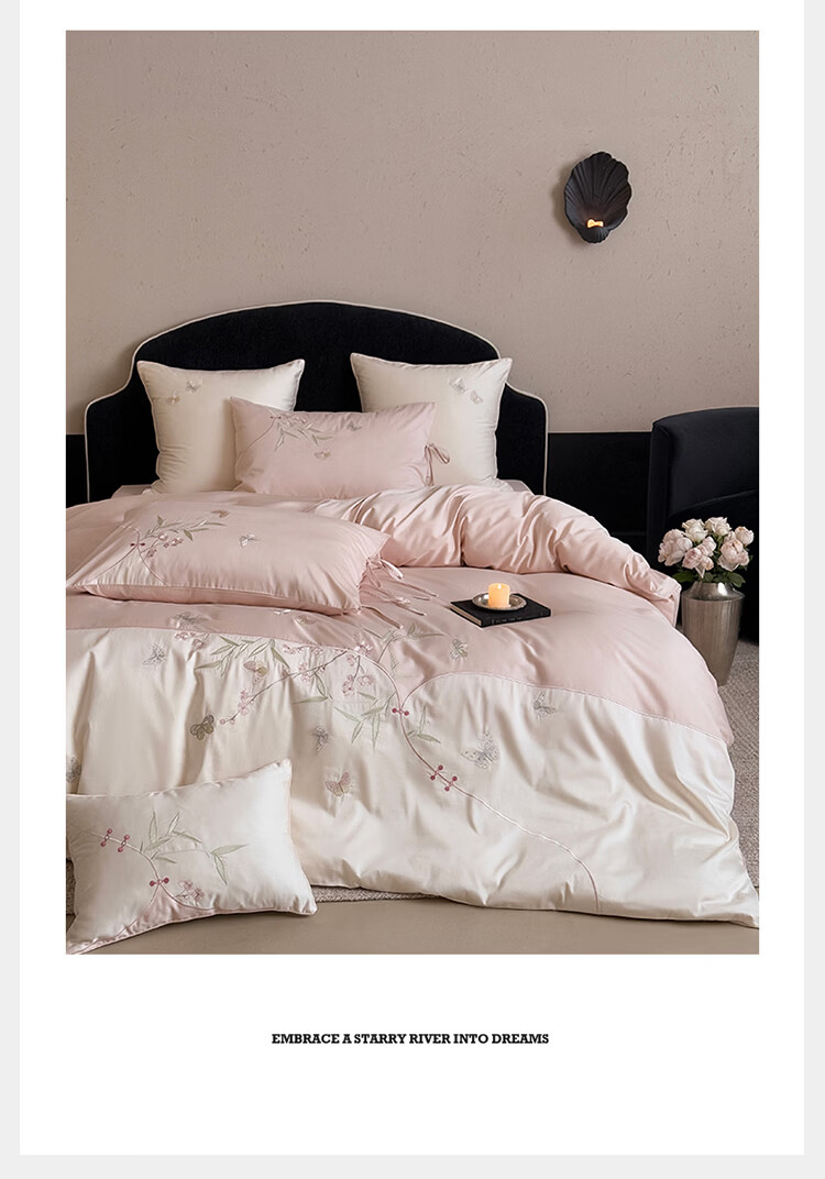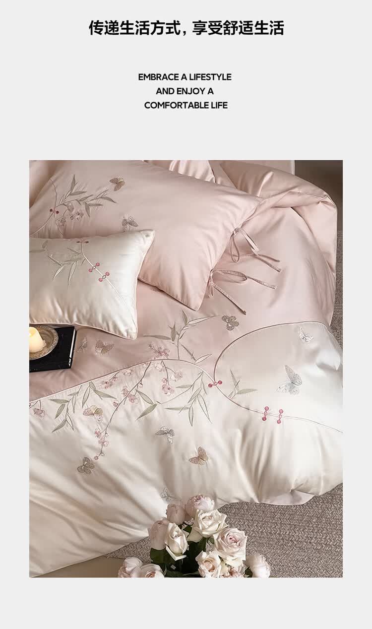 ROLAND LIVE轻奢长绒棉刺绣四件套全棉少女心被套床单裸睡1.8m床透气纯棉套件 LB 长绒棉刺绣套件-花影摇曳粉色 1.2米床 床单款 【被套150*200cm】
