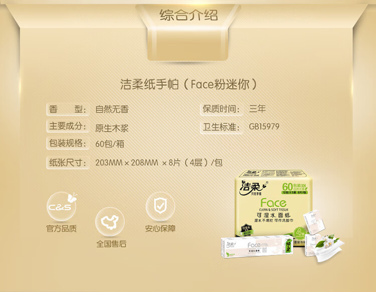 洁柔手帕纸 粉Face4层8片12包*5条纸巾小包经典无香柔韧 整箱销售