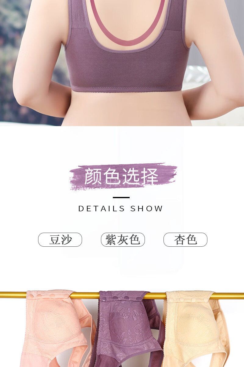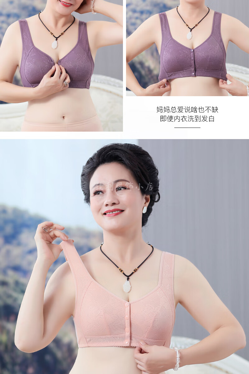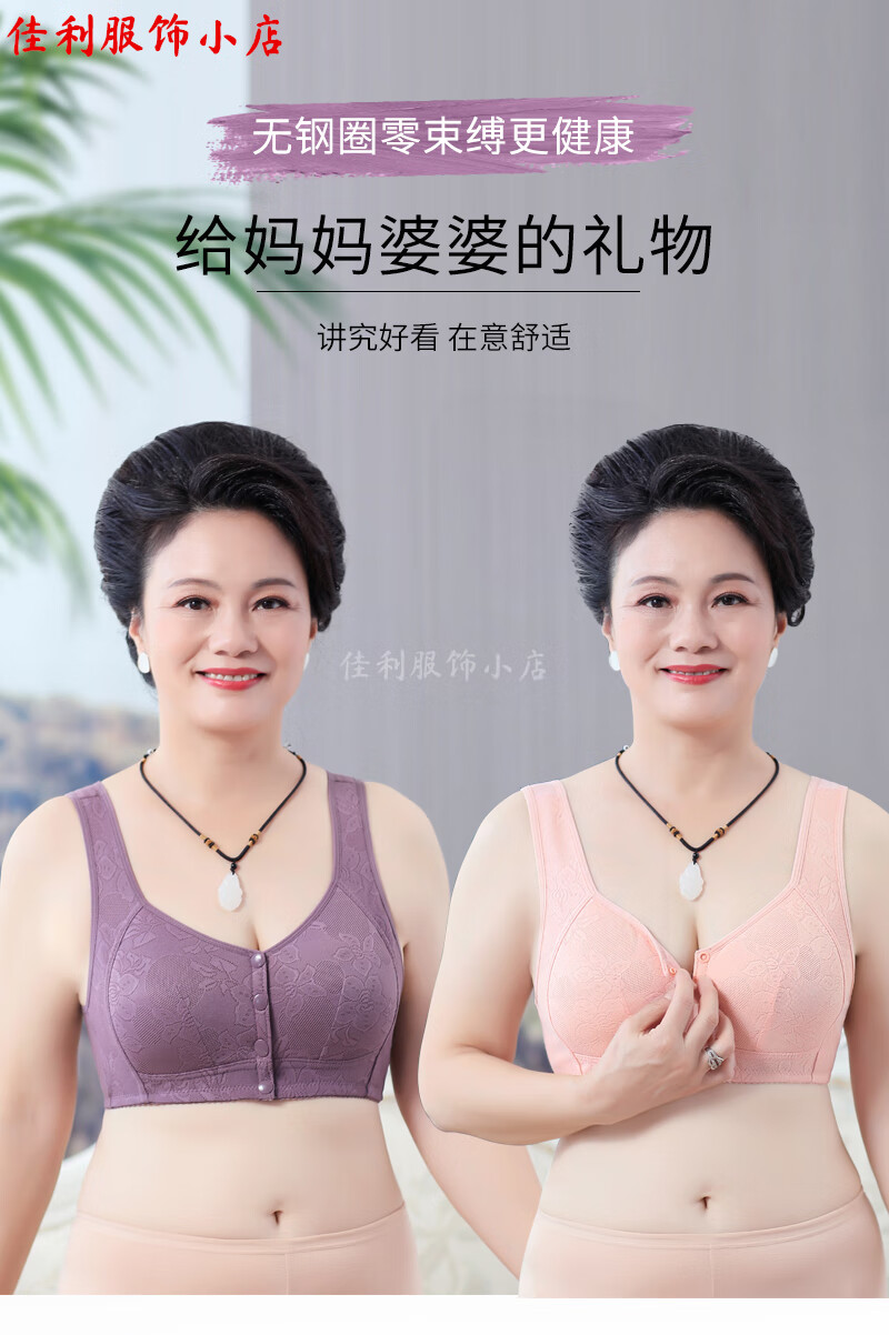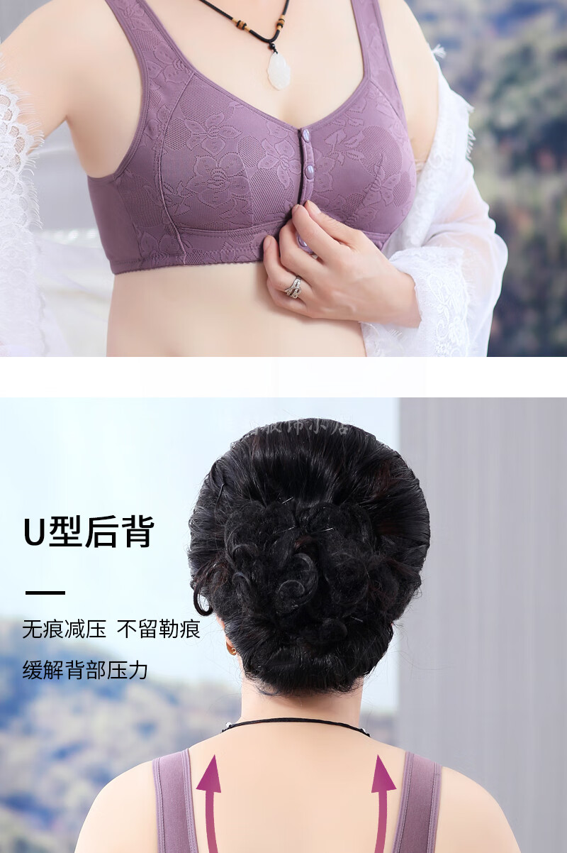 中年妈妈前开扣无钢圈文胸薄款聚拢防下垂睡眠胸罩背心式内衣女夏 紫灰+杏色【2件裝】 42码【建议120-133斤】