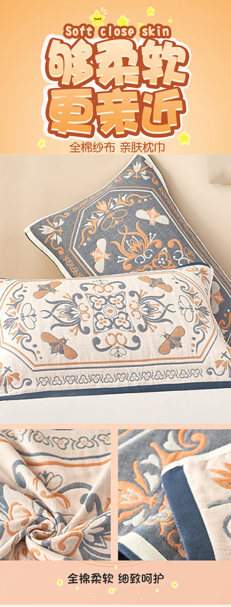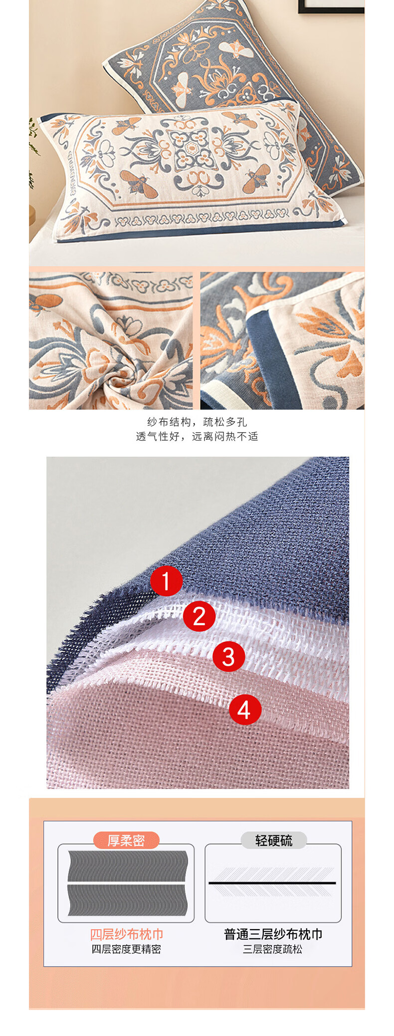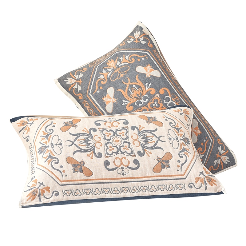 枕巾纱布棉52*78透气吸汗高档加厚柔软四季枕头巾 金色花园 78cm*52cm 一条装