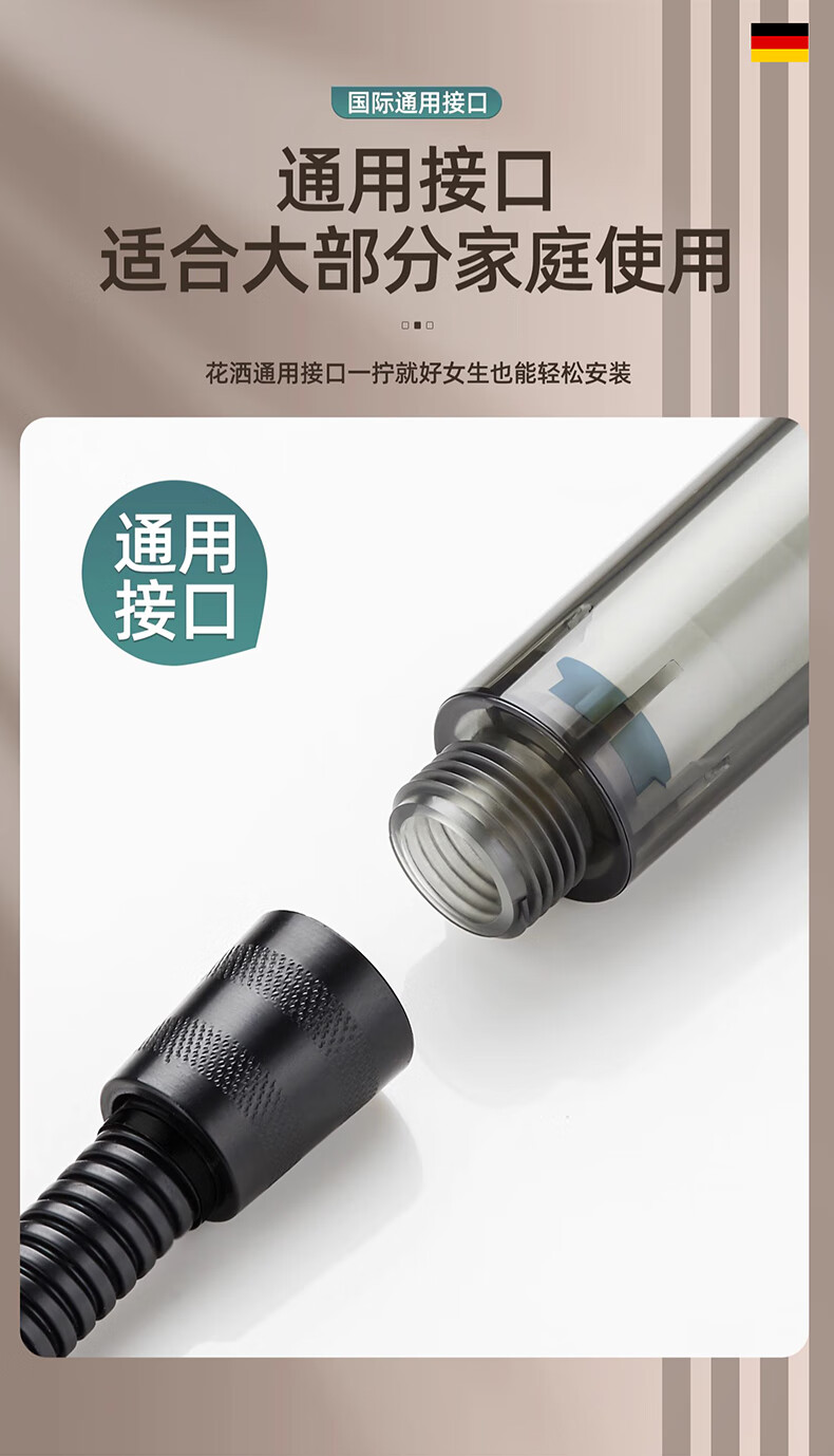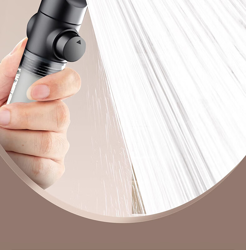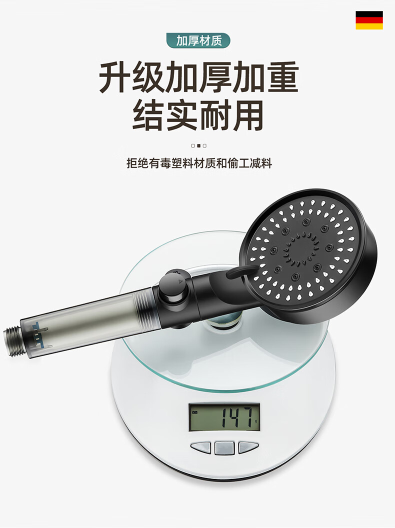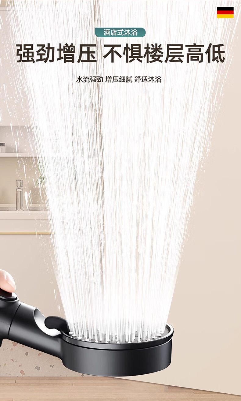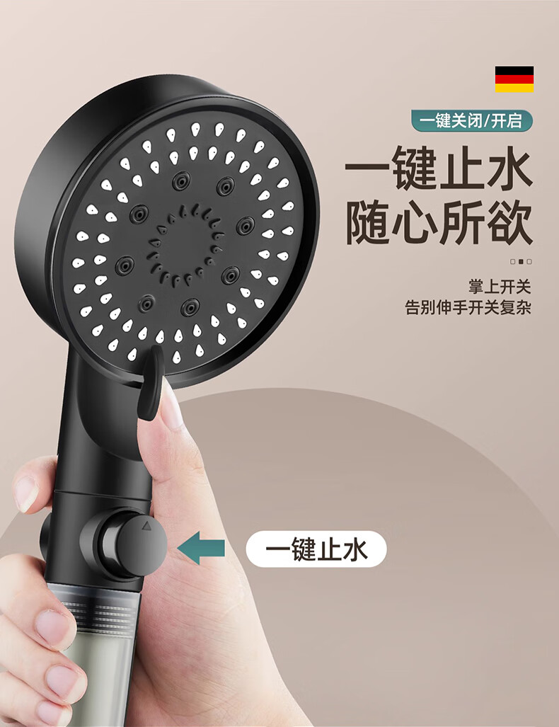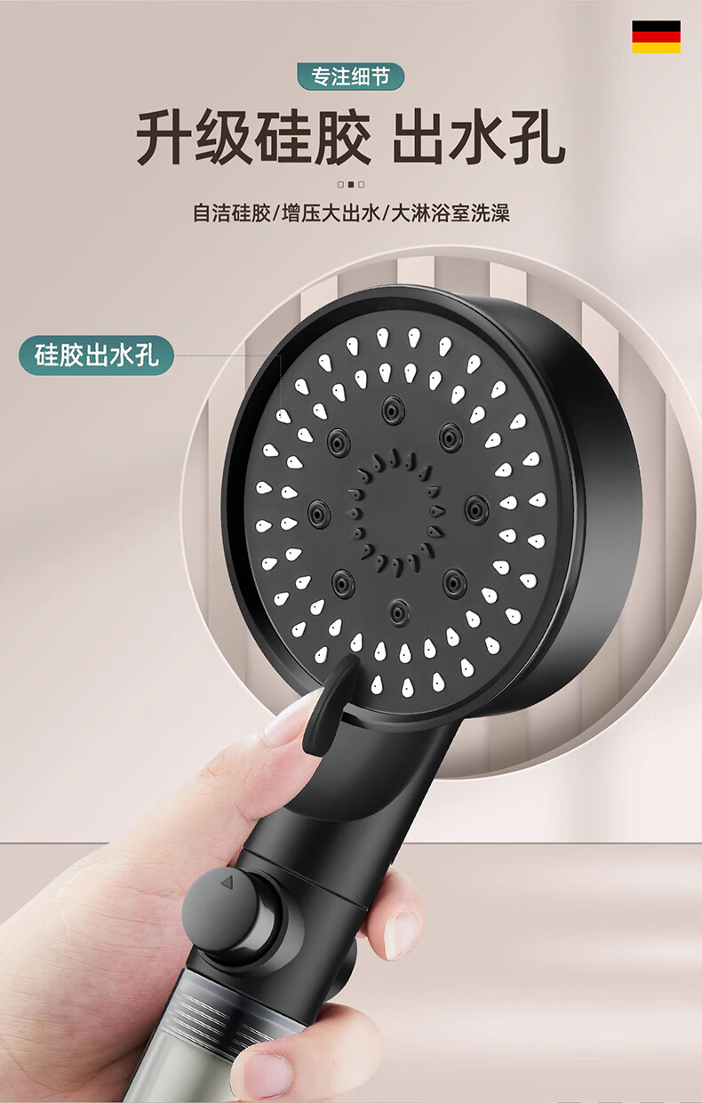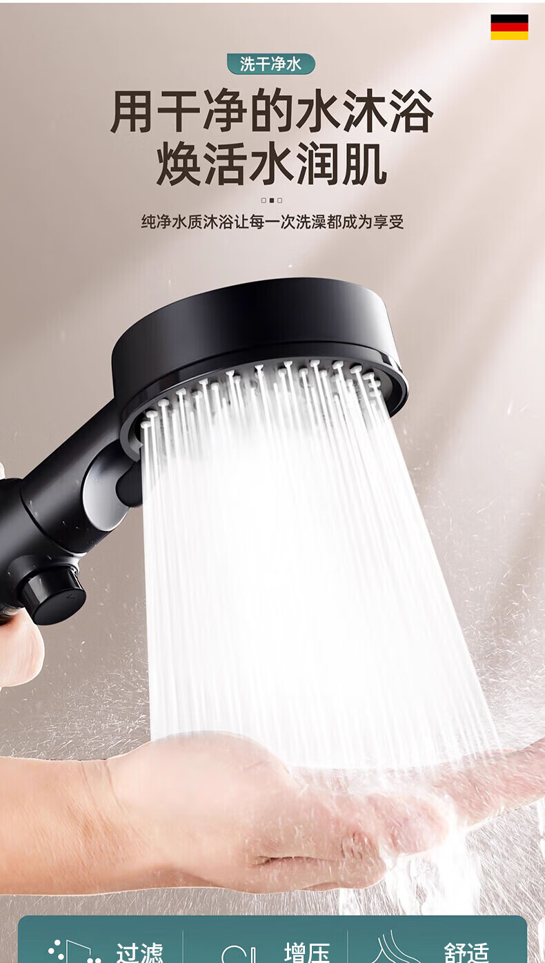 WUZORY【德国】增压花洒喷头淋浴超强大流量过滤洗澡家用止水莲蓬头套装 雅黑-增压过滤花洒三件套 五档调节丨过滤净水丨一键止水