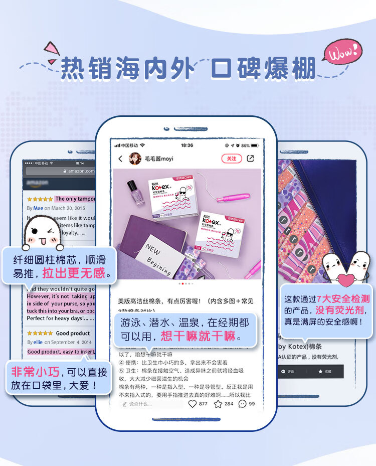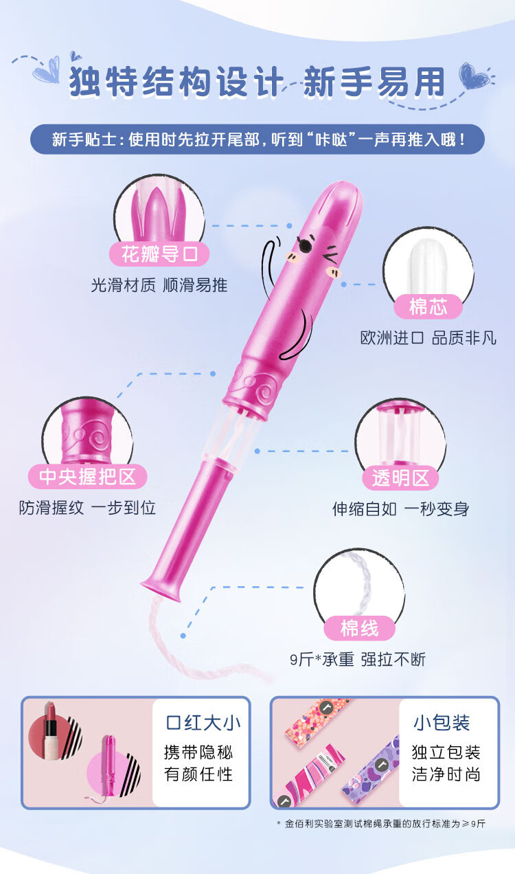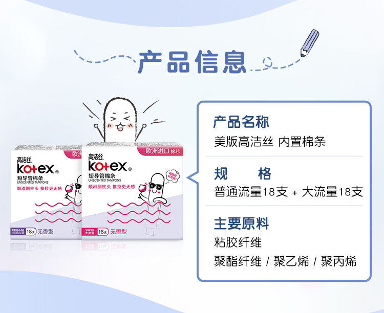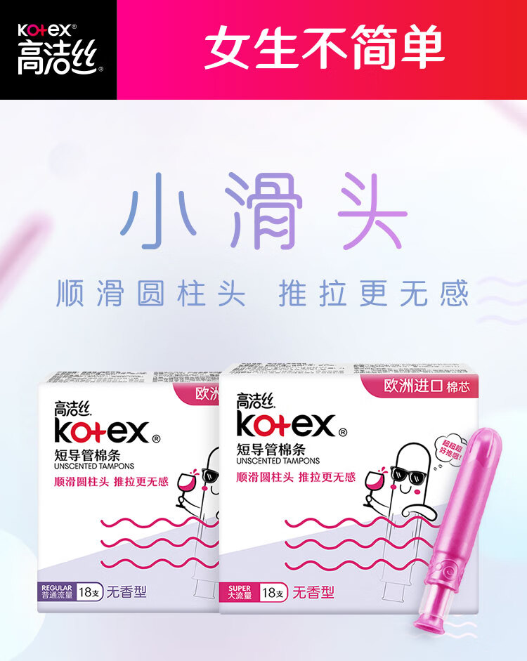 高洁丝(Kotex)导管式卫生棉条 进口棉芯 新手易用顺滑易推 游泳运动型卫生巾 大流量 18支装*3盒