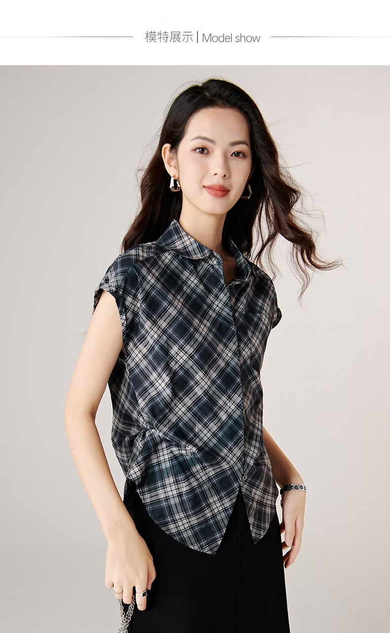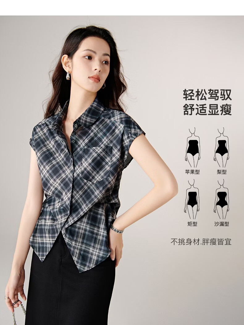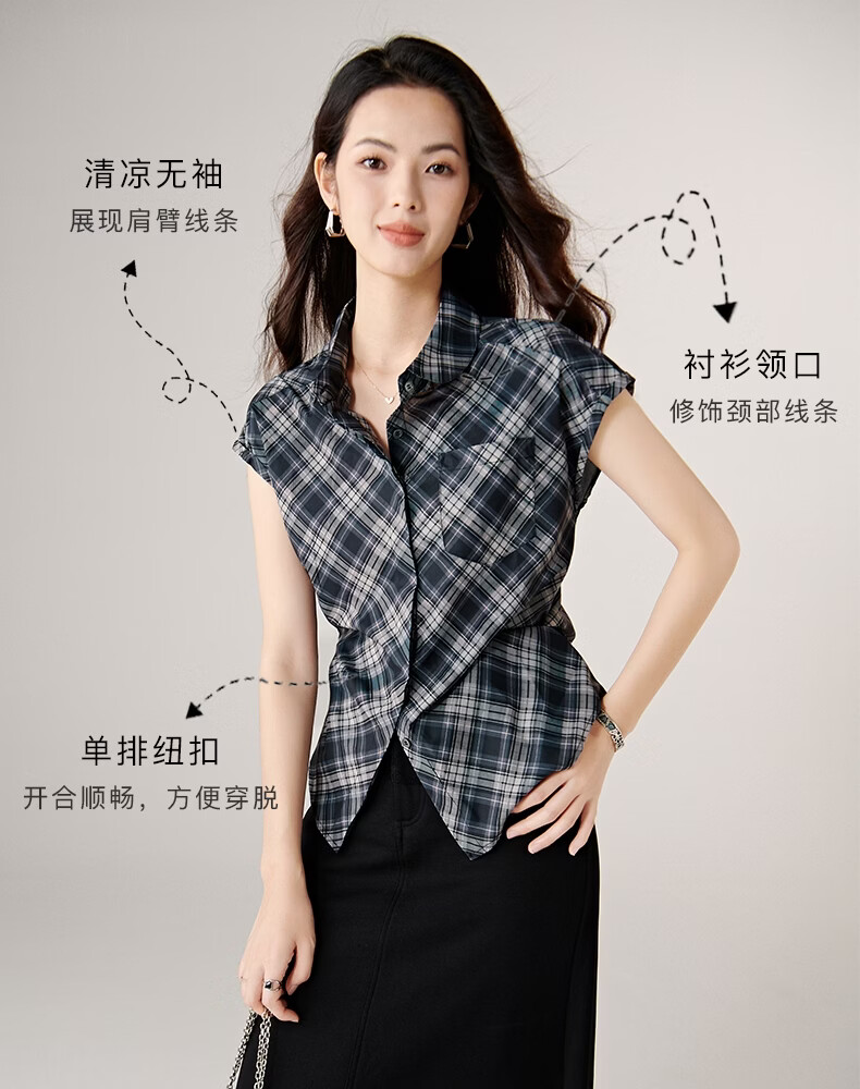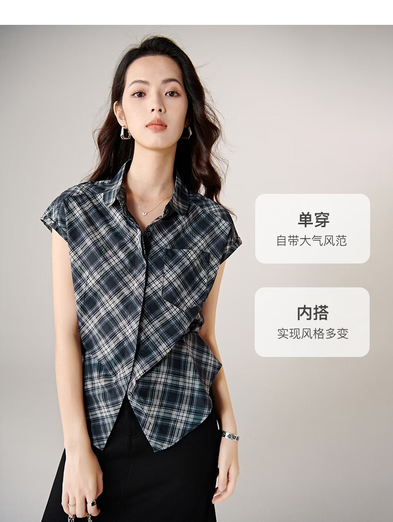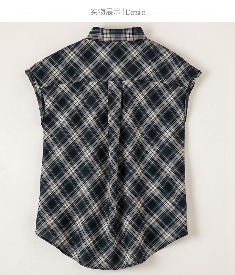 晚白【新品】2026年春款时尚复古格纹上衣挺括利落干练通勤无袖衬衫女 格子 S
