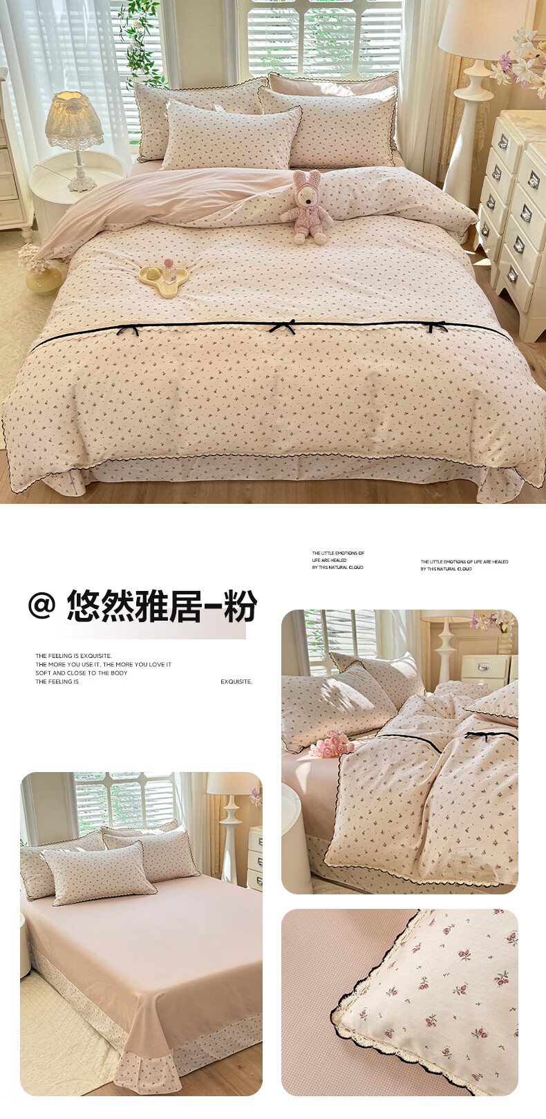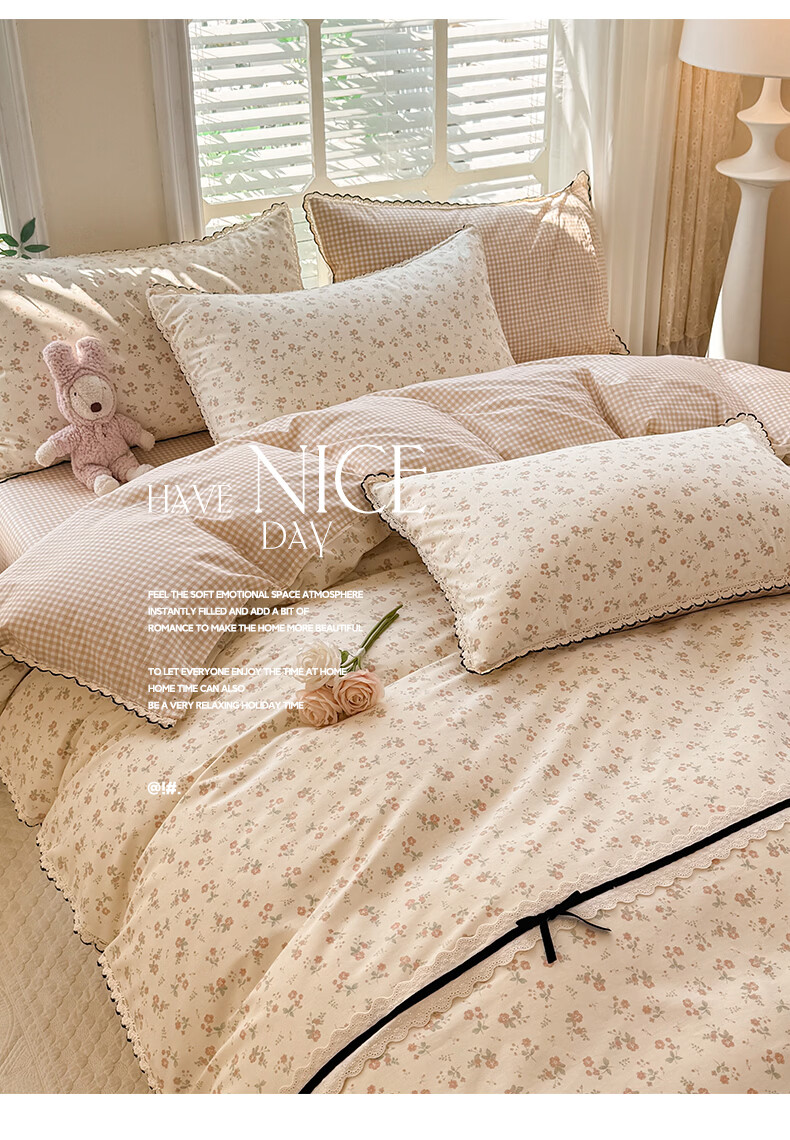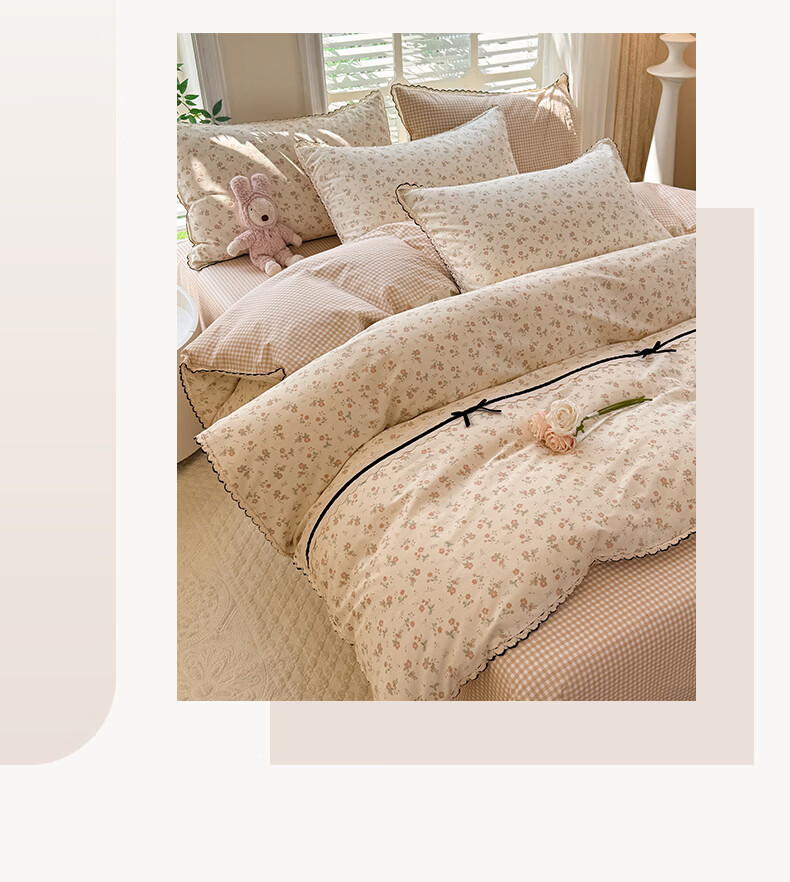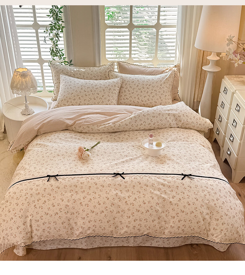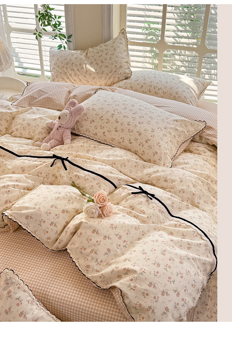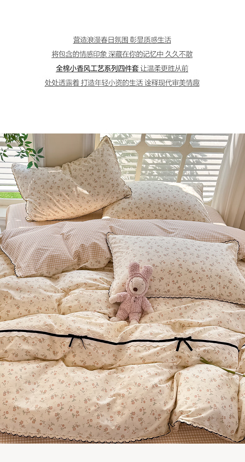 无印良品小清新全棉床上四件套纯棉韩系小碎花被套罩宿舍家用裸睡床单床笠 悠然雅居-粉【触感细腻 柔软亲肤】 1.2m 床单款 四件套 被套150*200cm
