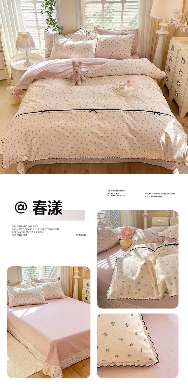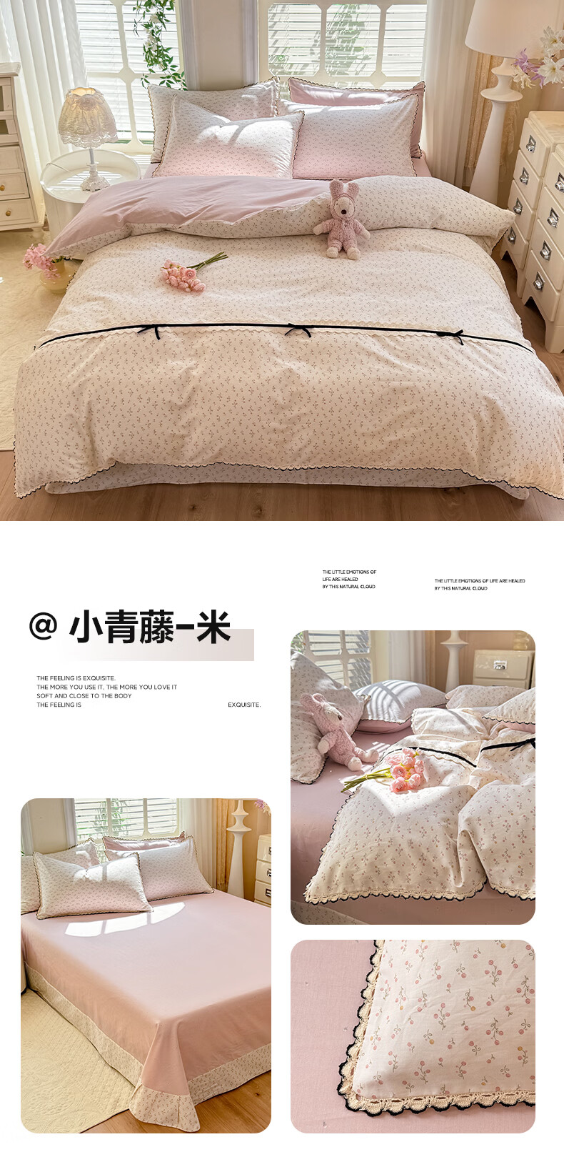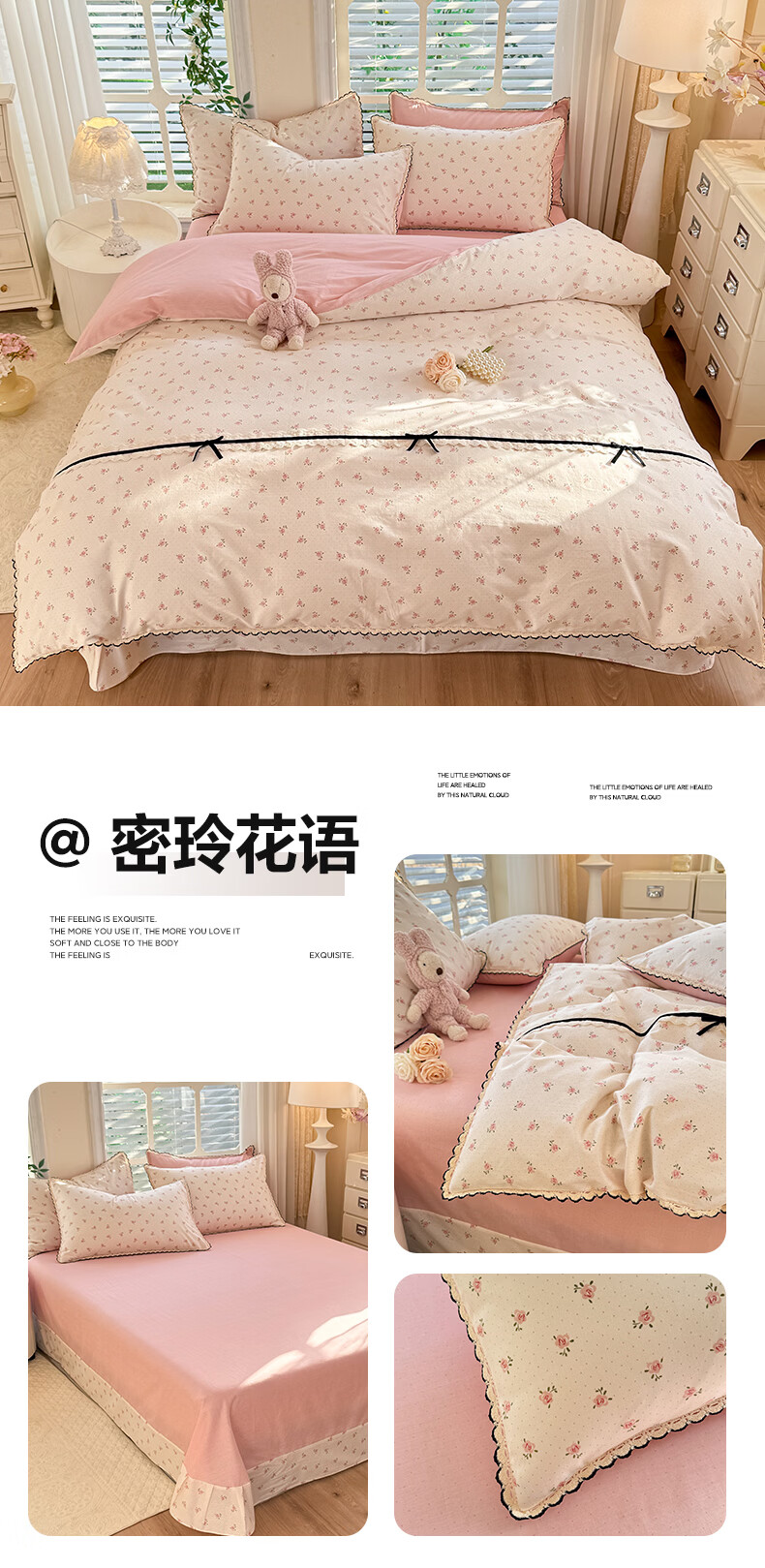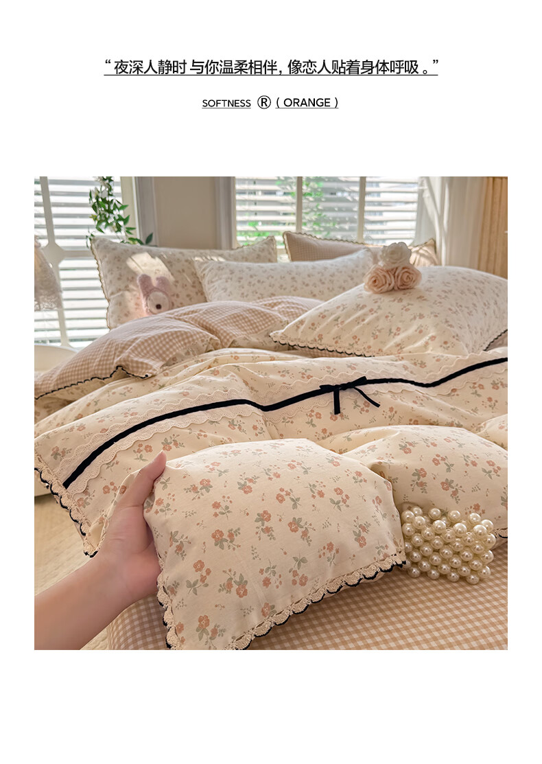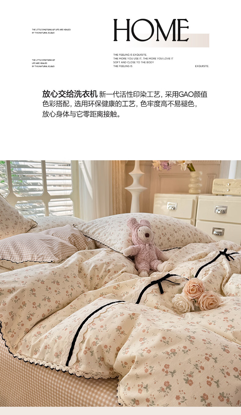 无印良品小清新全棉床上四件套纯棉韩系小碎花被套罩宿舍家用裸睡床单床笠 悠然雅居-粉【触感细腻 柔软亲肤】 1.2m 床单款 四件套 被套150*200cm