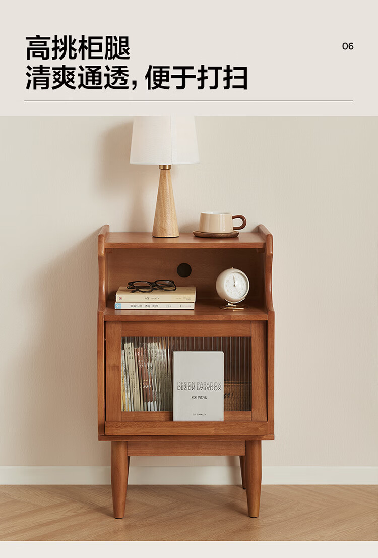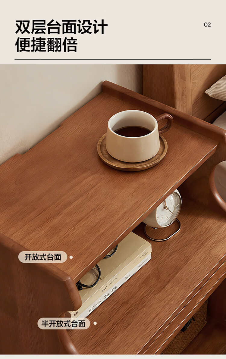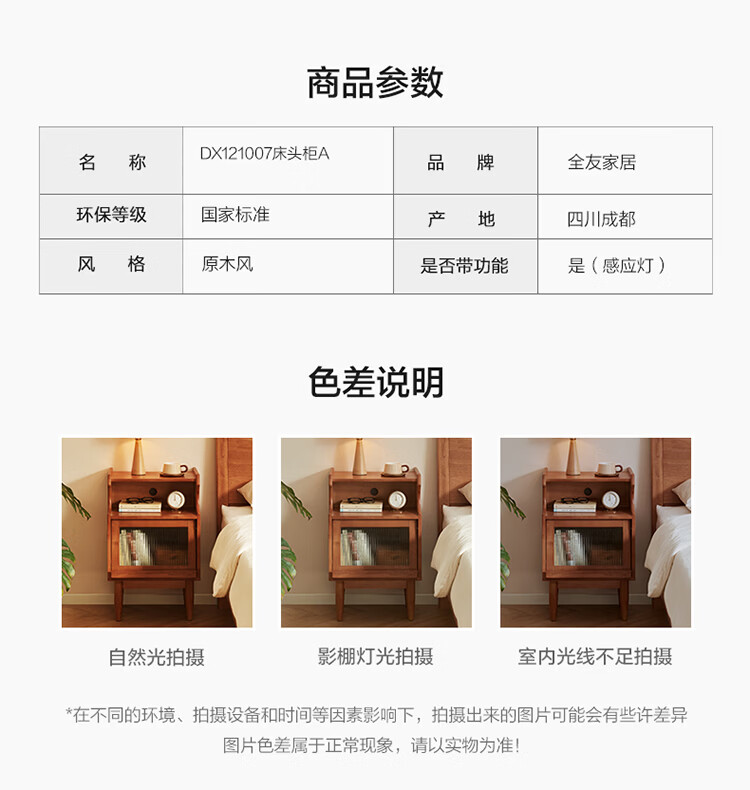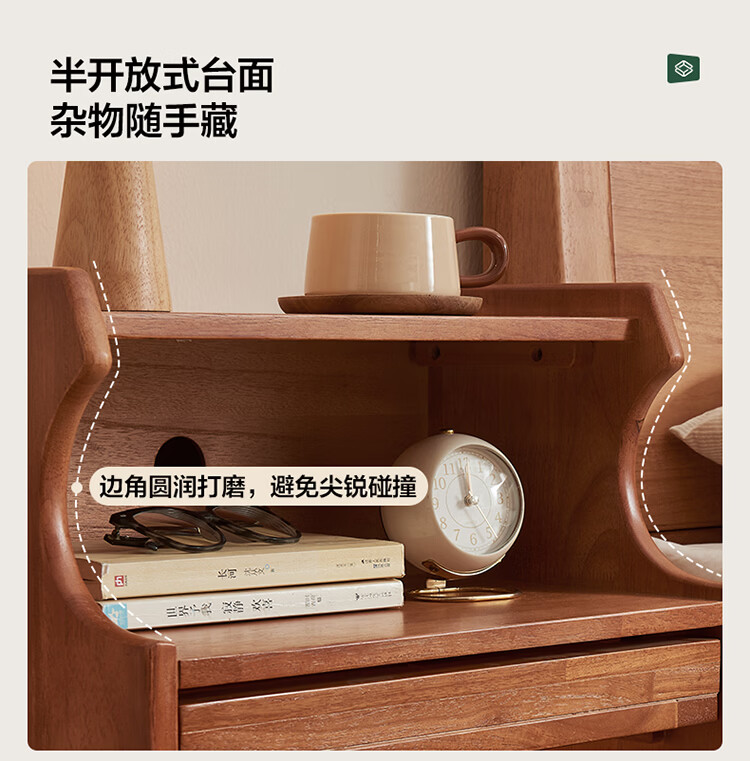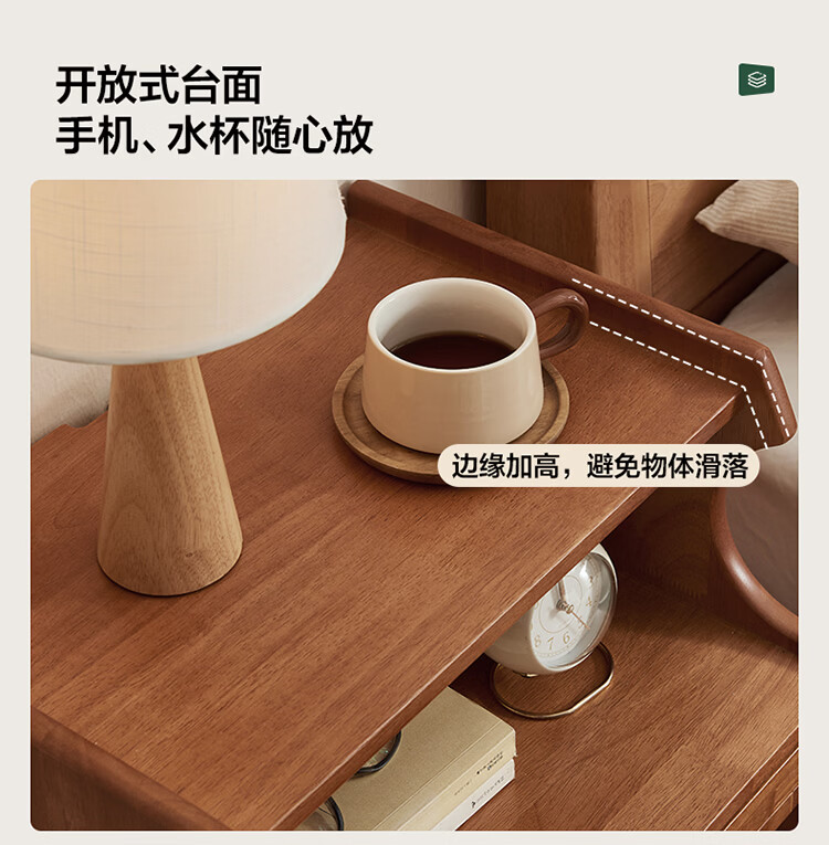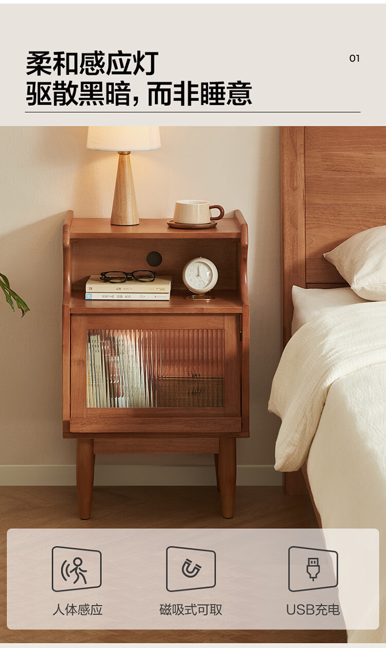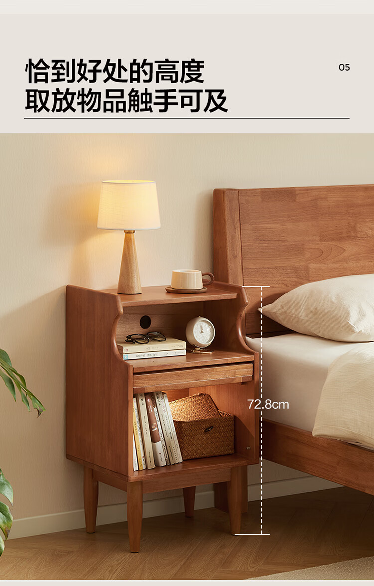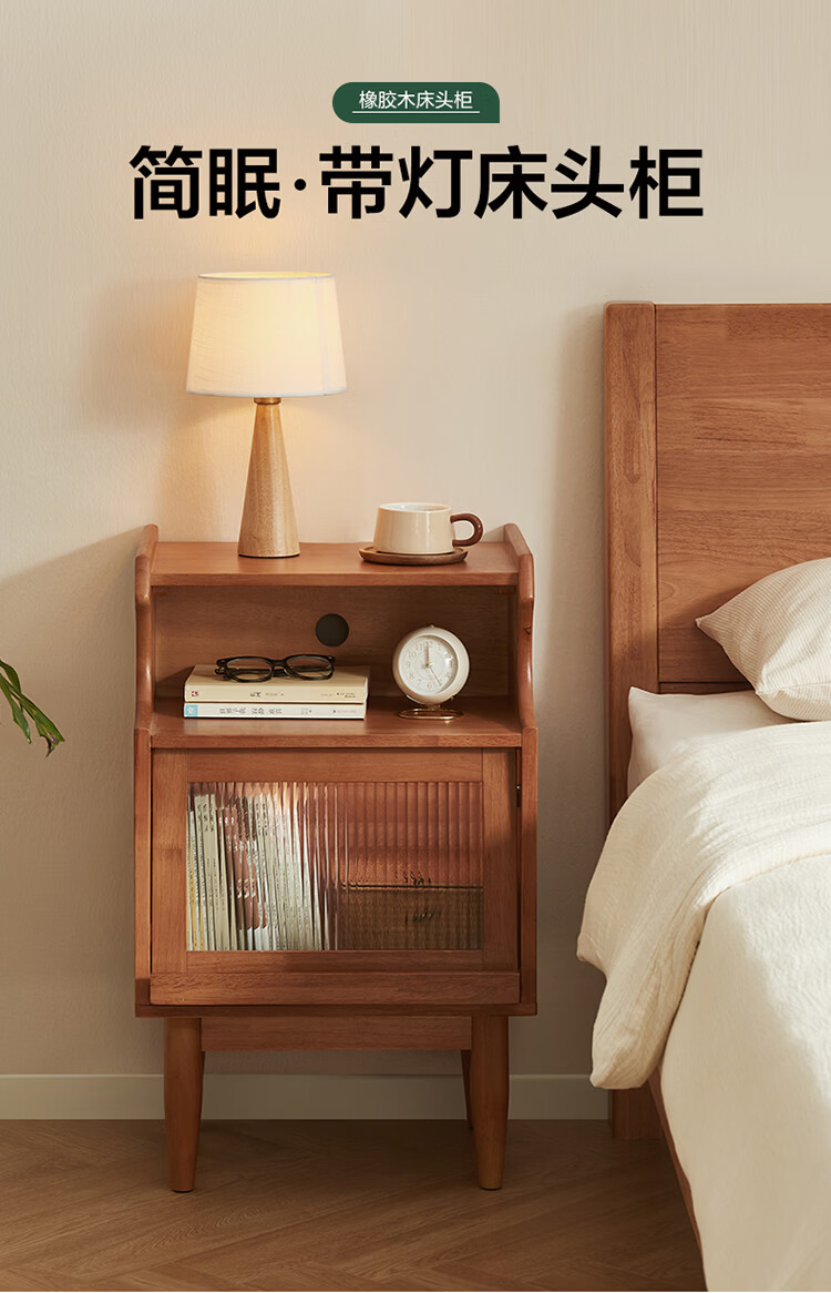 全友家居原木风卧室实木床头柜置物架新款小型收纳储物柜靠墙置物柜KS 【樱桃木色 | 橡胶木】带灯床头柜