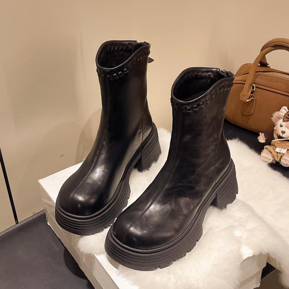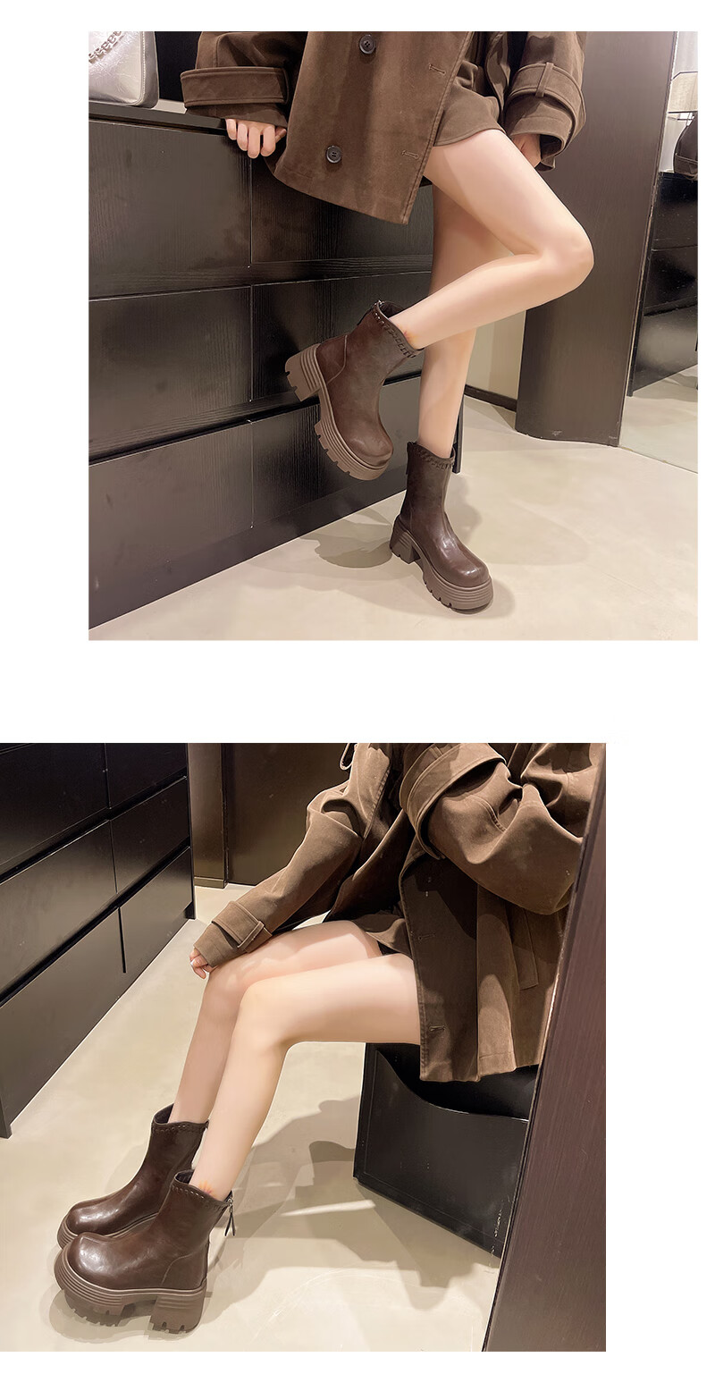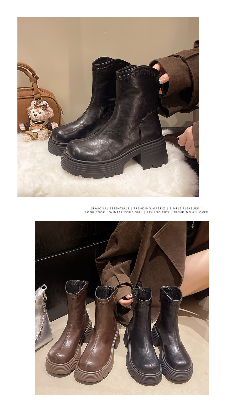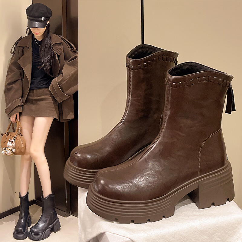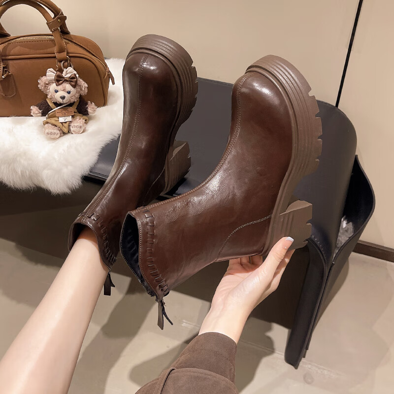 稻草人(MEXICAN)真皮厚底增高马丁靴女加绒2026年冬季新款后拉链时尚复古粗跟短靴 深棕色 加绒 38