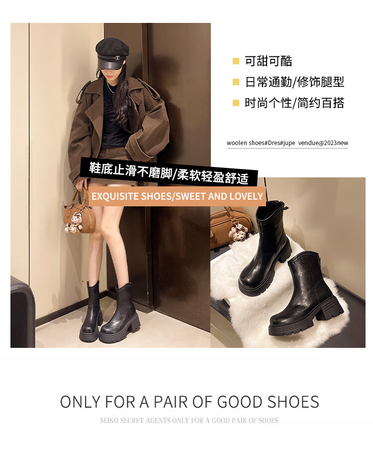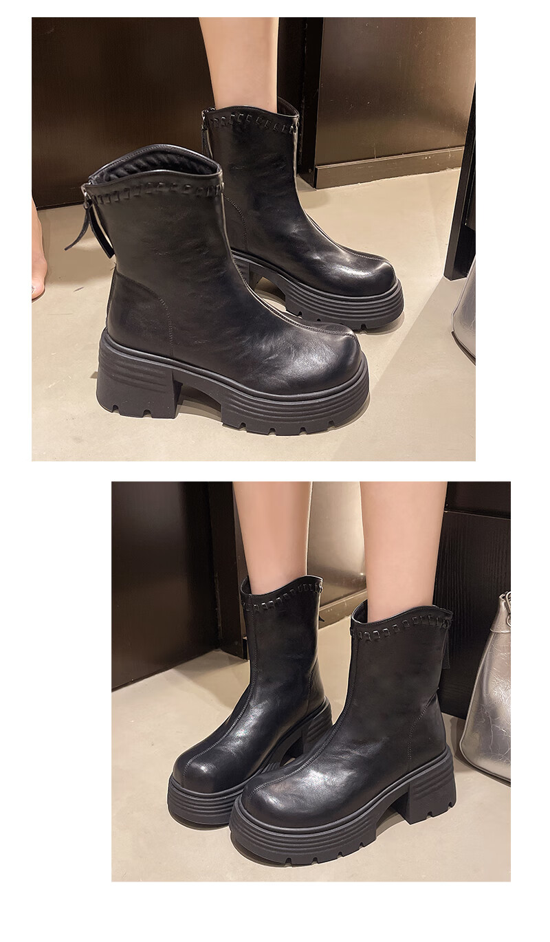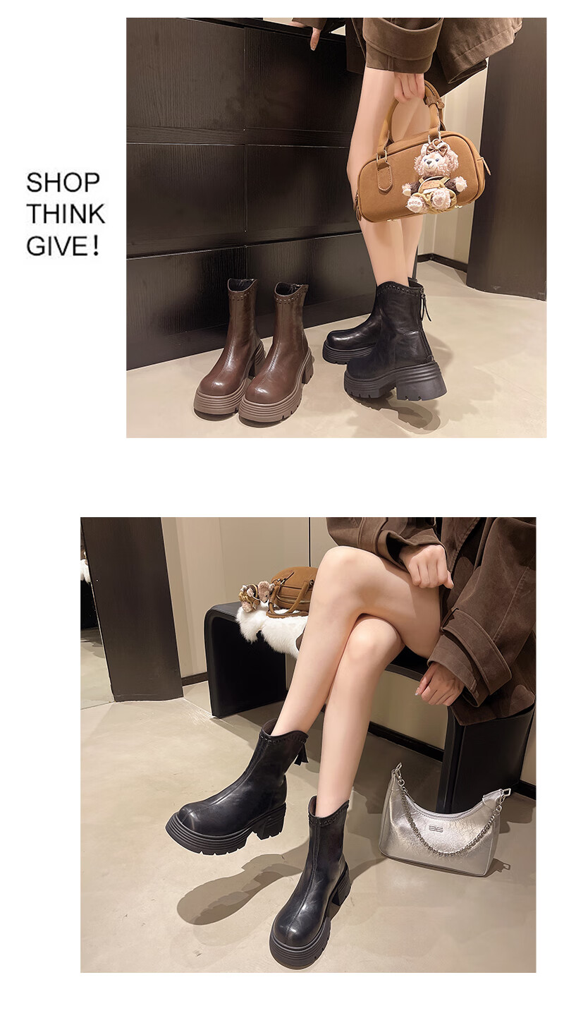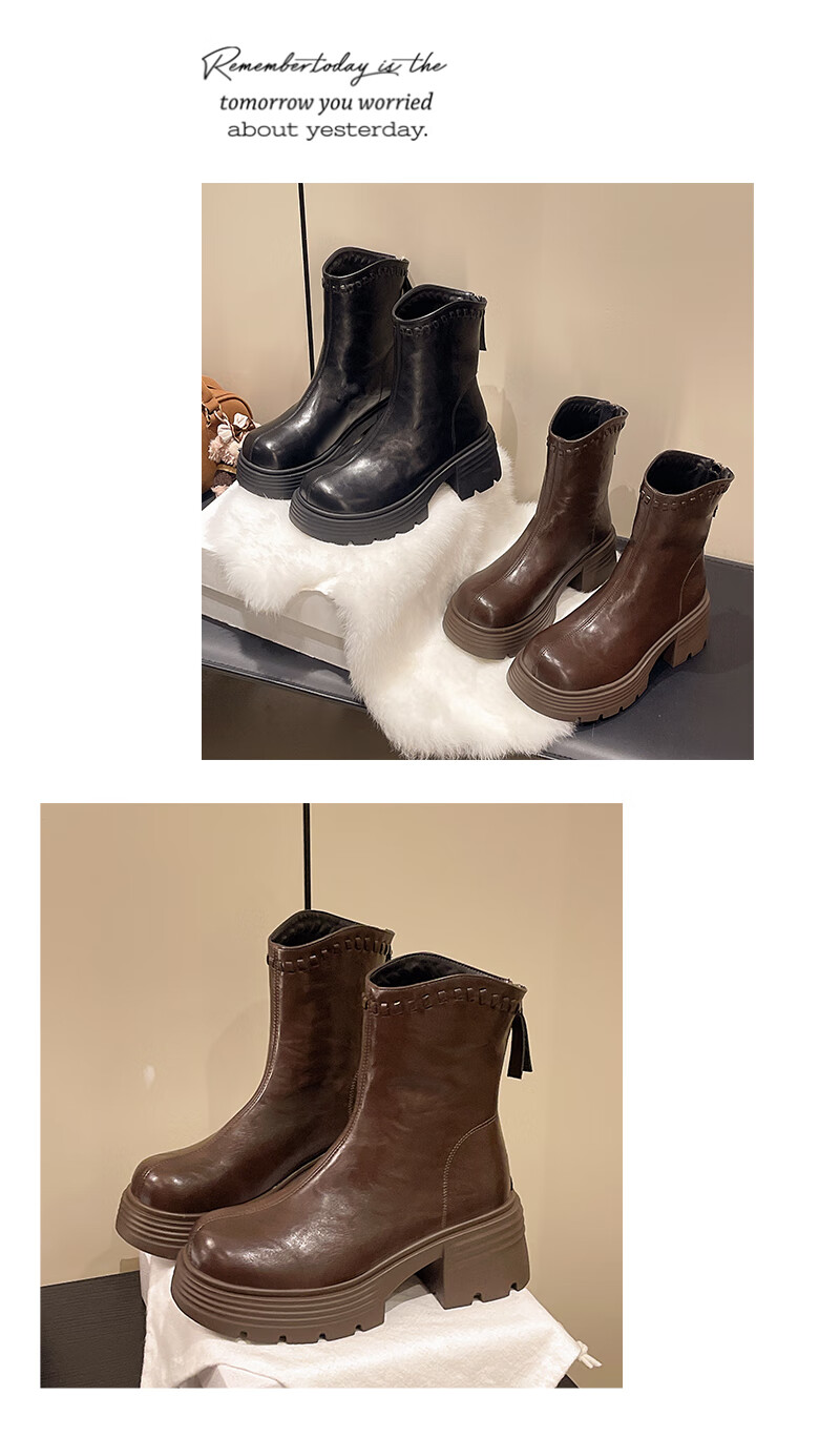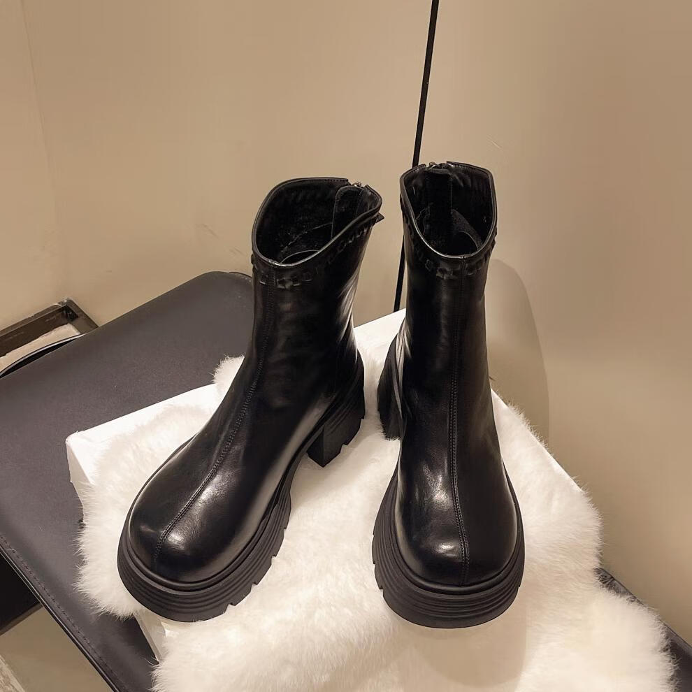稻草人(MEXICAN)真皮厚底增高马丁靴女加绒2026年冬季新款后拉链时尚复古粗跟短靴 深棕色 加绒 38