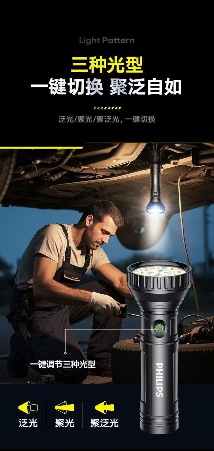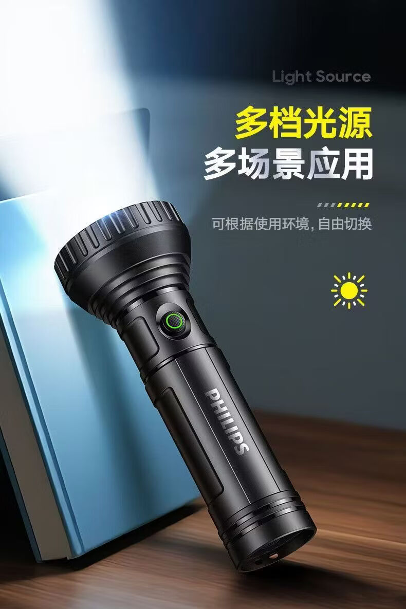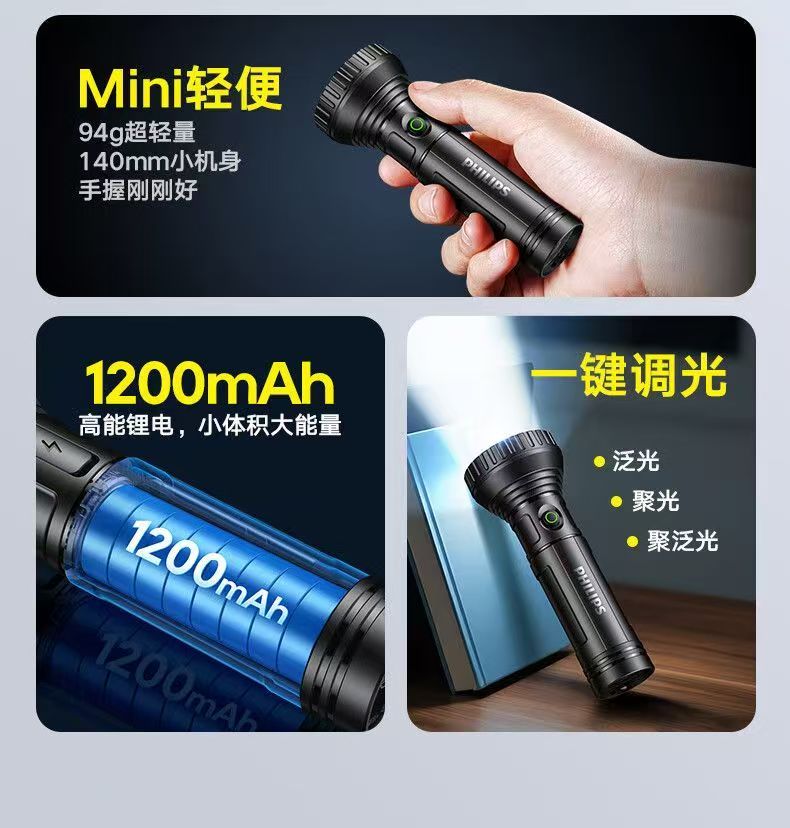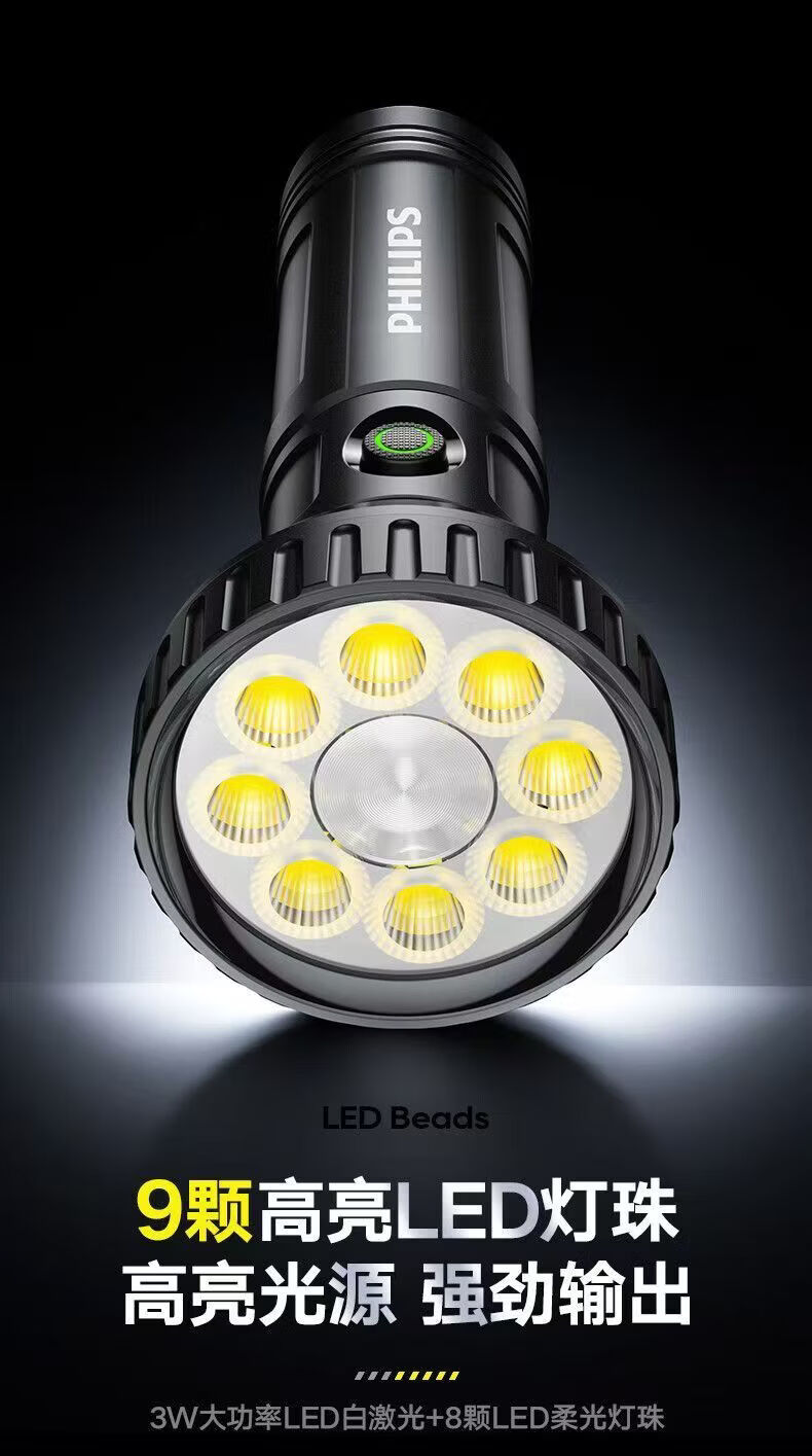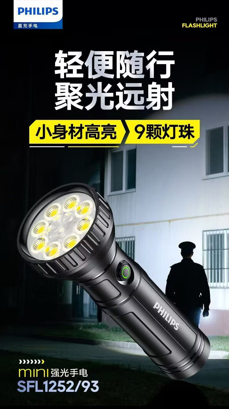 飞利浦(PHILIPS)手电强光高亮聚光远射九灯珠长续航充电户外应急灯SFL1252 3W/1200毫安/变焦/SFL1252