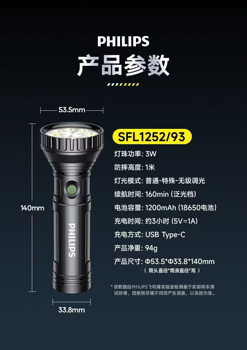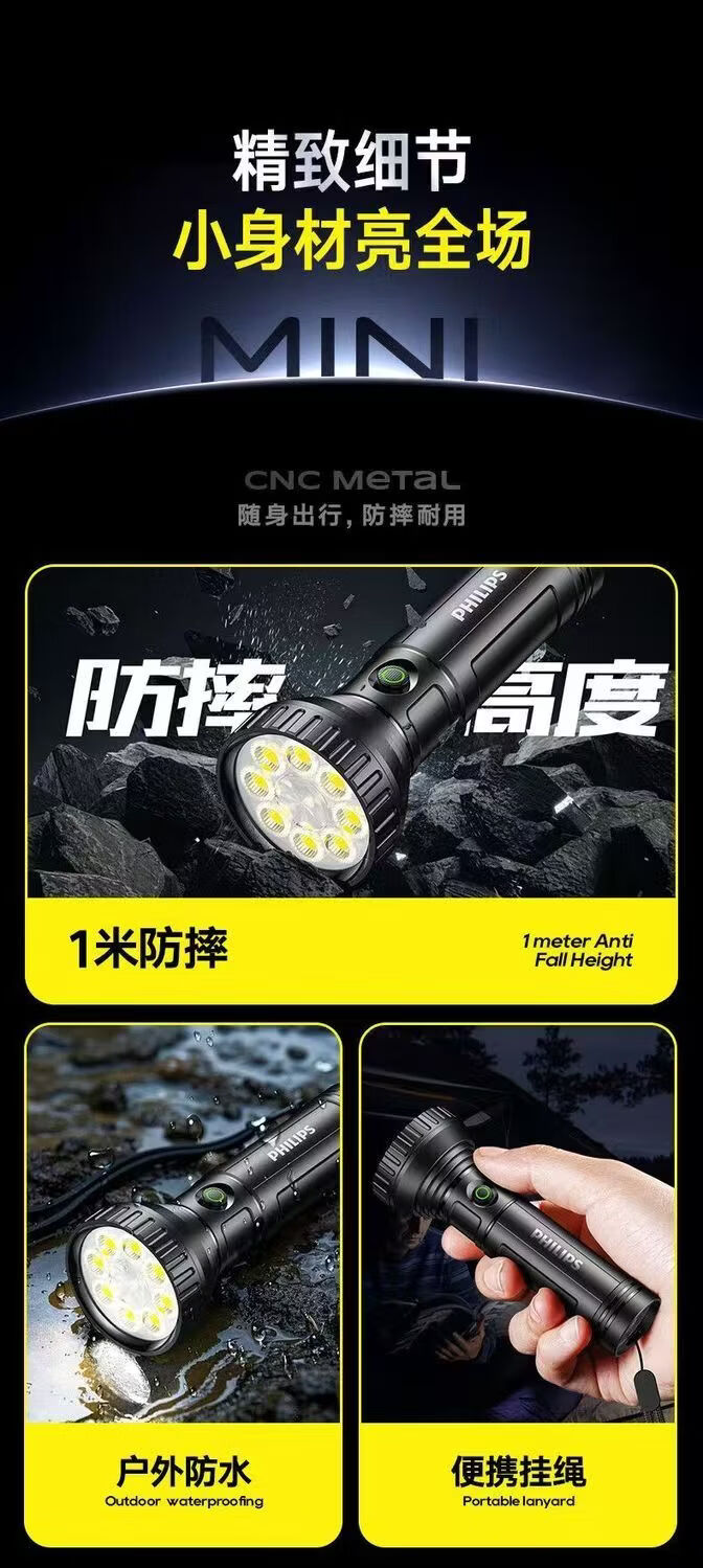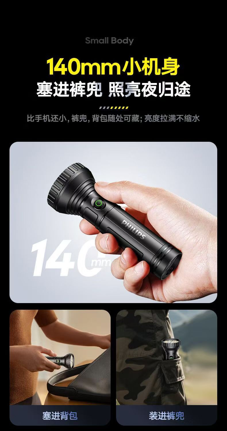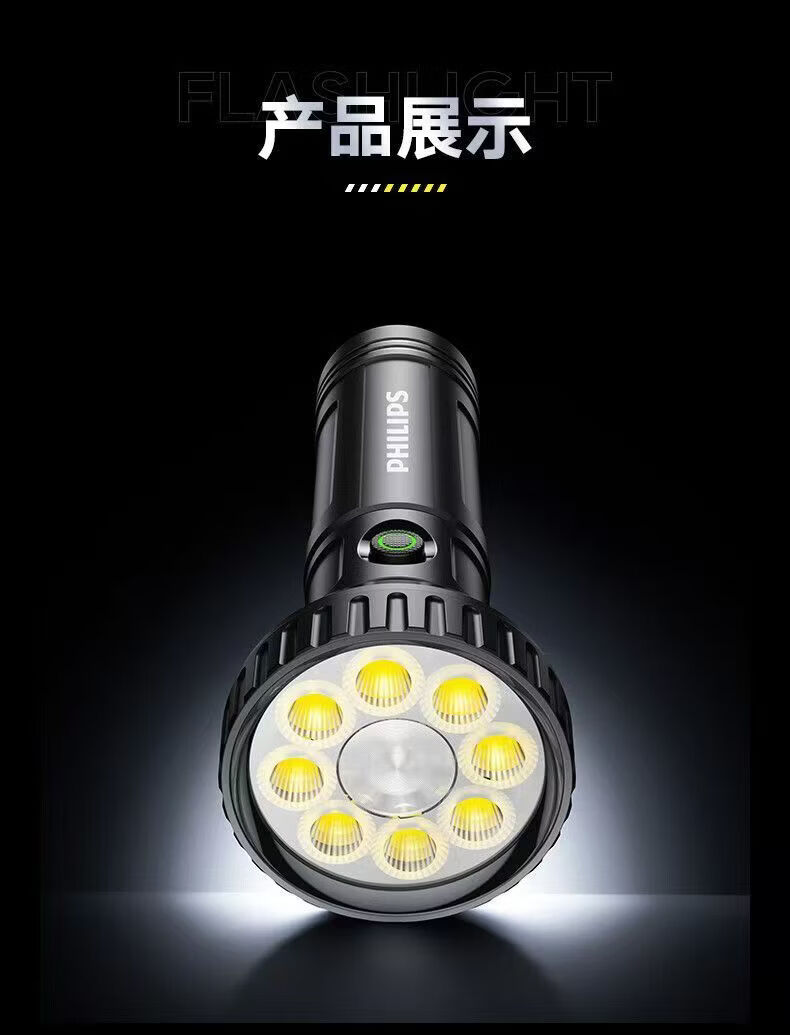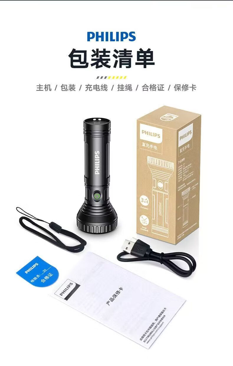 飞利浦(PHILIPS)手电强光高亮聚光远射九灯珠长续航充电户外应急灯SFL1252 3W/1200毫安/变焦/SFL1252