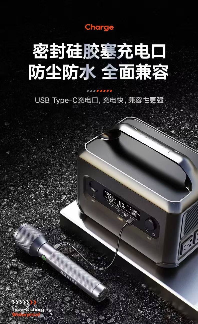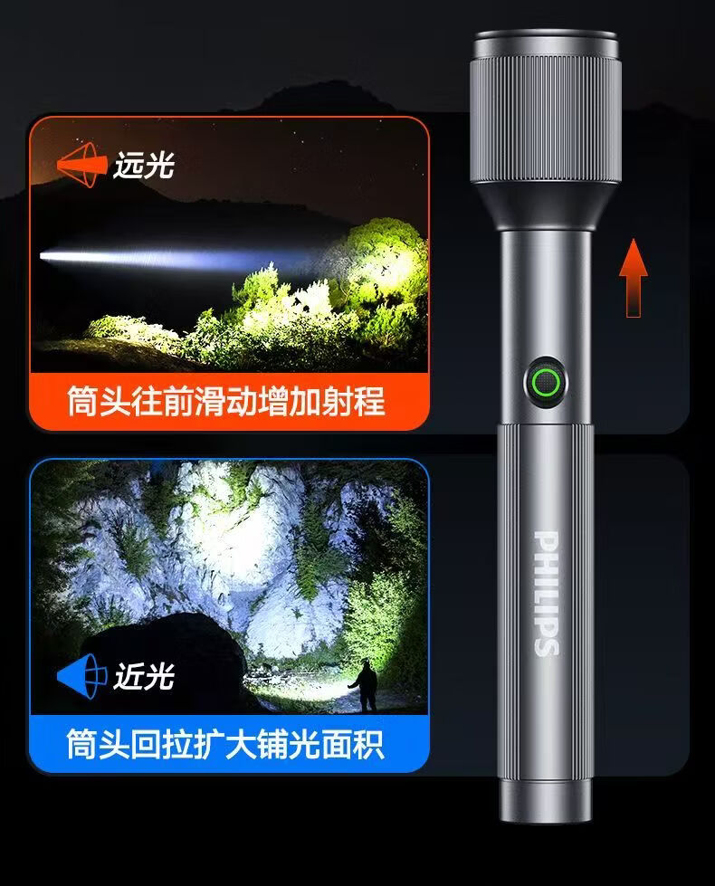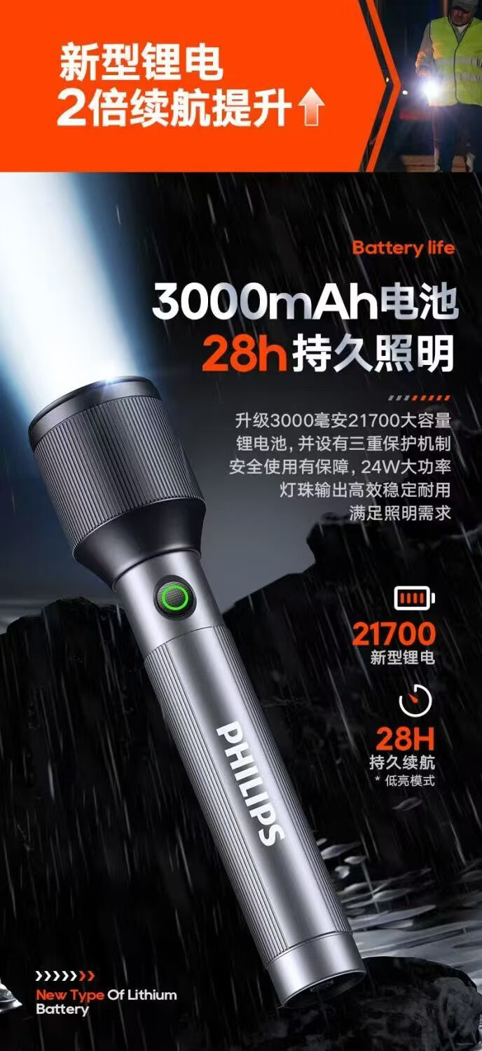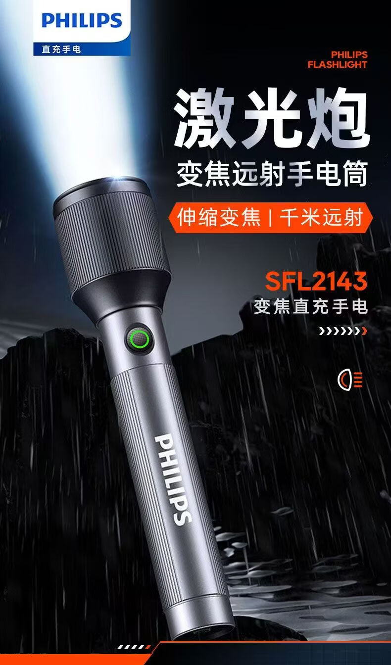 飞利浦(PHILIPS)强光手电筒可变焦远射超亮长续航户外大功率露营可充电便携SFL2143 24W/3000毫安/变焦/SFL2143