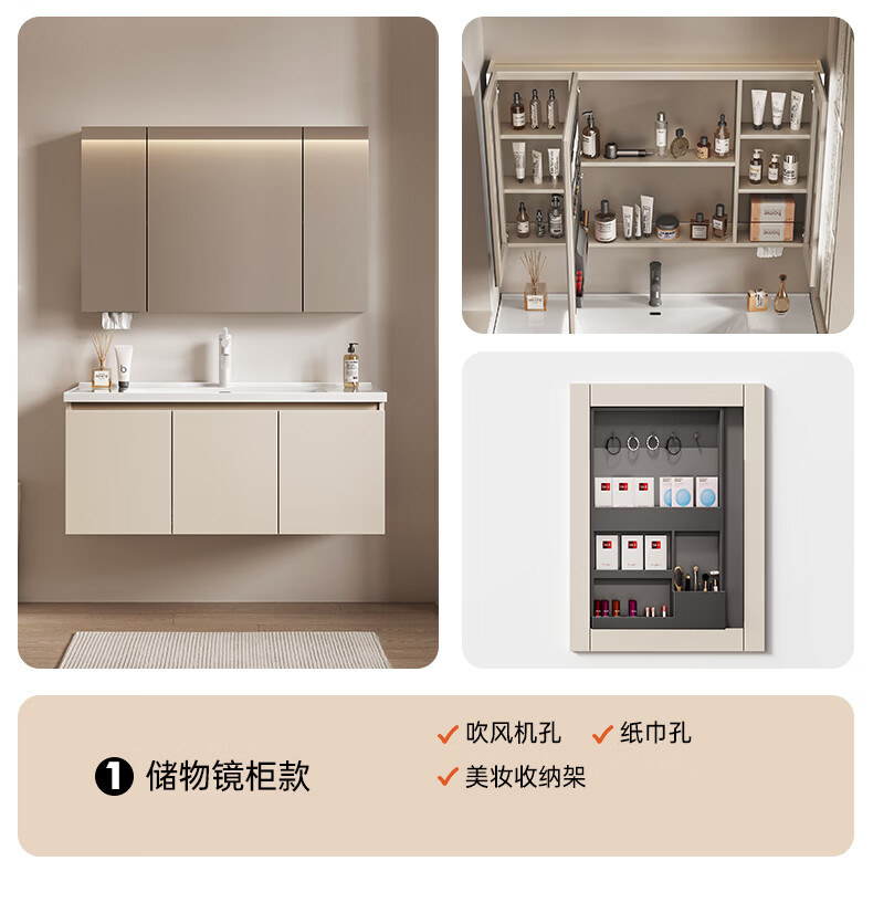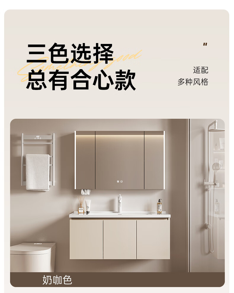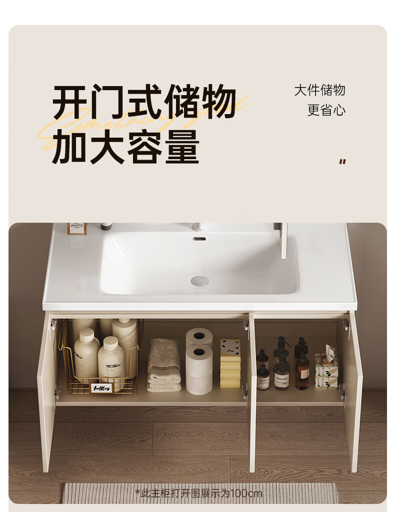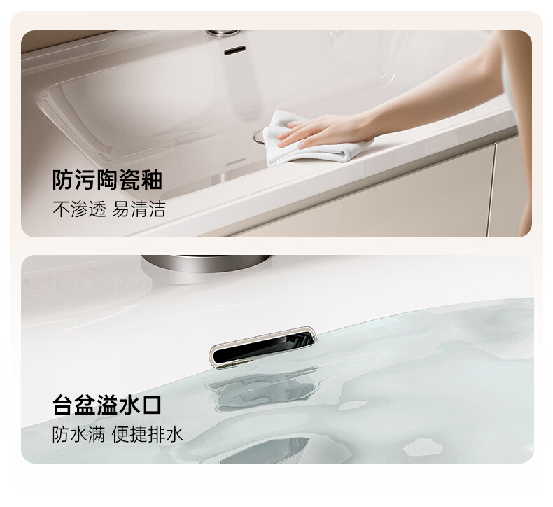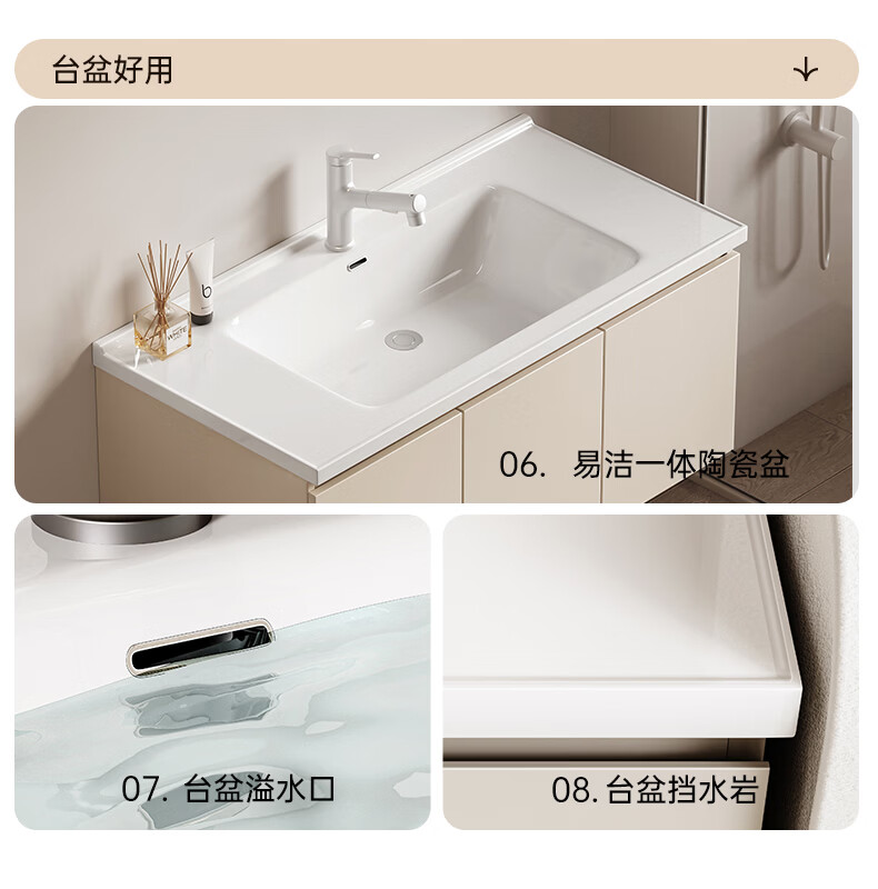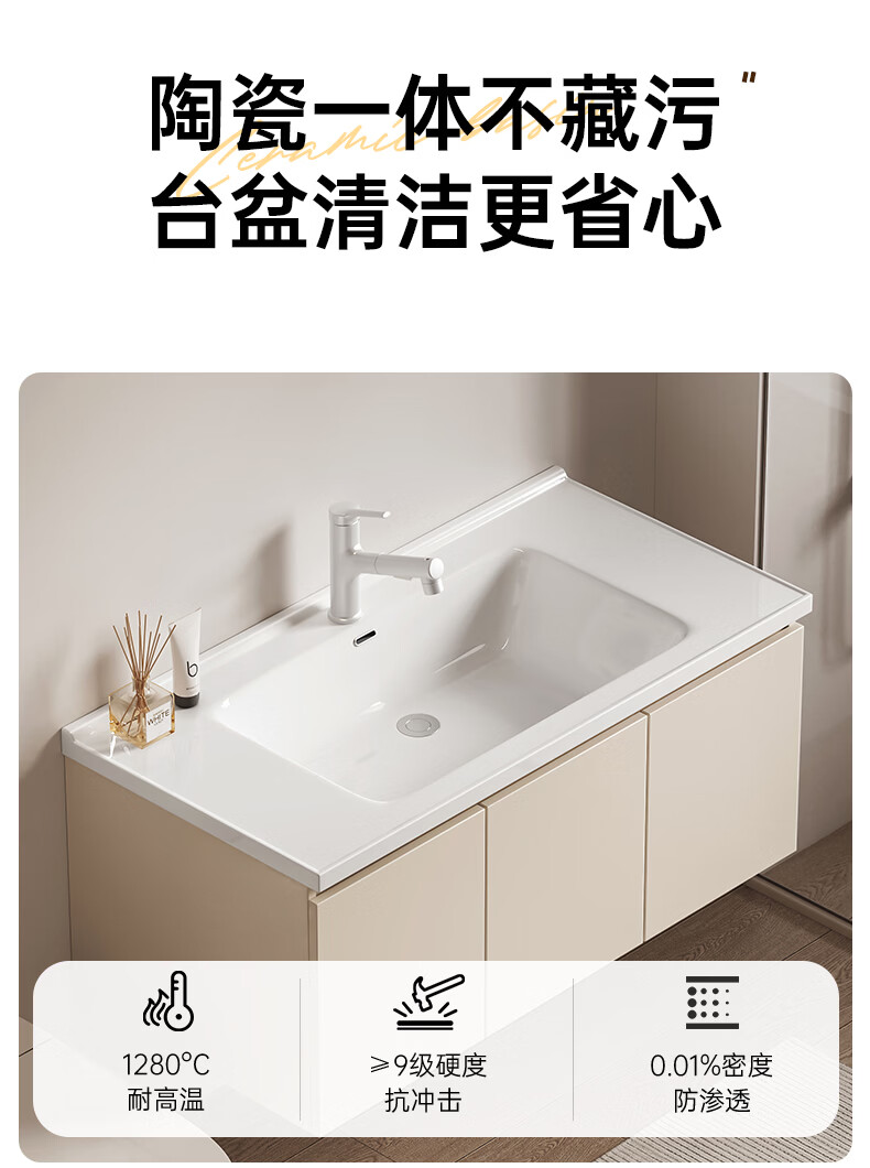 浪鲸(SSWW)浴室柜奶油风陶瓷一体盆小户型洗手盆柜组合卫生间洗漱台实木浴柜 奶油咖 80cm|美妆镜柜
